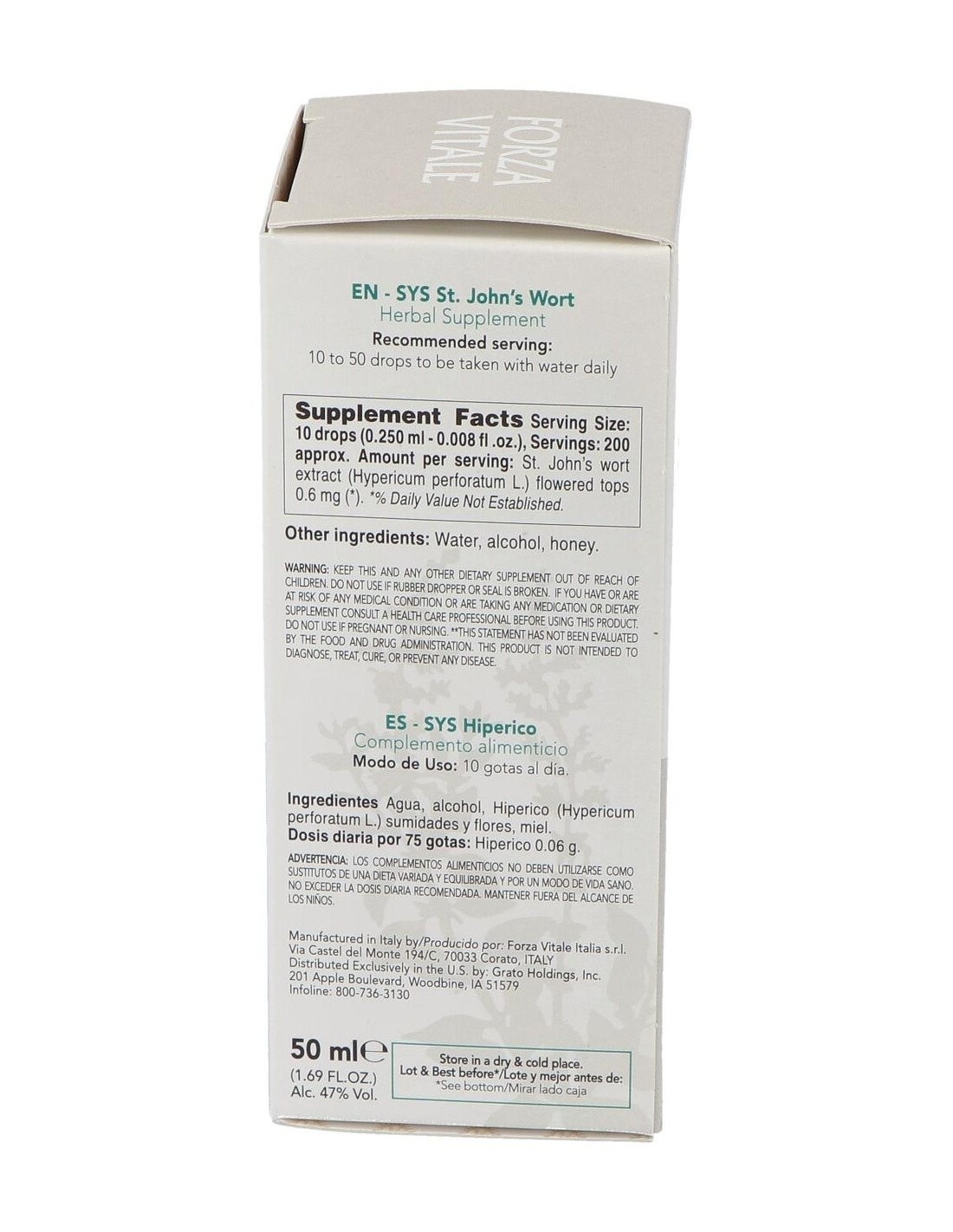 El Hipérico es una bonita planta de flores amarillo-oro, que privilegia las laderas soleadas y las secas praderas. Si se observan las hojas contra luz se notan innumerables puntos traslucidos, haciendo que las hojas aparezcan perforadas, de aquí perforatum. Ya en la antigüedad el verdadero hipérico estuvo empleándose contra muchas enfermedades. Hoy e día, es muy utilizado en muchas enfermedades que derivan de la psique y justamente por esto, el hipérico tiene un éxito tan grande en el climaterio, depresión (calmante), enuresis nocturna, agotamiento nervioso, menopausia. Tiene también efecto sanador sobre las heridas, es analgésico, calmante, neurotónico, energético, antiespásticos, además depura y refresca la sangre. Por lo tanto, el hipérico puede ser utilizado en trastornos psiconeurovegetativos sin causa orgánica e inquietud nerviosa. Contiene derivados naftodiantrónicos, entre los cuales hipericina y pseudohipericina dotada de acción inhibidora sobre las monoanminoxidasis A y B (MAO), responsables de la degradación de las catecolaminas y de la serotonina, flavonoides (iperosidas y rutosidas) responsables de las propiedades diuréticas y colecistocinéticas, floroglicinales (híperforina) antibióticos de notables eficacia, taninos y aceite esencial. PRECAUCIONES DE USO: Si se están tomando fármacos, antes de utilizar el producto consultar el parecer del médico, pudiendo el extracto de hipérico interferir sobre el metabolismo de estos, incluso inhibiendo su actividad. Ingredientes:Agua, Alcohol, Hipérico (Hypericum perforatum) sumidades floreste 2.5%, miel. Ingredientes activos por dosis diaria (0,25 ml):0,06 gramos de hipérico. Modo de empleo:Adultos: Tomar 10 gotas al día en poca agua o vía sublingual.Niños hasta 12 años: Tomar 5 gotas al día en poca agua o en zumo de fruta. Presentación:Frasco de 50 ml.