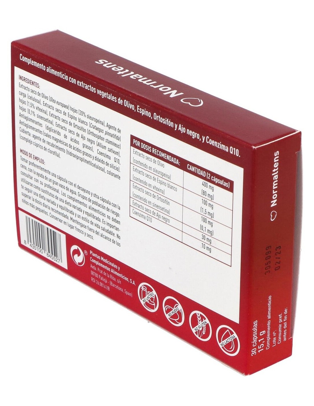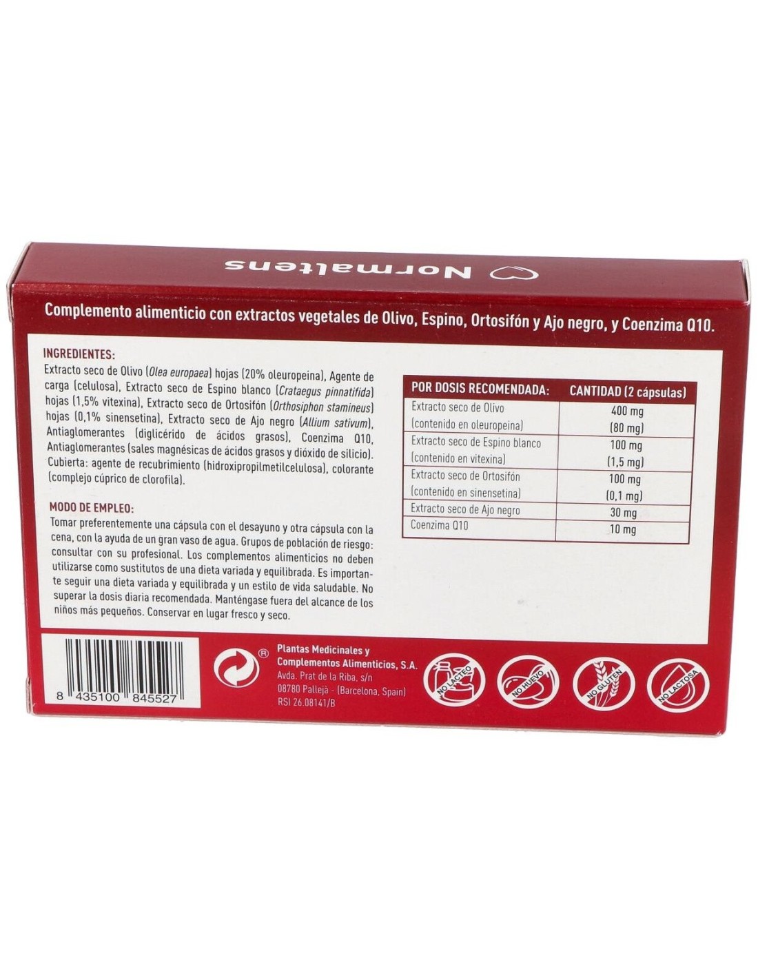 Extracto seco de Olivo (Olea europaea) hojas (20% oleuropeina), Agente de carga (celulosa), Extracto seco de Espino blanco (Crataegus pinnatifida) hojas (1,5% vitexina), Extracto seco de Ortosifón (Orthosiphon stamineus) hojas (0,1% sinensetina), Extracto seco de Ajo negro (Allium sativum), Antiaglomerantes (diglicérido de ácidos grasos), Coenzima Q10, Antiaglomerantes (sales magnésicas de ácidos grasos y dióxido de silicio). Cubierta: agente de recubrimiento (hidroxipropilmetilcelulosa), colorante (complejo cúprico de clorofila).