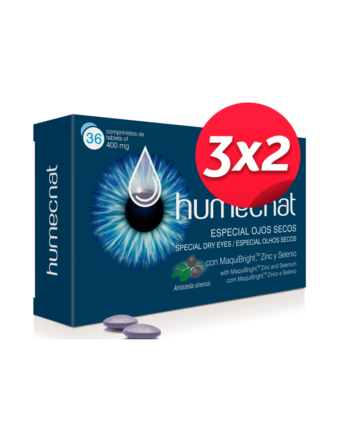 Complemento alimenticio con MaquiBrightTM (Aristotelia chilensis) y Zinc. Ayuda nutricional para los ojos. Especial ojos secos. El zinc contribuye al mantenimiento de la visión en condiciones normales.