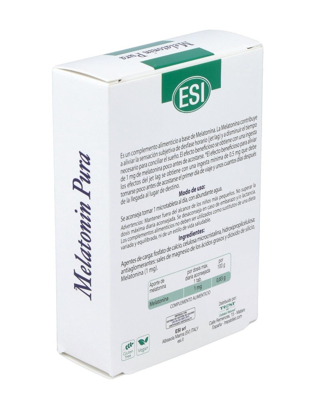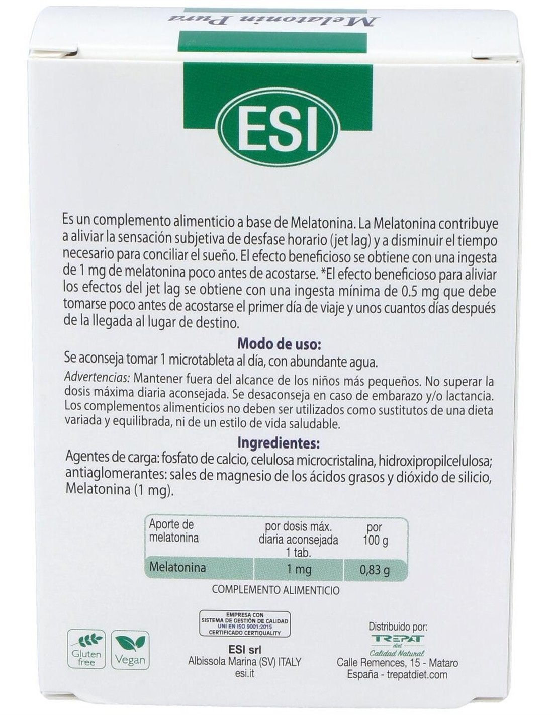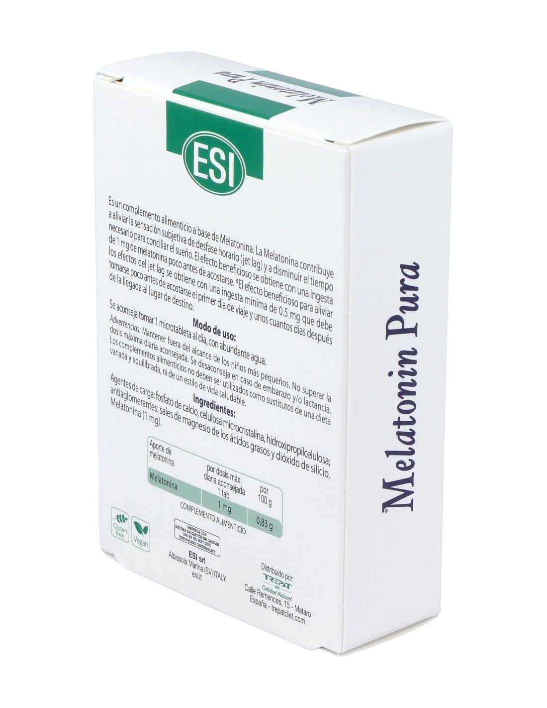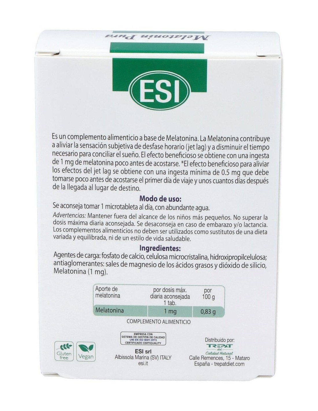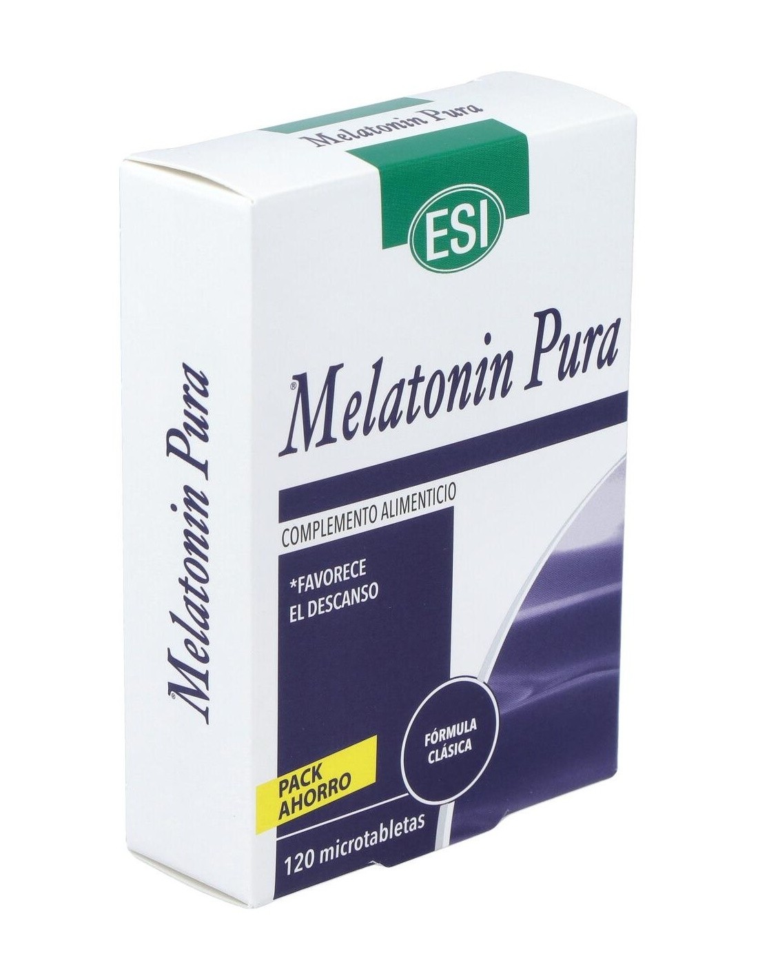 Uno de los remedios naturales, más conocidos actualmente, contra el insomnio es la melatonina, una hormona producida en la glándula pineal que se encarga, entre otras funciones, de regular el sueño. El paso de los años, el estrés y la ansiedad producida por el trabajo y la familia, una mala alimentación y los desajustes en los horarios del sueño hacen disminuir los niveles de melatonina en nuestro organismo. Cuando esto sucede nuestro reloj biológico se desajusta y aparece una importante dificultad para conciliar el sueño, haciendo que las horas de sueño sean inferiores, entrecortadas y de baja calidad. Para prevenir y/o evitar estos desajustes y conseguir un sueño reparador en nuestro herbolario te aconsejamos incluir una dosis de 1 mg de melatonina pura una hora antes de acostarte. Esta dosis es suficiente para inducir al sueño de forma natural y que éste sea más duradero y de mayor calidad, poniendo remedio al insomnio ocasional y sus consecuencias de una forma sencilla y eficaz. También es muy útil para aquellas personas que trabajan a turnos y ven modificados semanalmente sus horarios de sueño. Otro caso en el que la Melatonina Pura de ESI es increíblemente eficaz es en el proceso de adaptación del organismo a diferentes usos horarios (jet-lag).Composición activa por comprimido:1 mg de melatonina pura. Ingredientes:Agentes de carga: fosfato de calcio, celulosa microcristalina, hidroxipropilcelulosa; antiaglomerantes: sales de magnesio de los ácidos grasos y dióxido de silicio, Melatonina (1 mg).Modo de empleo:Se recomienda tomar 1 microtableta al día con abundante agua 1 hora antes de acostarse. Presentación:Envase de 120 microtabletas.