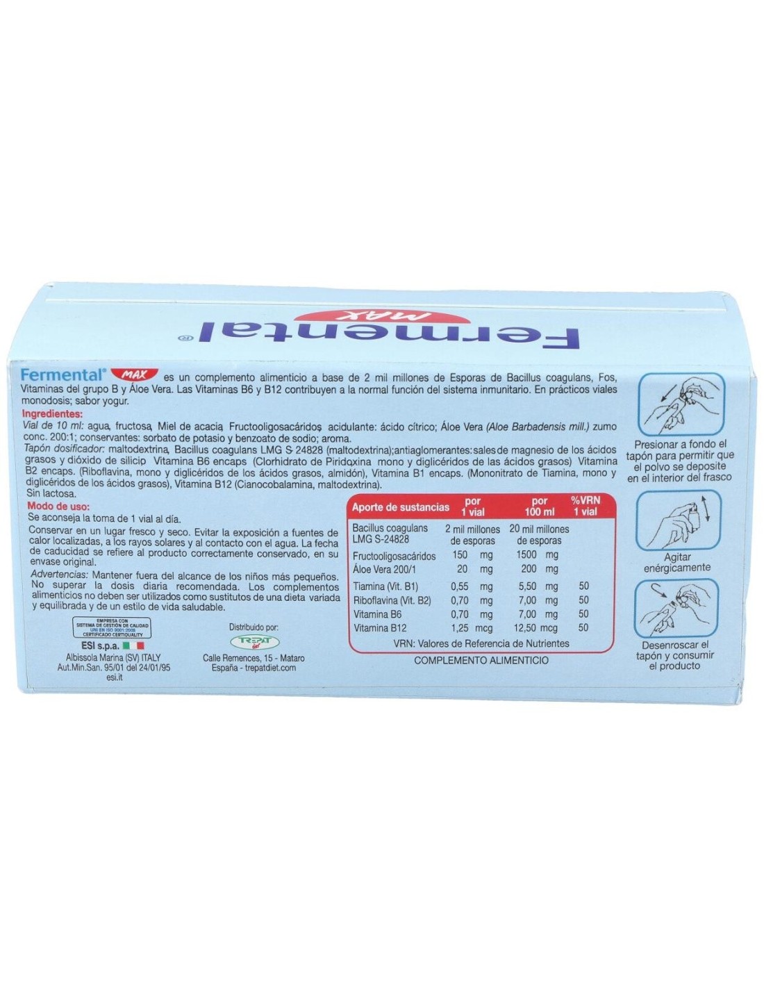 Fermental Max es un producto simbiótico (prebiótico + probiótico) indicado para regenerar y mantener la funcionalidad de la ora intestinal, evitando así una situación de disbiosis.