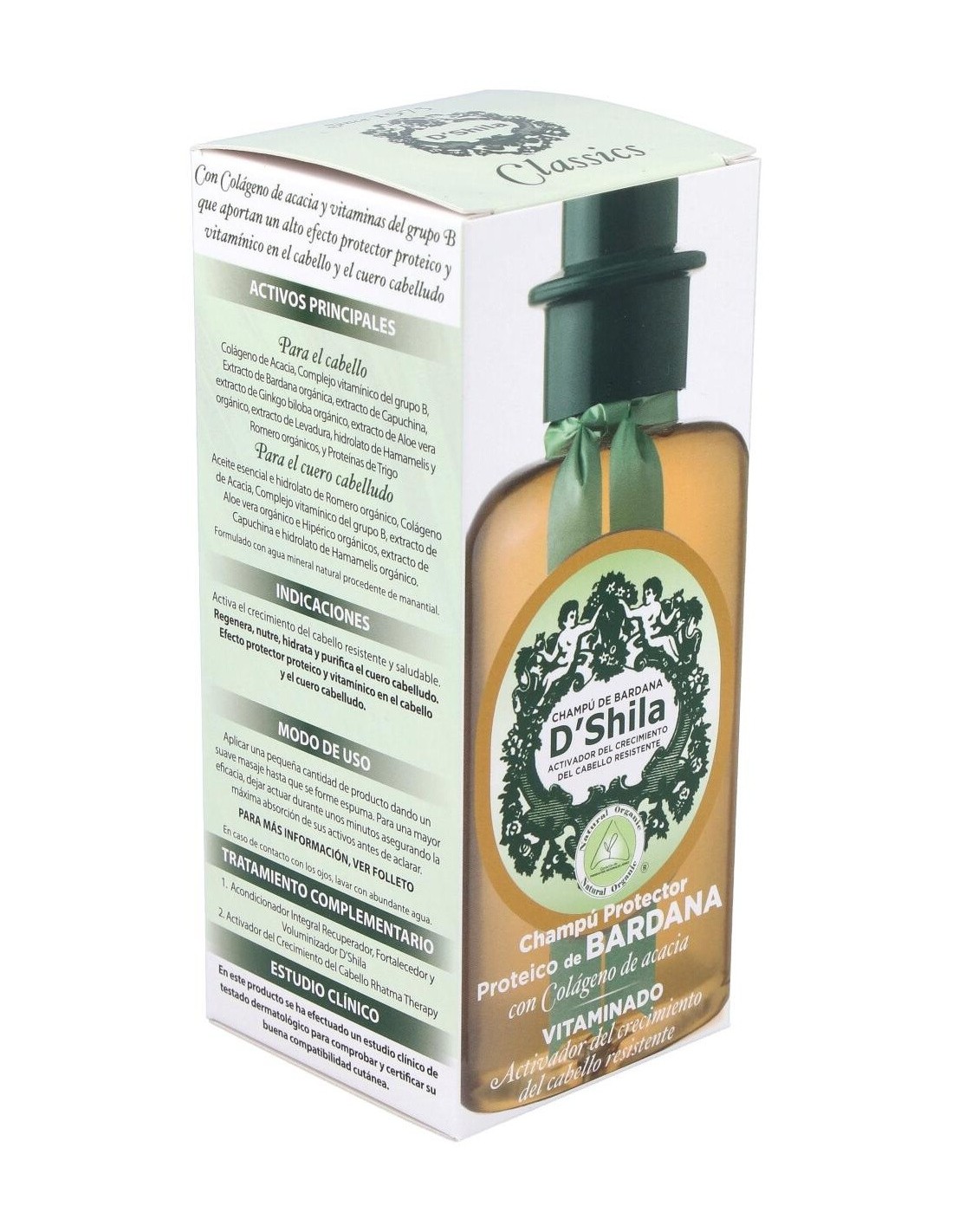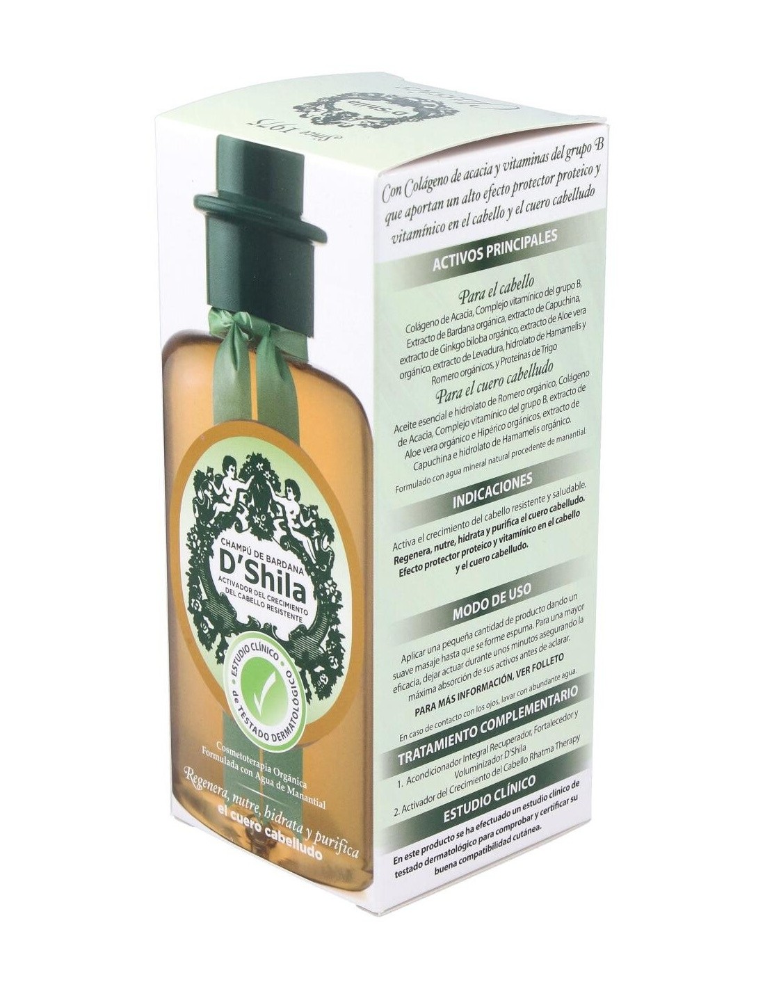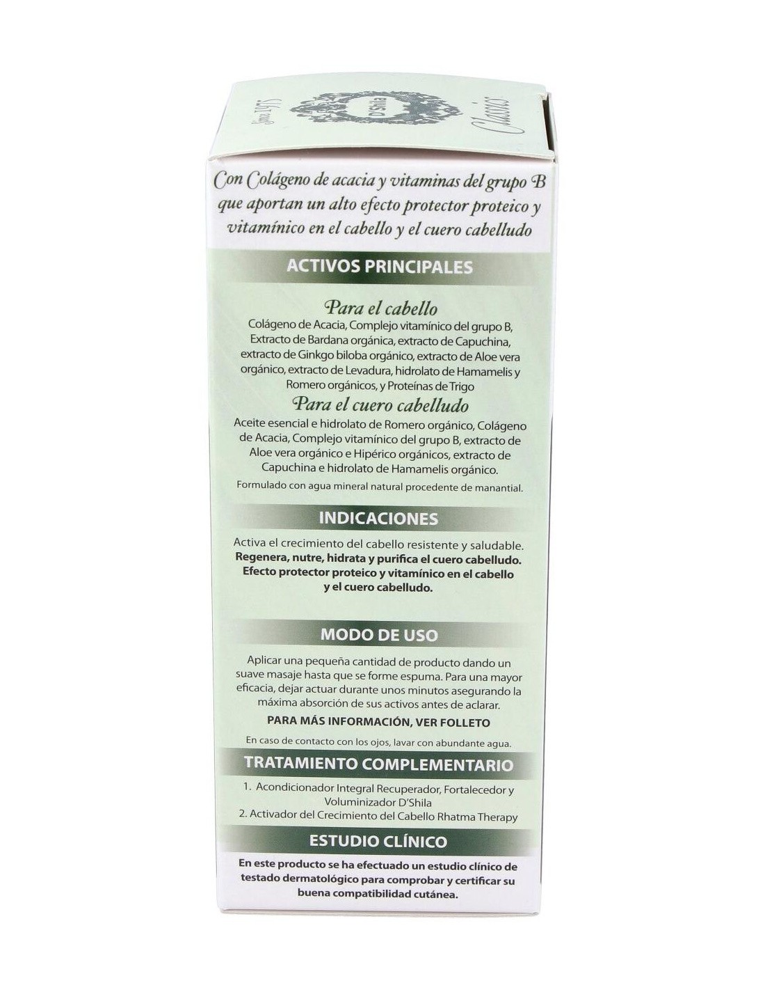 Para el cuero cabelludo: Aceite esencial e hidrolato de Romero orgánico, Colágeno de acacia, Complejo vitamnico del grupo B, extracto de Aloe vera orgánico e Hipérico orgánicos, extracto de Capuchina e hidrolato de Hamamelis orgánico.