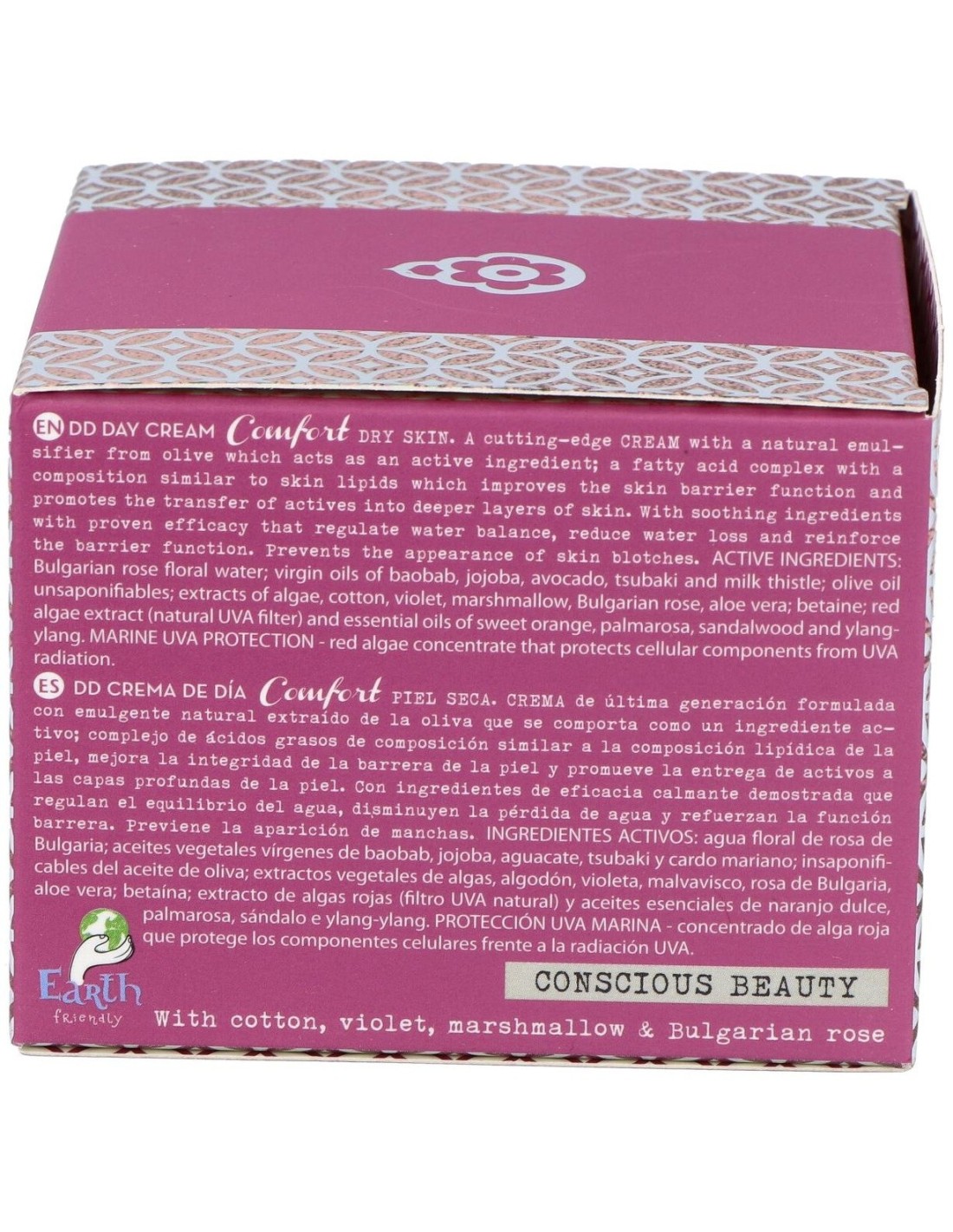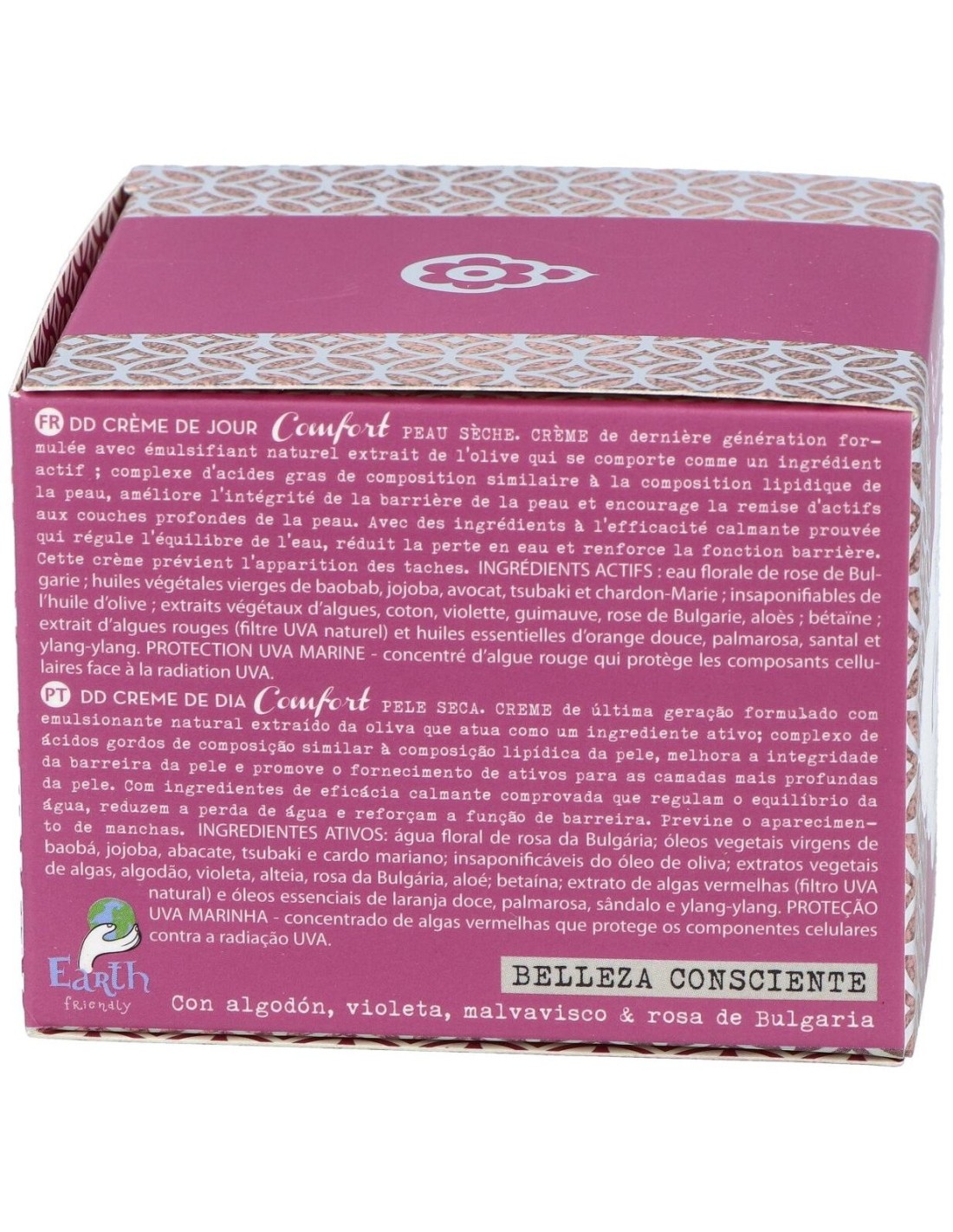 El concepto DD se atribuye a la propiedad de aumentar la capacidad defensiva de la piel, a través de la absorción de principios activos vegetales que potencian la cohesión celular y refuerzan la función barrera a través de un efecto protector del estrés oxidativo, efecto antiarrugas y protección antimanchas.Las crema DD de última generación están formuladas con un emulsionante natural extraído de la oliva, insaponificables del aceite de oliva, aceite de tsubaki o camelia japónica, betaína de acción antimanchas y protección natural UVA-Marina, procedente de algas rojas.DD Crema Comfort incluye en su composición extractos de algodón, violeta, malvavisco, aloe vera, así como los aceites esenciales de: sándalo, palma-rosa e ylang-ylang y aceites vegetales de baobab, jojoba y aguacate. Activos que proporcionan, antioxidantes, sustancias emolientes y contribuyen a aumentar el nivel de hidratación y protección de la piel seca.Ingredientes (INCI):Aqua, Rosa Damascena Flower Water*, Glycerin, Olea Europaea (Olive) Oil Unsaponifiables, Cetyl Palmitate, Coco-Caprylate/Caprate, Olus (Vegetable) Oil*, Silybum Marianum Seed Oil, Glyceryl Stearate, Cetearyl Olivate, Sorbitan Olivate, Camellia Japonica Seed Oil, Oryza Sativa (Rice) Starch, Betaine, Prunus Armeniaca (Apricot) Kernel Oil*, Hydrogenated Ethylhexyl Olivate, Parfum, Porphyra Umbilicalis Extract, Benzyl Alcohol, Sorbitan Palmitate, Persea Gratissima (Avocado) Oil*, Simmondsia Chinensis (Jojoba) Seed Oil*, Adansonia Digitata Seed Oil*, Xanthan Gum, Algae Extract, Salicylic Acid, Hydrogenated Olive Oil Unsaponifiables, Biosaccharide Gum-1, Helianthus Annuus (Sunflower) Seed Oil, Tocopherol, Aloe Barbadensis Leaf Extract*, Althaea Officinalis Leaf Extract*, Gossypium Herbaceum (Cotton) Extract*, Urtica Dioica Extract*, Viola Odorata Extract*, Sodium Benzoate, Citric Acid, Tilia Tomentosa Bud Extract*, Sodium Levulinate, Sorbic Acid, Glyceryl Caprylate, Potassium Sorbate, Sodium Anisate, Phytic Acid, Limonene**, Linalool**, Benzyl Salicylate**, Geraniol**, Benzyl Benzoate**, Farnesol**, Citronellol**, Citral**. (*) Ingredientes procedentes de la Agricultura Ecológica.Modo de empleo:Realiza la limpieza de la piel con tu CleanTonic adecuado a tu tipo de piel. Después aplica la DD Crema Comfor extendiendo el producto hasta su total absorción.Presentación:Envase de 50 ml.