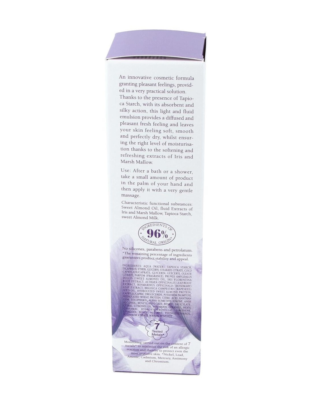 INCI: Aqua (Water), Tapioca starch, Dicaprylyl ether, Glyceryl stearate citrate, Coco caprylate/caprate, Glycerin, Glyceryl oleate citrate, Parfum (Fragrance), Prunus amygdalus dulcis (Sweet almond) oil , Iris florentina root extract, Althaea officinalis leaf/root extract, Rosmarinus officinalis (Rosemary) leaf extract, Brassica campestris (Rapeseed) seed oil, Hydrolyzed sweet almond protein, Caprylic/capric triglyceride, Potassium palmitoyl hydrolyzed wheat protein, Citric acid, Xanthan gum, Alpha isomethyl ionone, Anise alcohol, Benzyl benzoate, Benzyl salicylate, Citral, Citronellol, Coumarin, Geraniol, Hexyl cinnamal, Hydroxycitronellal, Limonene, Linalool, Benzyl alcohol, Potassium sorbate, Sodium benzoate.