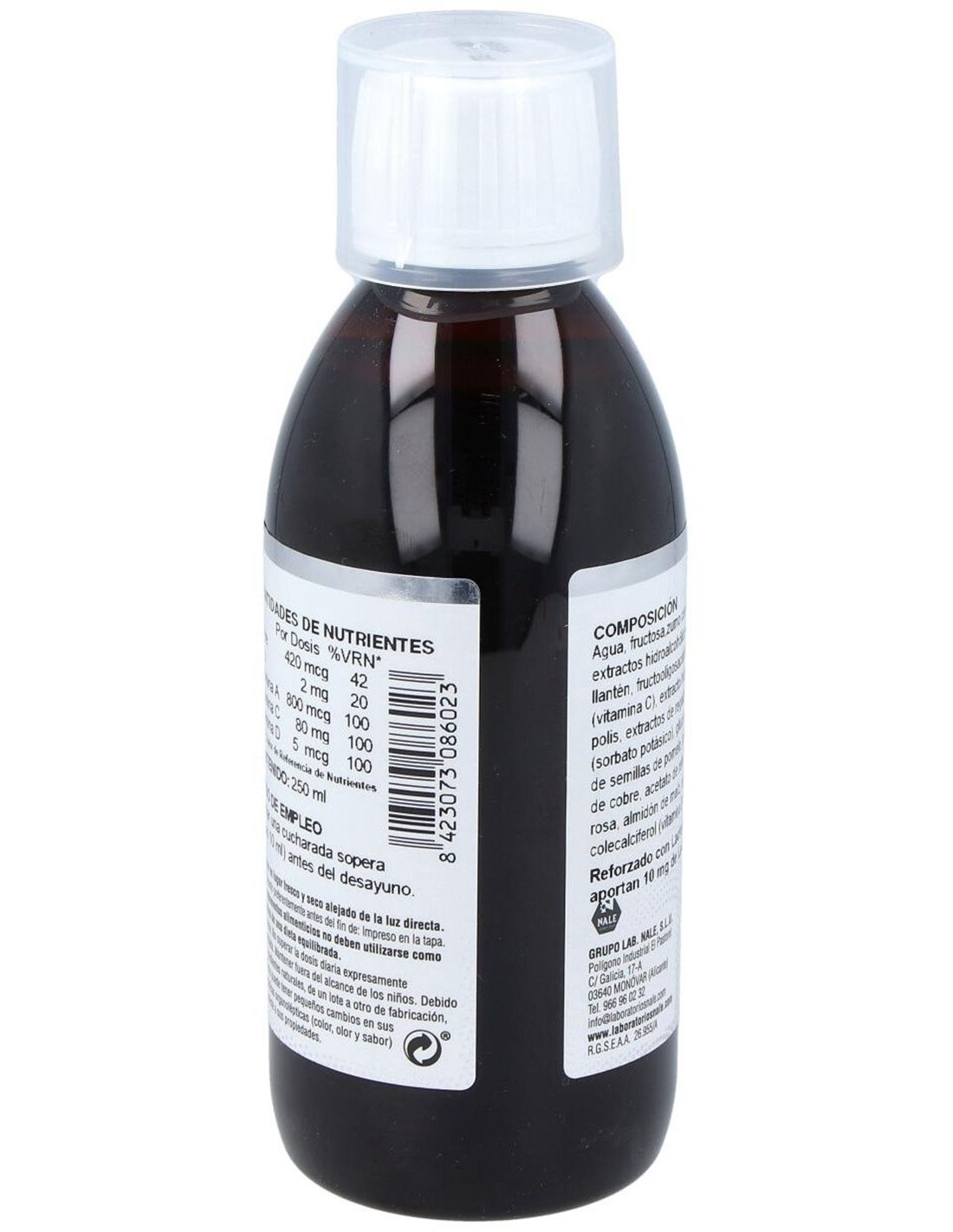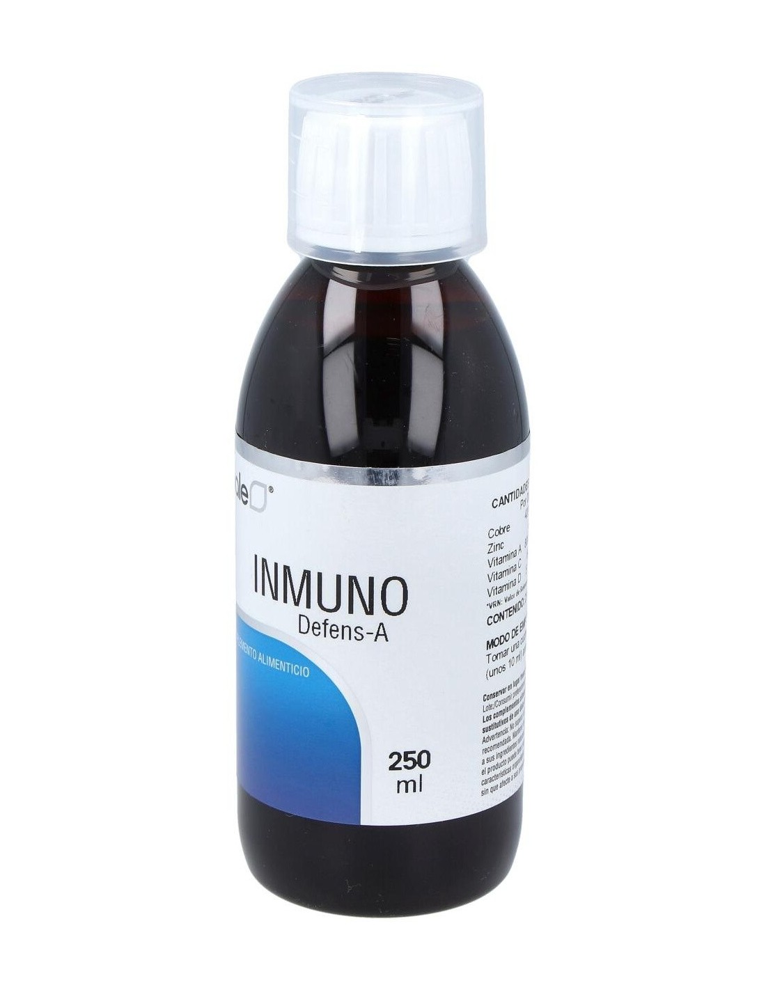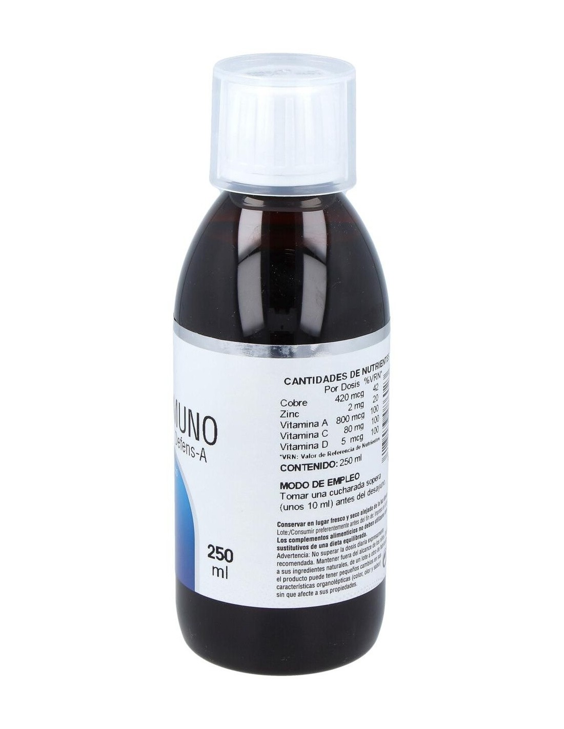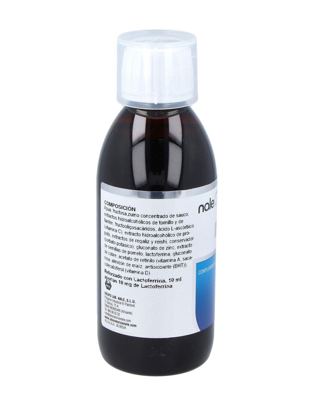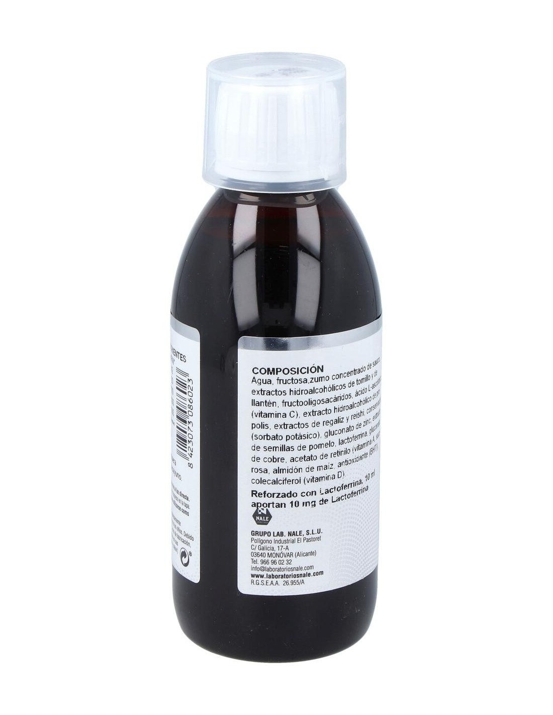 Agua: Xilitol: Concentrado de Saúco: Ext. Seco de Tomillo: Extracto de Llantén: Fructooligosacáridos: Vitamina C (AcL-Ascorbico): Gluconato de Zinc: L-Cisteina: Ext. Seco de Regaliz: Ext. Seco de Propóleo: Gluconato de Cobre: Ext. Seco de Reishi: Lactoferrina: Conservador (Sorbato potásico): Vitamina A (Palmitato de retinilo): Ext. Seco de Pomelo: Vitamina D (Colecalciferol): Acidulante (Ac. Cítrico).