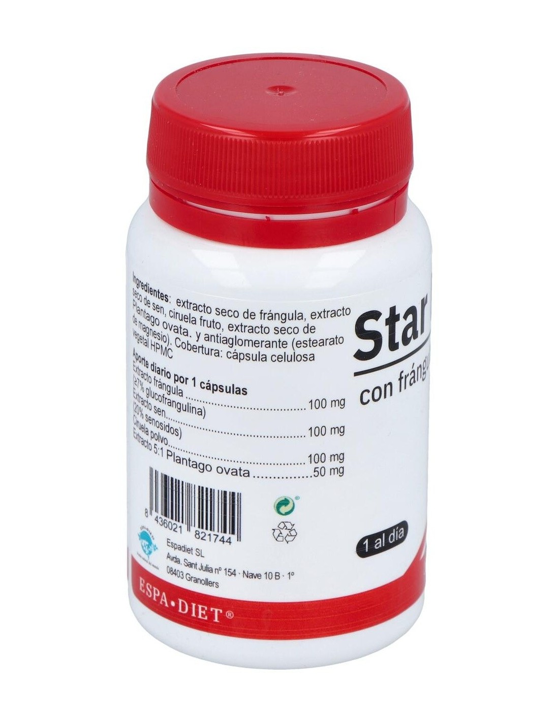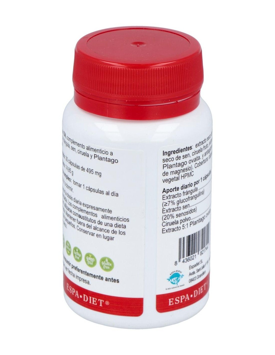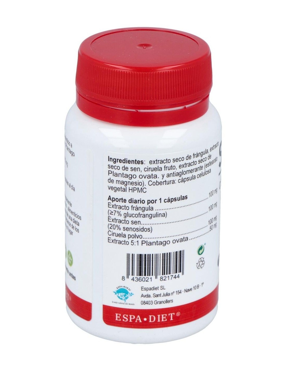Extracto concentrado de frángula, extracto concentrado de sen, ciruela fruto, extracto concentrado de Plantago ovata y antiaglomerante (estearato de magnesio). Cobertura: cápsula celulosa vegetal HPMC.