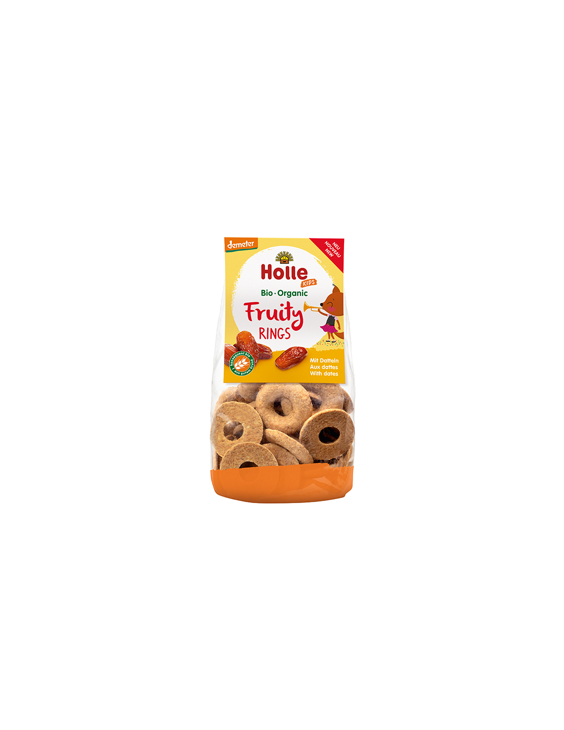 Deliciosa galleta de frutas Demeter con dátiles y harina integral de espelta con simpática forma de arito para pequeños y mayores. Ideal para tomar entre comidas. A partir de 3 años.