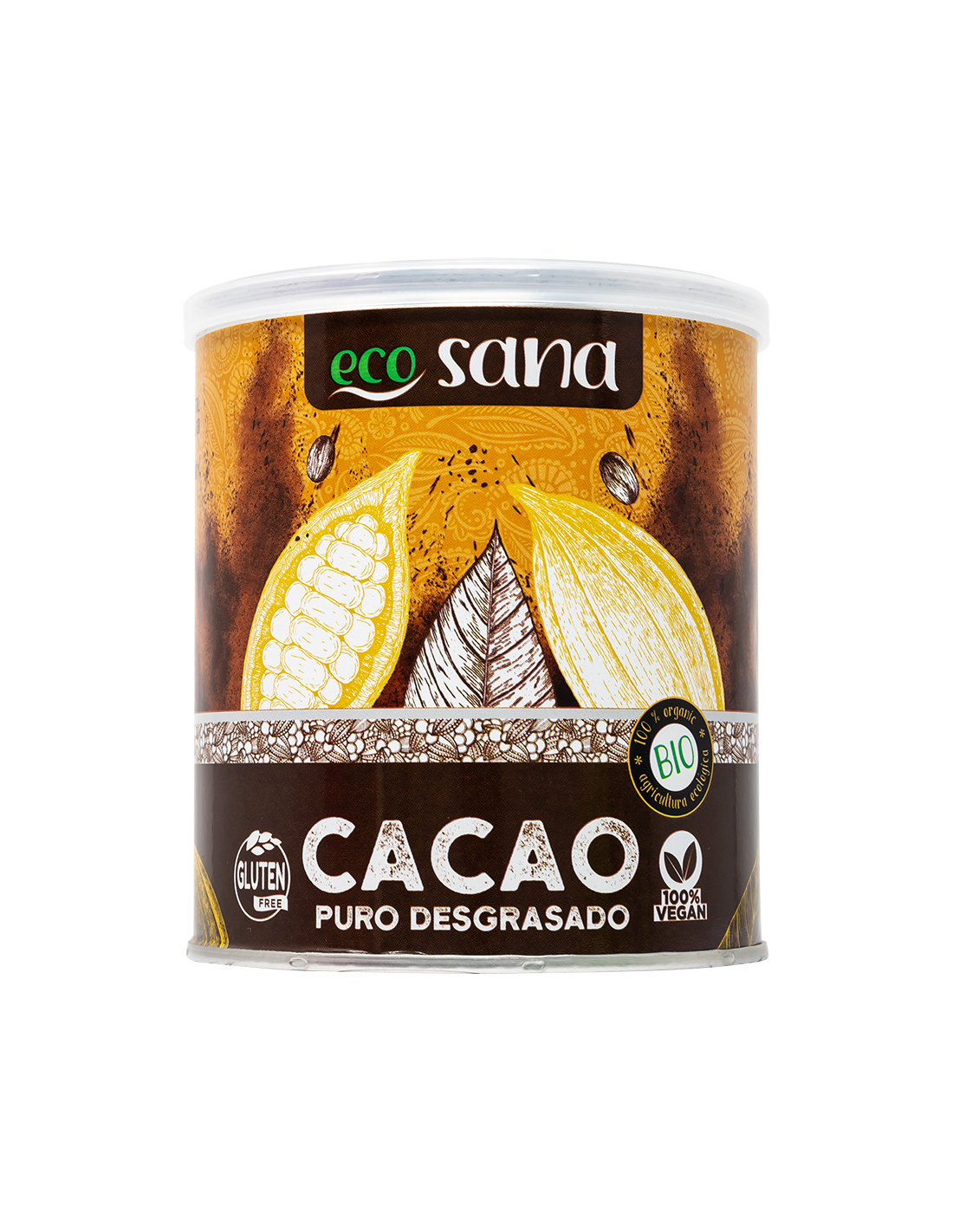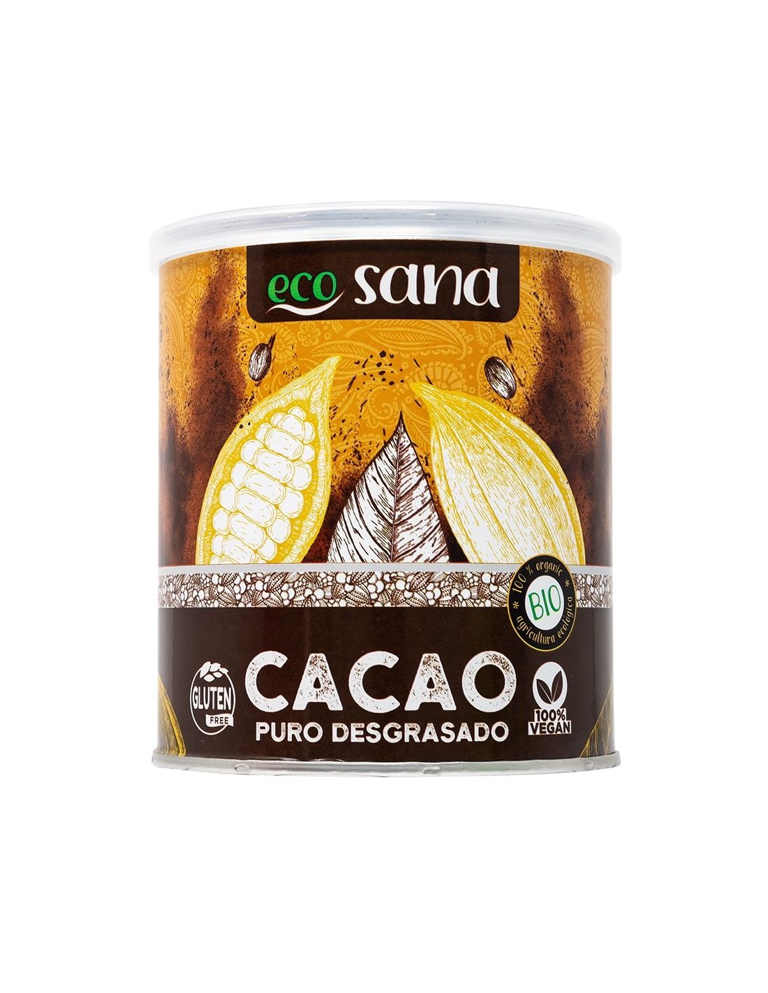 El cacao puro de Ecosana es desgrasado y 100% natural. Destaca por su bajo contenido en materia grasa (10-12%) frente al cacao en polvo tradicional y