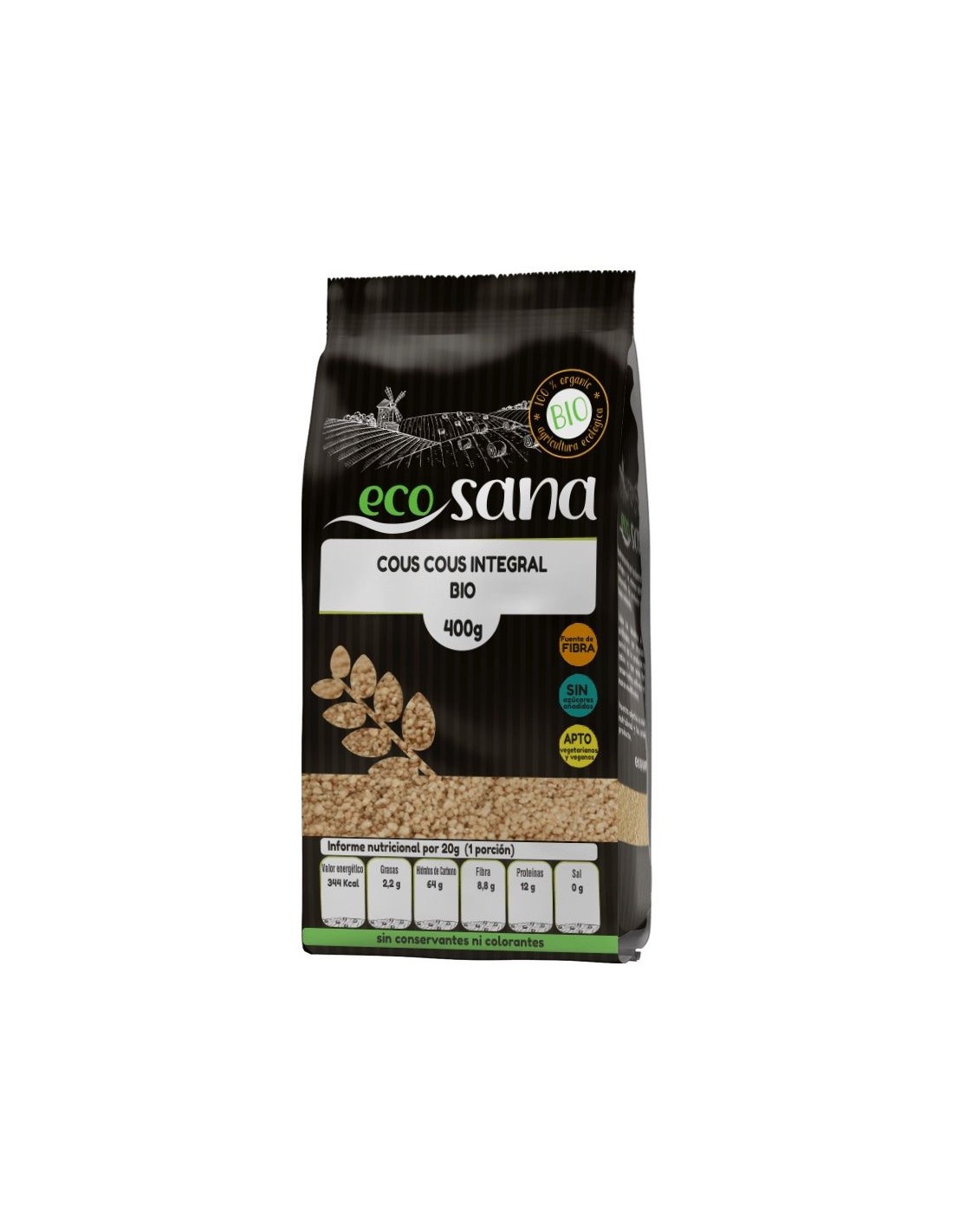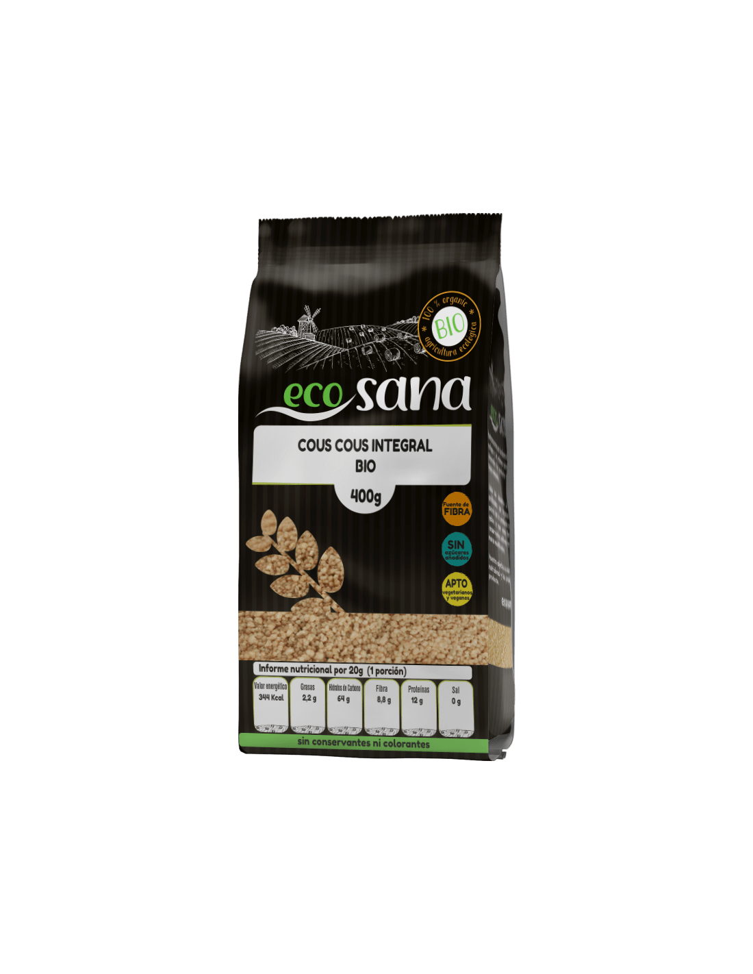 Modo de empleo:Para preparar el cous cous, utilizamos la misma medida de cous cous que de agua. Ponemos una olla al fuego con la cantidad de agua y aceite de oliva. Cuando el agua empiece a hervir, añadimos una pizca de sal y apagamos el fuego. Incorporamos el cous cous, tapamos y dejamos que el grano absorba el agua durante 5 minutos. Y ya lo tenemos cocinado!.Presentación:Envase de 400 gramos.Recomendaciones y advertencias:Producto vegano. No contiene aditivos ni conservantes. No OMG. Contiene gluten. Puede contener trazas de frutos de cáscara, sésamo y soja.