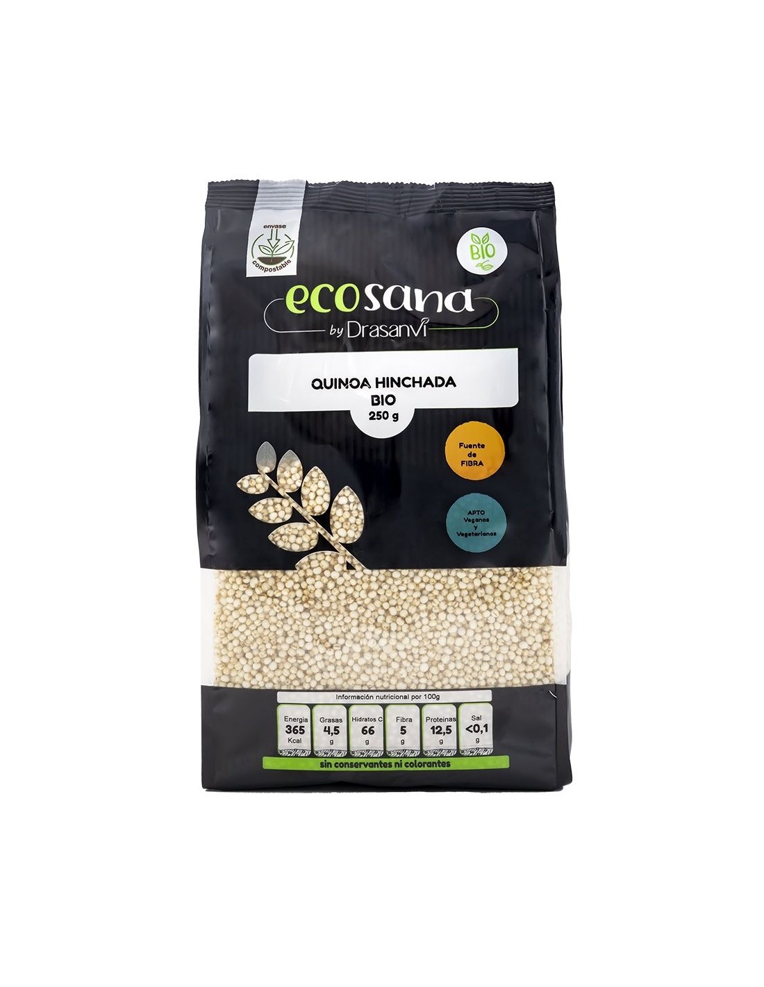 Ingredientes:Quinoa hinchada*. (*) Procedente de agricultura ecológica.Valor nutricional por 100 gramos:
