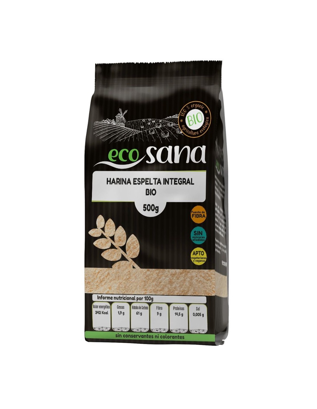 Ingredientes:Harina de espelta integral*. (*) Procedente de agricultura ecológica.Valor nutricional por 100 gramos: