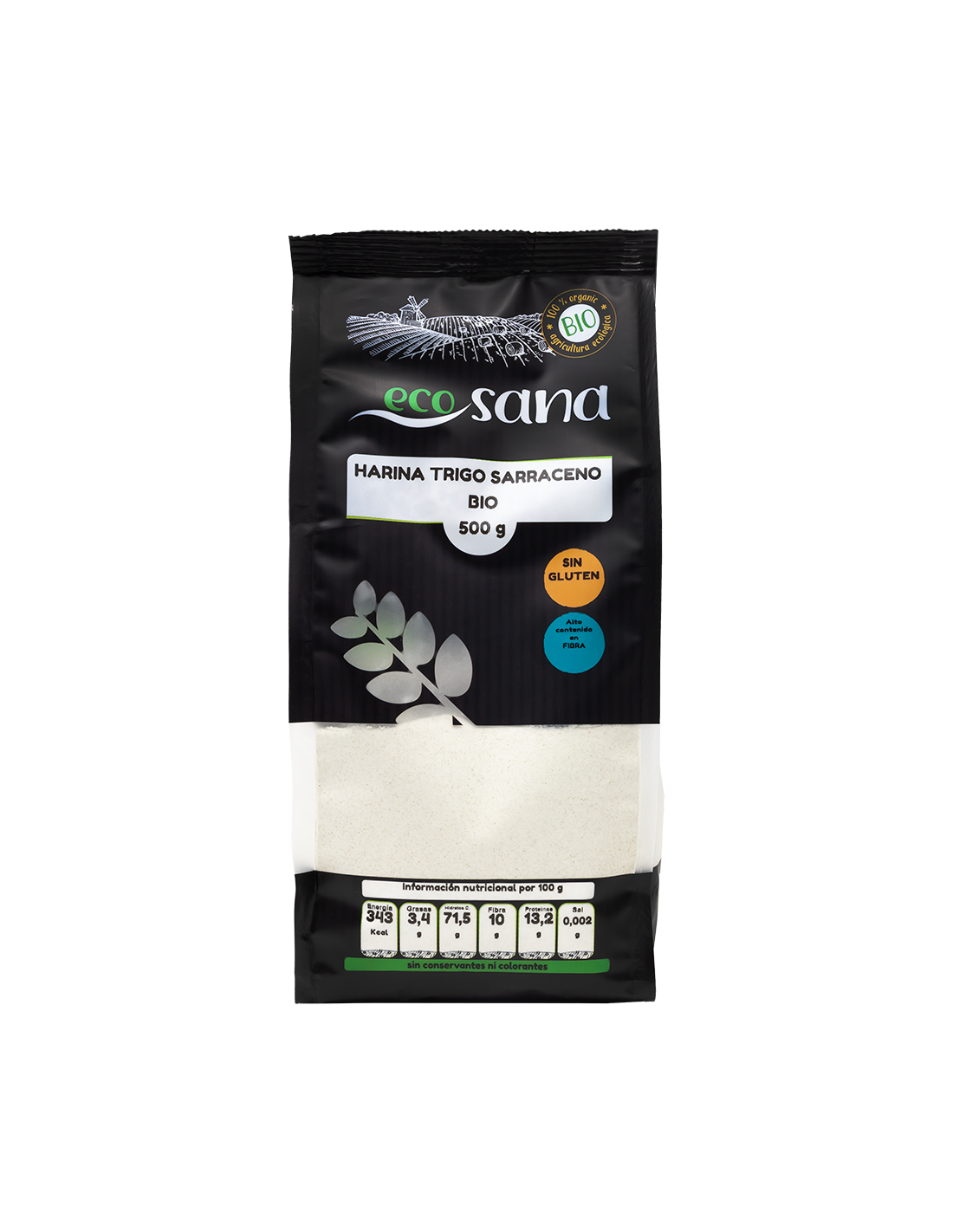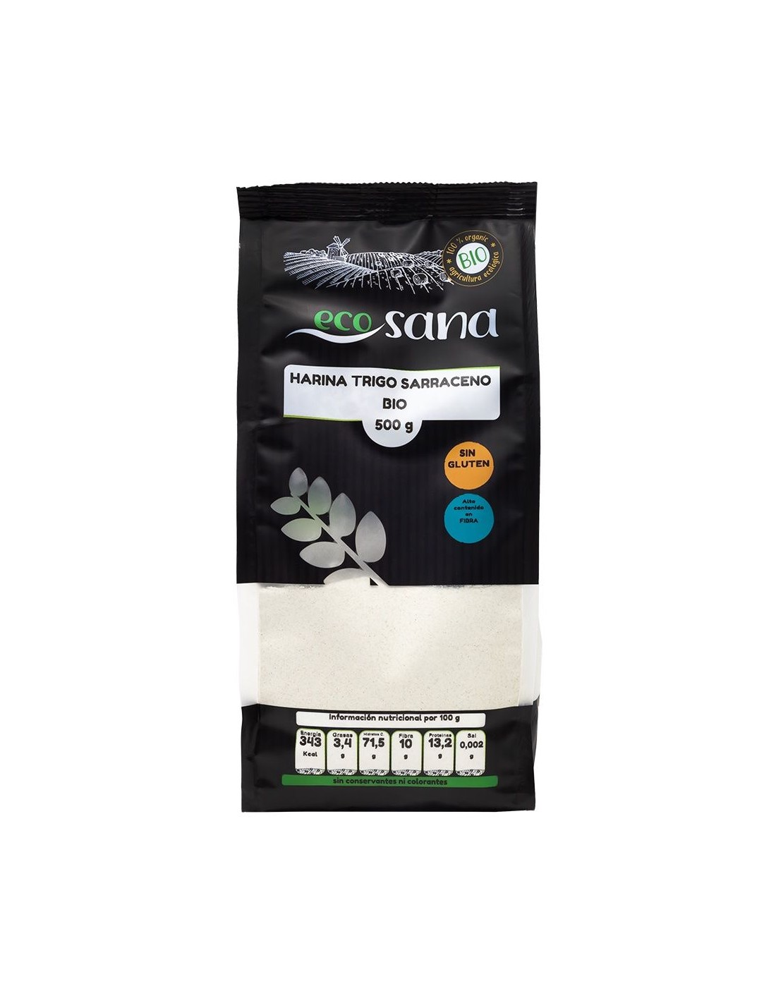 Ingredientes:Harina de trigo sarraceno*. (*) Procedente de agricultura ecológica.Valor nutricional por 100 gramos: