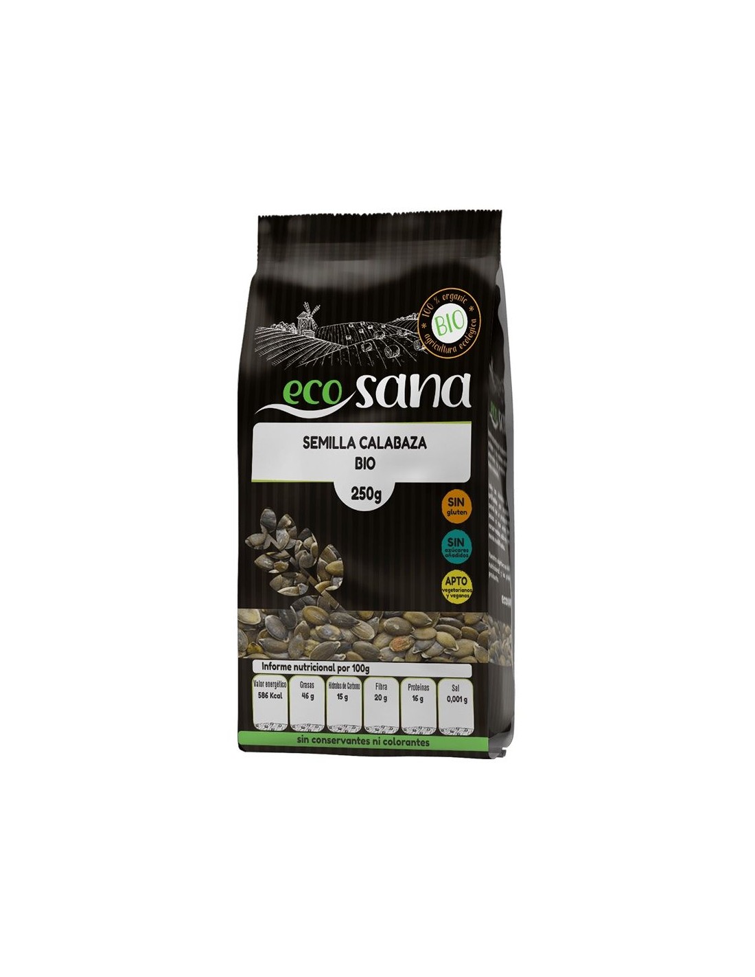 Ingredientes:Semillas de calabaza*. (*) Procedente de agricultura ecológica.Valor nutricional por 100 gramos: