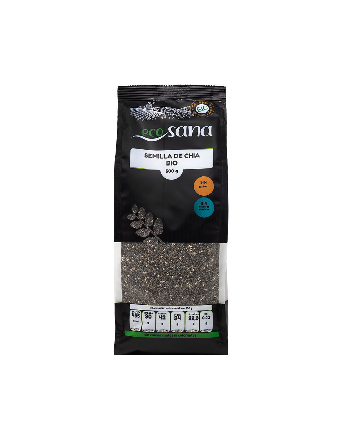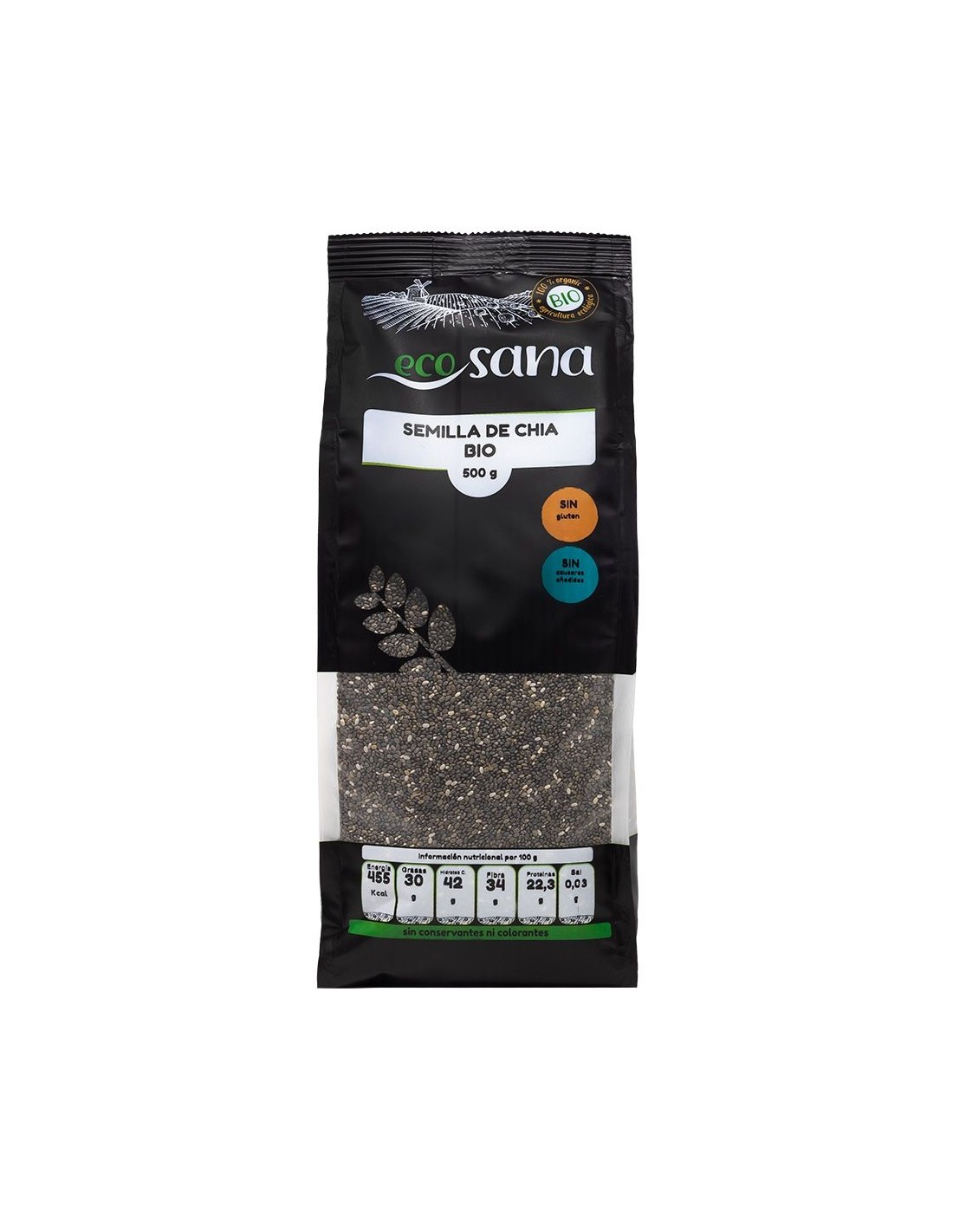 Ingredientes:Semillas de chia*. (*) Procedente de agricultura ecológica.Valor nutricional por 100 gramos: