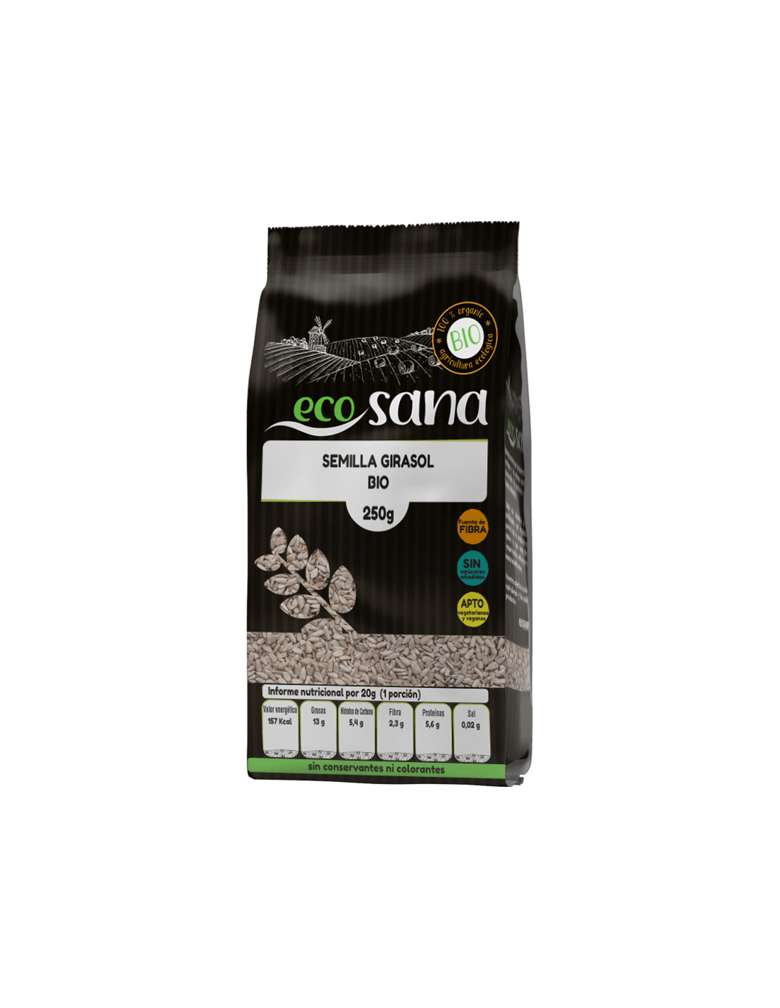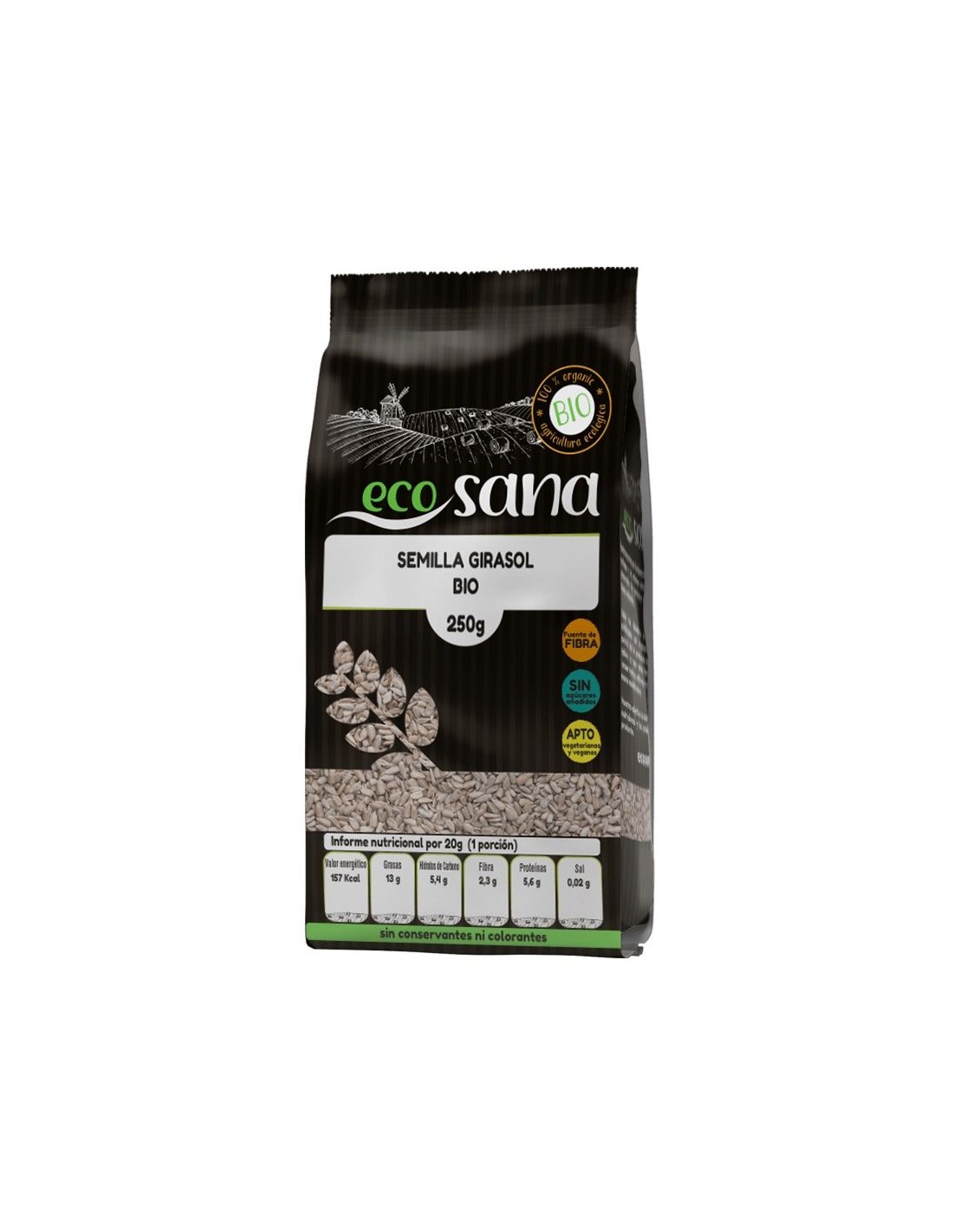 Ingredientes:Semillas de girasol*. (*) Procedente de agricultura ecológica.Valor nutricional por 100 gramos: