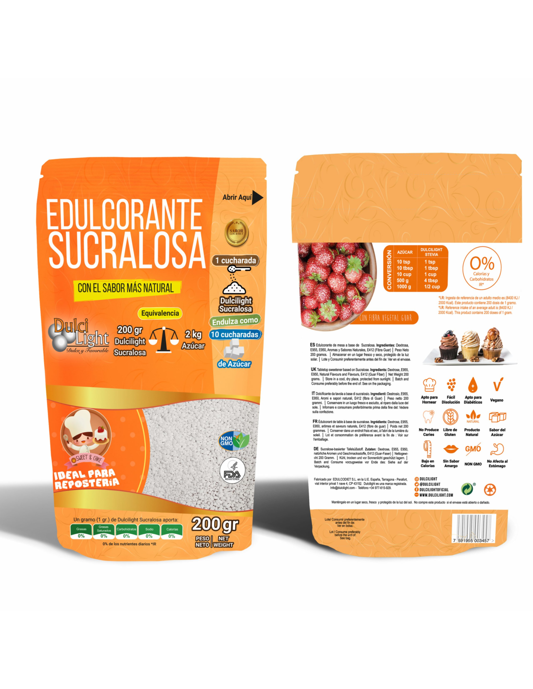 Edulcorante Granulado esférico, de fácil disolución en caliente y a frio, Úsalo para cocinar, Hornear, repostería, jugos, cocteles, ensaladas, postres, frutas, helados, disfruta el sabor natural del azúcar, Cada bolsa Doypack de 200 Gr. tiene el poder endulzante de 2 kilogramos de Azúcar. Poder endulzante 1:10