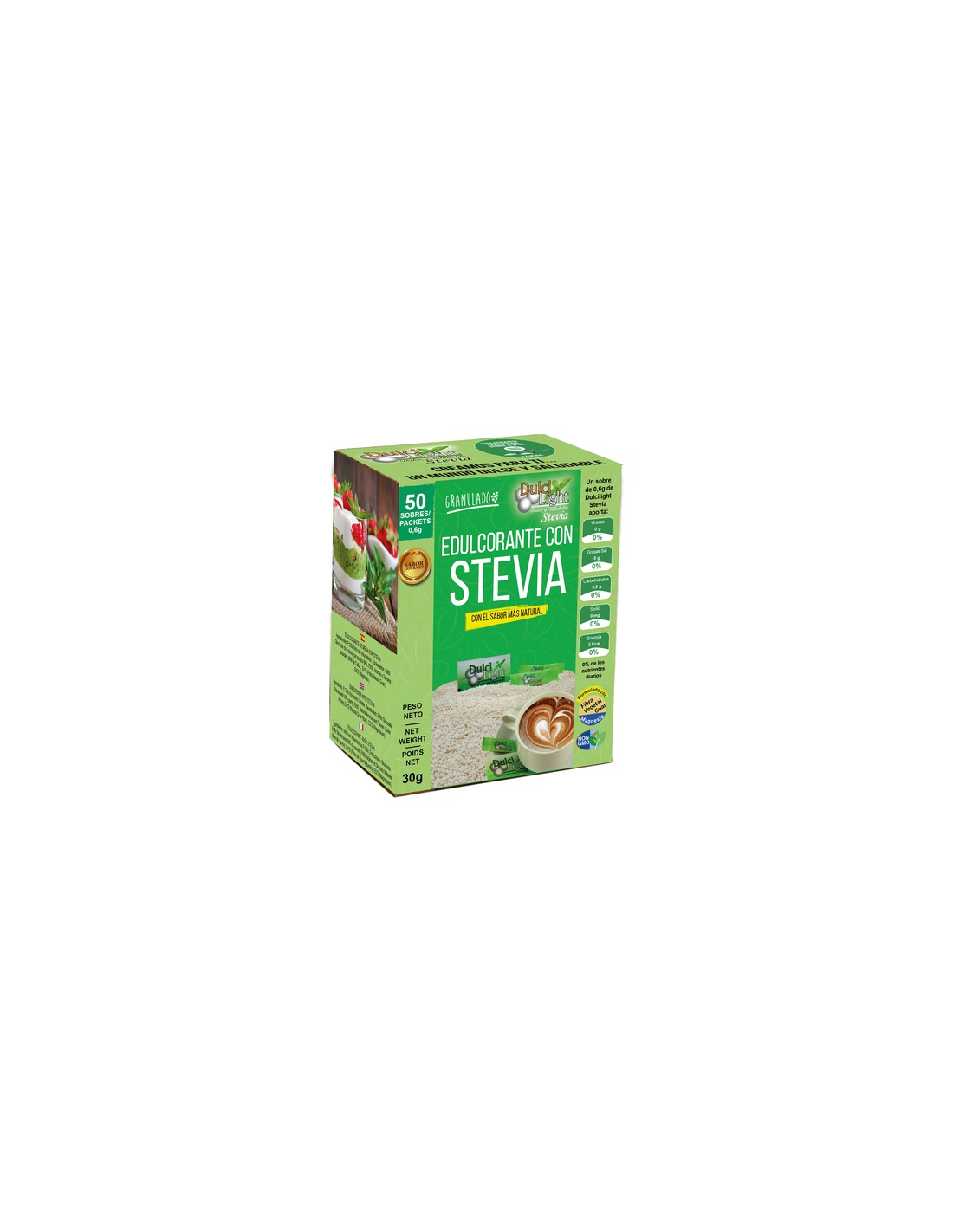 Edulcorante Granulado natural Stevia de Dulcilight es un edulcorante Granulado que incorpora Stevia y Miel de Caña Orgánica en su formulación envasado en sobres con el sabor natural y textura similar al azúcar con menos de 2 calorías por sobre