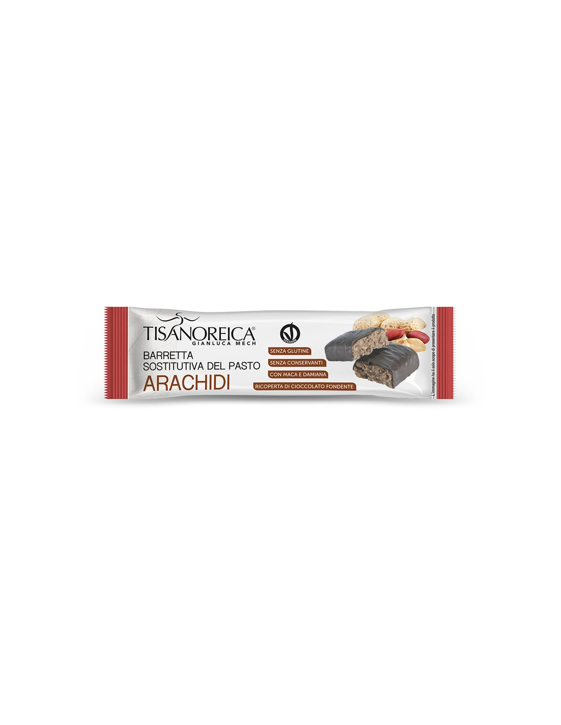 Barrita capaz de sustituir una comida completa. Es rico en nutrientes, incluidas vitaminas y minerales, y proporciona la cantidad adecuada de energía, carbohidratos y proteínas.Son prácticos para llevar contigo y consumir cuando no tienes tiempo para preparar una comida clásica. Se debe acompañar de abundantes líquidos.Ingredientes:Jarabe de fructosa, proteínas vegetales de guisante, 12% cobertura de chocolate negro (pasta de cacao, azúcar, manteca de cacao, lecitina de soja y vainillina), 7% pasta de cacahuete tostado y salado, granos de arroz inflados y tostados, premezcla de vitaminas, minerales: Maca (Lepidium meyenii Walp.) raíz, fosfato dibásico de potasio, sodio, fosfato de calcio tribásico, pirofosfato férrico, ácido L-ascórbico, nicotinamida, óxido de zinc, acetato de DL-alfa-tocoferilo, sulfato de cobre, hoja de Damiana (Turnera difusa Willd.), calcio D -pantotenato, sulfato de manganeso, riboflavina, clorhidrato de piridoxina, clorhidrato de tiamina, acetato de retinilo, ácido pteroil-monoglutámico, D-biotina, yoduro de potasio, selenito de sodio, colecalciferol, cianocobalamina, acidez (ácido cítrico), óxido de magnesio, sabor a mantequilla de maní.Valor nutricional por 60 gramos: