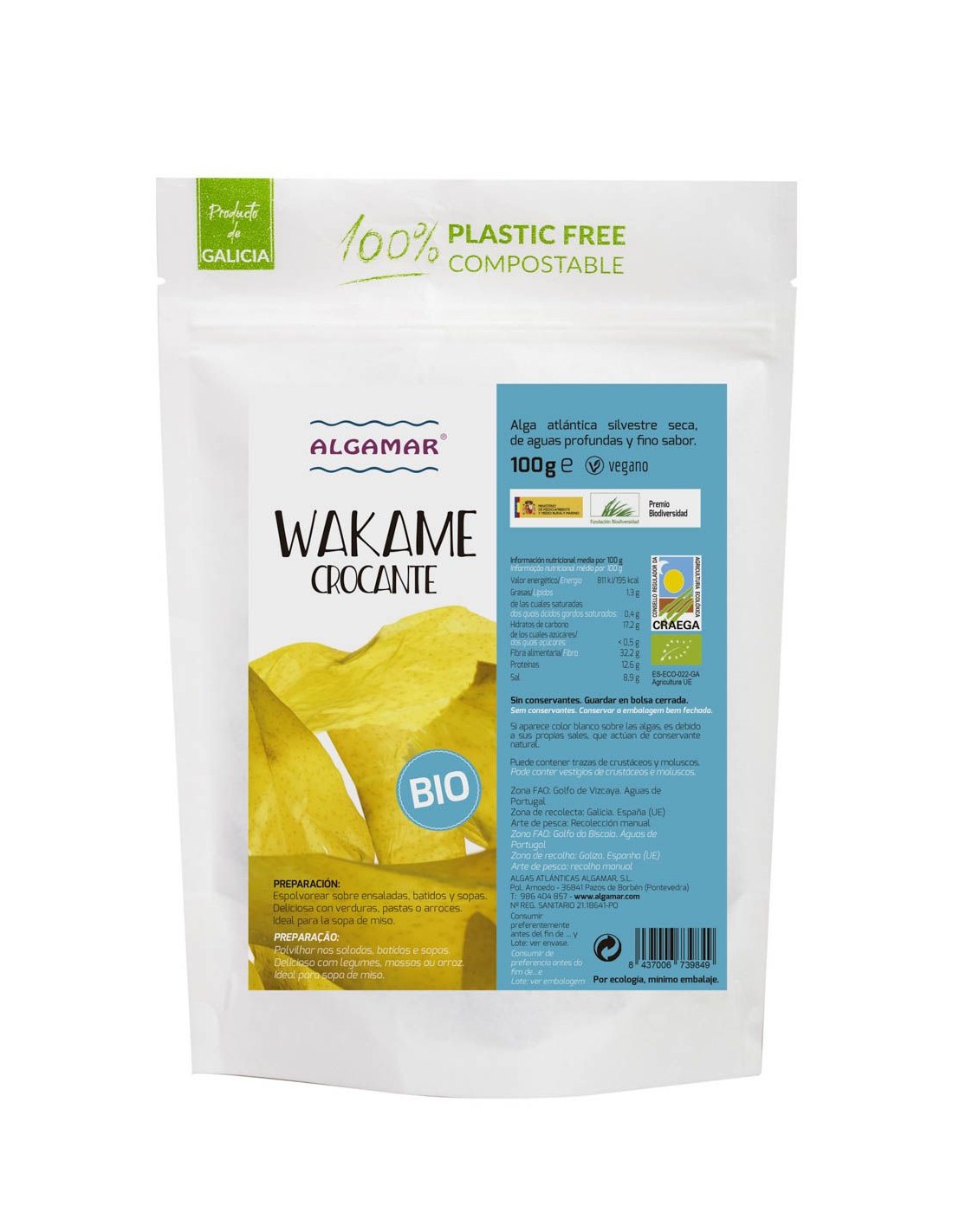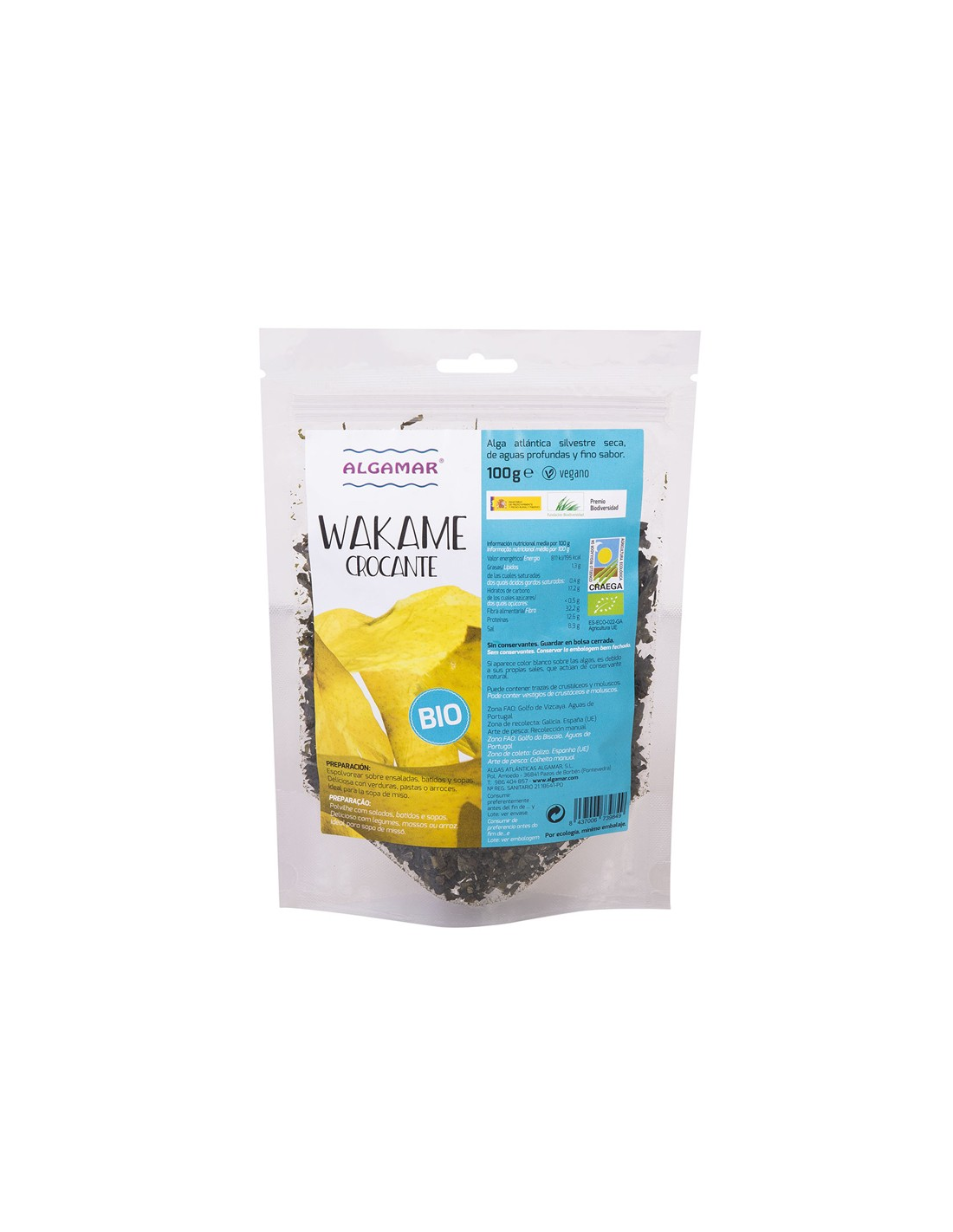 Ingredientes:Alga atlántica silvestre seca, de aguas profundas y fino sabor.Valor nutricional por 100 gramos: