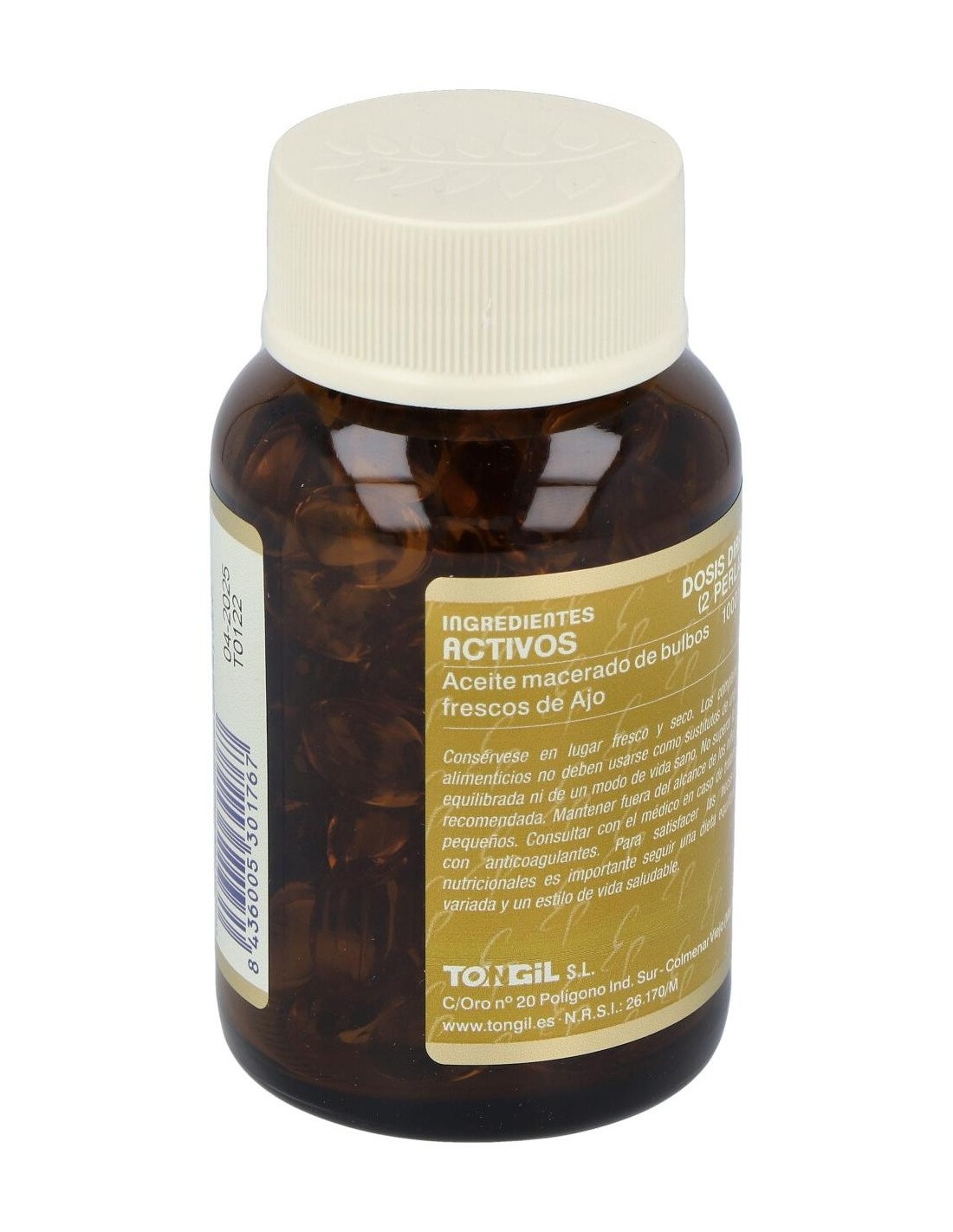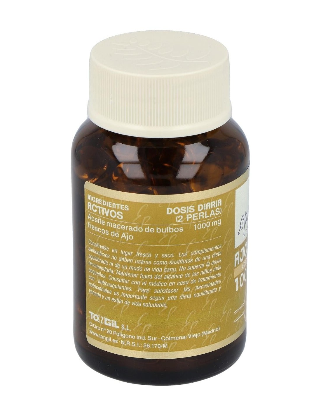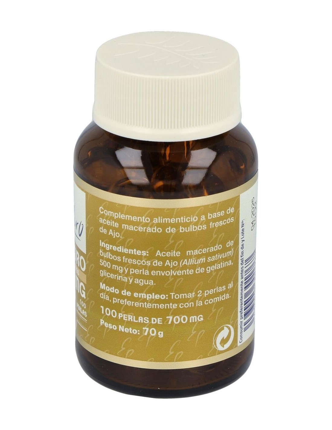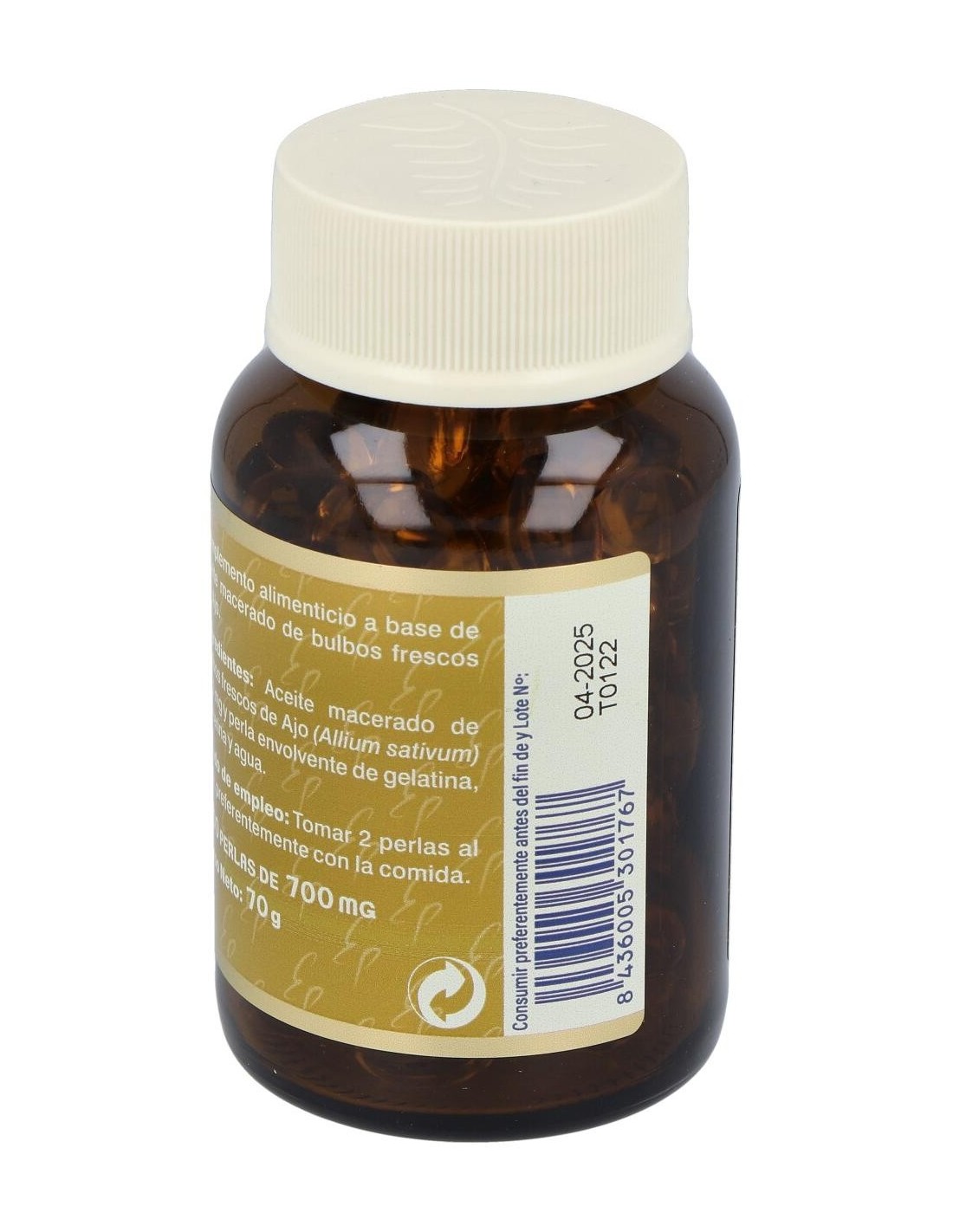 Composición activa por 2 perlas:1.000 mg de aceite macerado de bulbos frescos de Ajo.Otros ingredientes:Perla envolvente de gelatina, glicerina y agua.Modo de empleo:Tomar 2 perlas al día con las comidas.Presentación:Bote de 100 perlas.