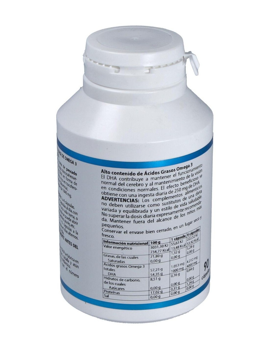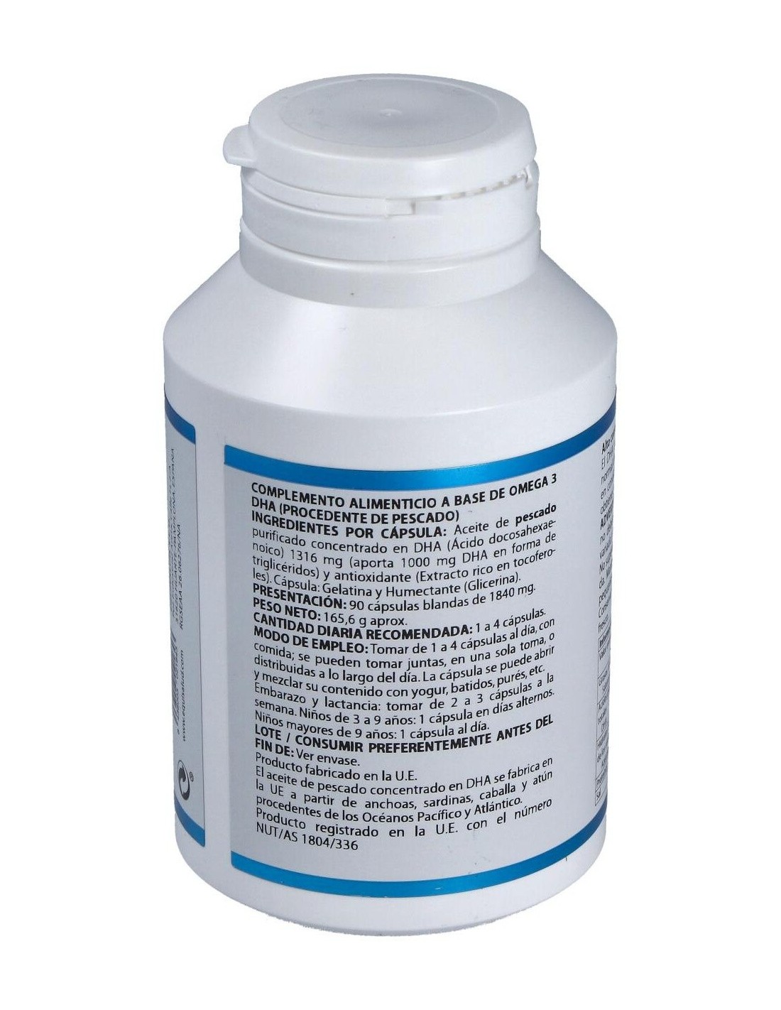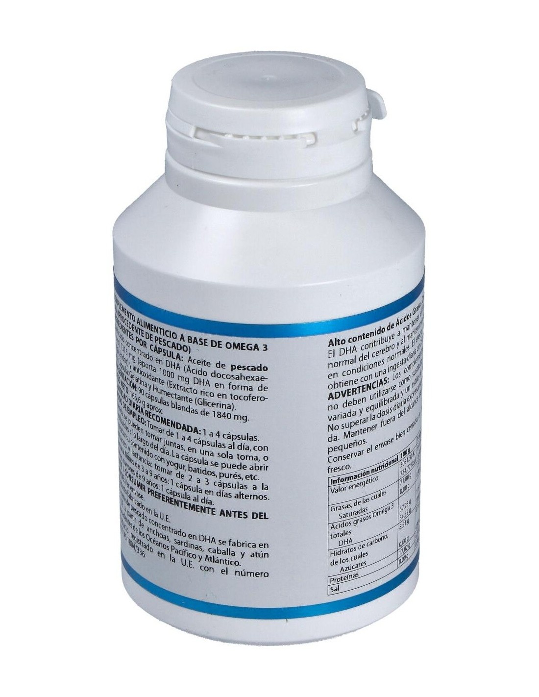 (aporta 1.000 mg DHA en forma de triglicéridos) y antioxidante (extracto rico en tocoferoles). Envoltura: cápsula de gelatina blanda. Gelatina (agente de recubrimiento), glicerina (humectante) y agua.