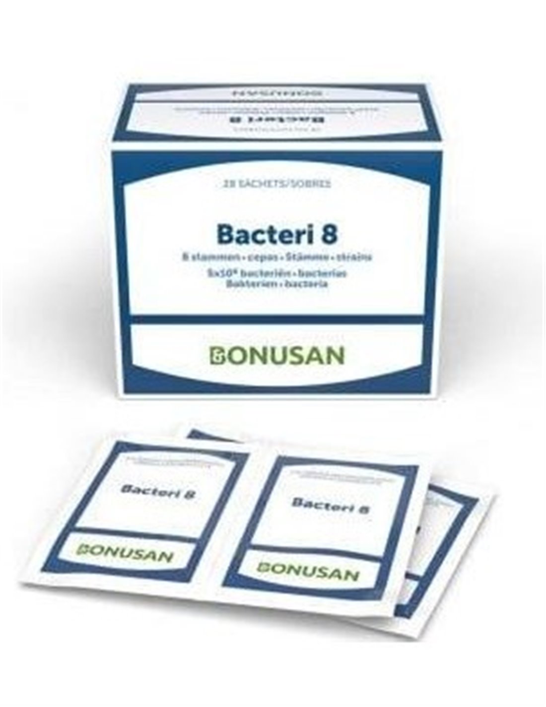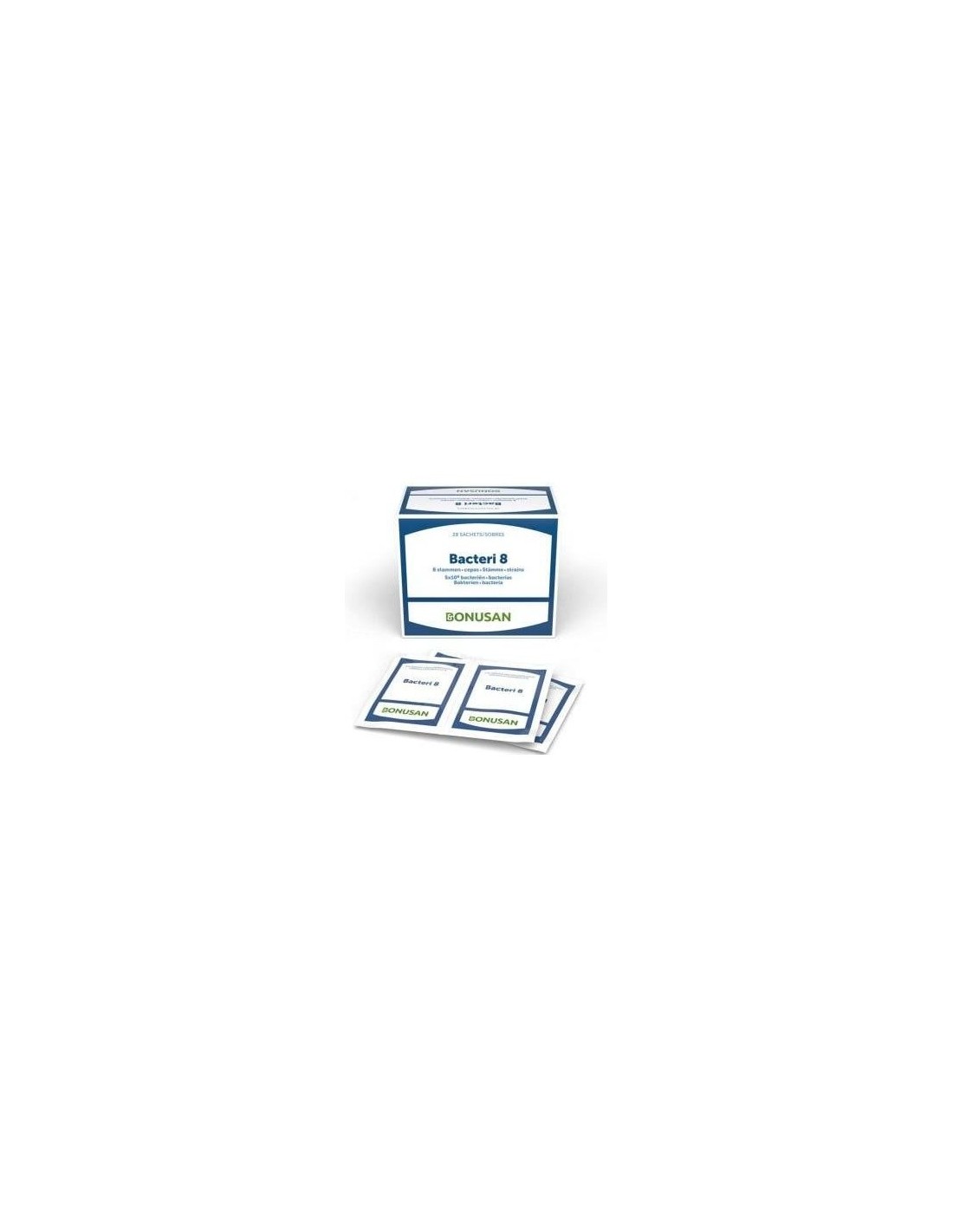 ¿Por qué bacterias?Las bacterias son microorganismos. Estos diminutos organismos unicelulares viven a nuestro alrededor y también en el exterior e interior de nuestro cuerpo. En el tracto intestinal viven cerca de 100 billones (1014) de microorganismos, con un peso total de entre 1 y 3 kg. Al conjunto de bacterias en el intestino también se le denomina flora intestinal o microbioma. El microbioma contiene aproximadamente tantas bacterias como células hay en el cuerpo humano. Las personas y sus bacterias dependen las unas de las otras.¿Qué hacen las bacterias? Las bacterias existen desde mucho antes que los humanos; llevan poblando la Tierra desde hace ya 3500 millones de años. Sin ellas, la vida en nuestro planeta no sería posible. Una de las características de las bacterias es que, gracias a la evolución, se pueden adaptar a casi cualquier entorno; entre otros, a las condiciones existentes en nuestro cuerpo. Las bacterias viven en la piel, la boca, la nariz, las vías urinarias y los órganos sexuales. La mayoría, sin embargo, se encuentran en los intestinos.¿Por qué son útiles las bacterias? Las bacterias no siempre tienen buena fama, ya que pueden provocar muchas enfermedades desagradables. A estas bacterias que causan enfermedades también se las llama bacterias patógenas. Pero no todas las bacterias son patógenas y causan enfermedades; también existen bacterias que son útiles y beneficiosas. Las barreras naturales de nuestro cuerpo, como el intestino, albergan todo tipo de bacterias diferentes. Lo importante es mantener un buen equilibrio entre las distintas cepas bacterianas.Las ventajas de Bacteri 8 de BonusanBonusan Bacteri 8 contiene una combinación equilibrada de 8 cepas bacterianas. Todas las cepas están presentes en el microbioma humano de forma natural. Este producto de amplio espectro se ha ideado especialmente para adultos, por lo que la diversidad de las cepas coincide con la diversidad de las cepas del intestino. Si necesita un espectro aún más amplio de cepas bacterianas, la gama Bacteri incluye nuestro producto experto definitivo: el Bacteri 17 Expert Resilience. ¿Qué contiene Bacteri 8 de Bonusan? En el nombre de nuestros productos bacterianos, el número se refiere al número de cepas que contiene el producto. Bacteri 8 contiene por tanto 8 cepas, 3 tipos de bifidobacterias y 5 tipos de lactobacilos (bacterias lácticas). Todas las cepas presentes en Bacteri 8 se han seleccionado además por su capacidad para sobrevivir en el tracto digestivo. Esto garantiza que un alto porcentaje de las bacterias llegue vivo al intestino. Bacteri 8 contiene asimismo 5000 millones de bacterias garantizadas hasta la fecha de caducidad. Esto significa que, durante la fabricación aumentamos la dosis para garantizar que aún quede una cantidad suficiente de bacterias viables cuando se alcance la fecha de caducidad.Bacteri 8 de Bonusan se presenta en sobres de una dosis. ¿Por qué se utilizan sobres? Los sobres ofrecen a las bacterias la mejor protección. Su recubrimiento interior protege óptimamente las bacterias frente a las influencias ambientales, como la humedad, la luz y el aire, lo que permite guardar el producto simplemente a temperatura ambiente y llevarlo consigo a cualquier parte. En el momento de tomarlo, el polvo se disuelve fácilmente en el agua. La bebida tiene un sabor agradable (entre neutro y ligeramente dulce). Bacteri 8 también se presenta en cápsulas .¿Cómo se utiliza este suplemento?Disolver el contenido del sobre en un vaso con agua tibia a un máximo de 37°C, es decir, a temperatura corporal. Las temperaturas más elevadas influyen negativamente en la viabilidad de las bacterias. Al disolver el polvo en agua, las bacterias tiene la oportunidad de salir de la fase de latencia y activarse. Esto las hace más resistentes al ácido del estómago y la bilis, y más bacterias sobreviven este difícil pasaje. El suplemento se puede beber directamente.Se recomienda beber el contenido de pie. Cuando estamos de pie, los músculos del estómago se encuentran en una posición que acelera el paso por el estómago. Además, para obtener el mayor efecto posible, se recomienda tomar el suplemento Bacteri con el estómago vacío antes de irse a dormir. Otro buen momento para tomarlo es media hora antes de desayunar o en combinación con una comida rica en hidratos de carbono y baja en grasas.Bacterias intestinales de alta calidadLos productos Bacteri de Bonusan no contienen ningún añadido innecesario ni otras vitaminas o minerales. Esto permite garantizar una mayor viabilidad de las bacterias y controlar la capacidad de rehidratación de las cepas bacterianas presentes. Las bacterias se producen y secan en circunstancias controladas. El secado garantiza que las bacterias se conserven durante más tiempo, siempre que se almacenen a temperatura ambiente, en un entorno seco y protegido (cápsulas o sobres). Además, los productos Bacteri de Bonusan contienen inulina y FOS. Estas fibras sirven como excipiente para las bacterias.Todas las cepas de este producto de amplio espectro se encuentran en la lista QPS (presunción cualificada de seguridad) y, por tanto, se han considerado seguras en numerosos estudios científicos, así como aprobadas por la EFSA (Autoridad Europea de Seguridad Alimentaria) para su uso en alimentos. Se indican los números de cepas de todas las cepas añadidas.La cantidad de bacterias presentes en un suplemento se expresa con la abreviatura UFC, que significa "unidad formadora de colonias". La cantidad de UFC se indica en cientos o miles de millones y se suele expresar como "mil millones de UFC" o "1x109 UFC". Las UFC indicadas en los productos Bacteri de Bonusan quedan garantizadas en el momento de la producción hasta la fecha de caducidad.