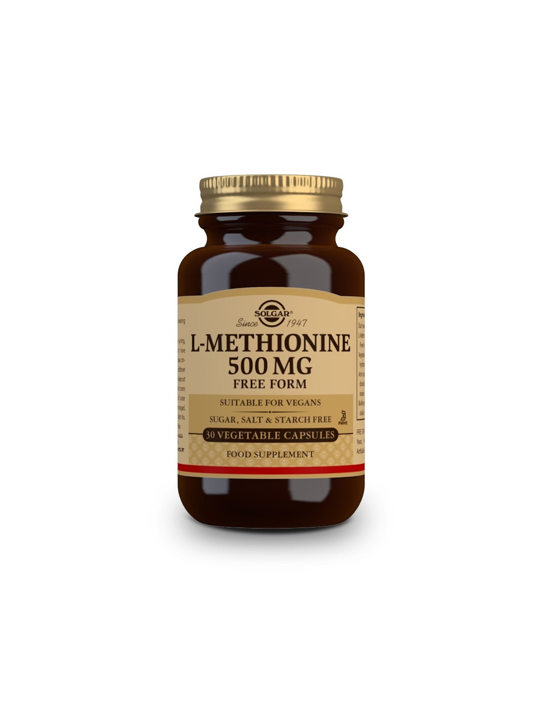 - Cada cápsula contiene 500 mg de L-Metionina, un aminoácido esencial que contribuye a procesos naturales del organismo.