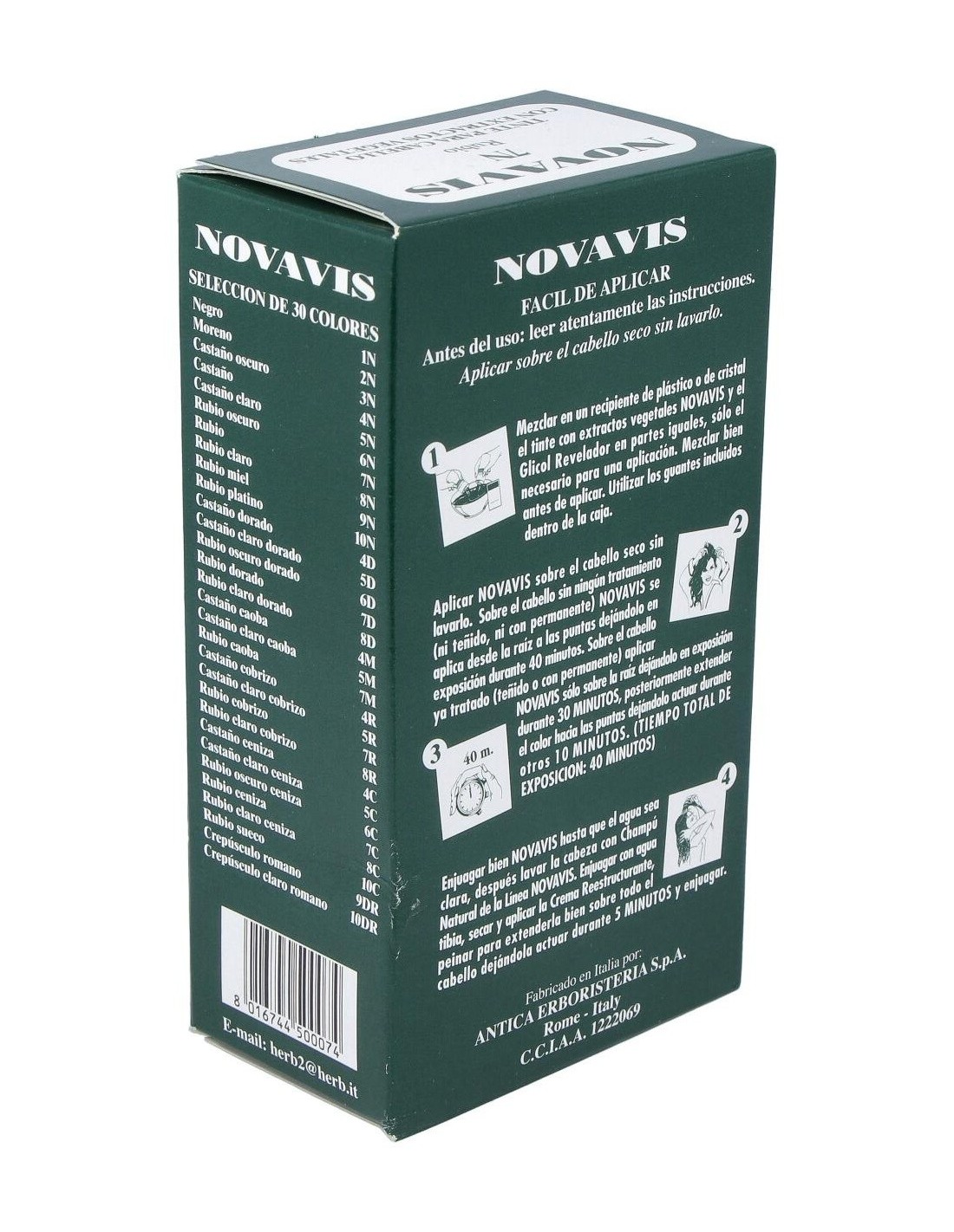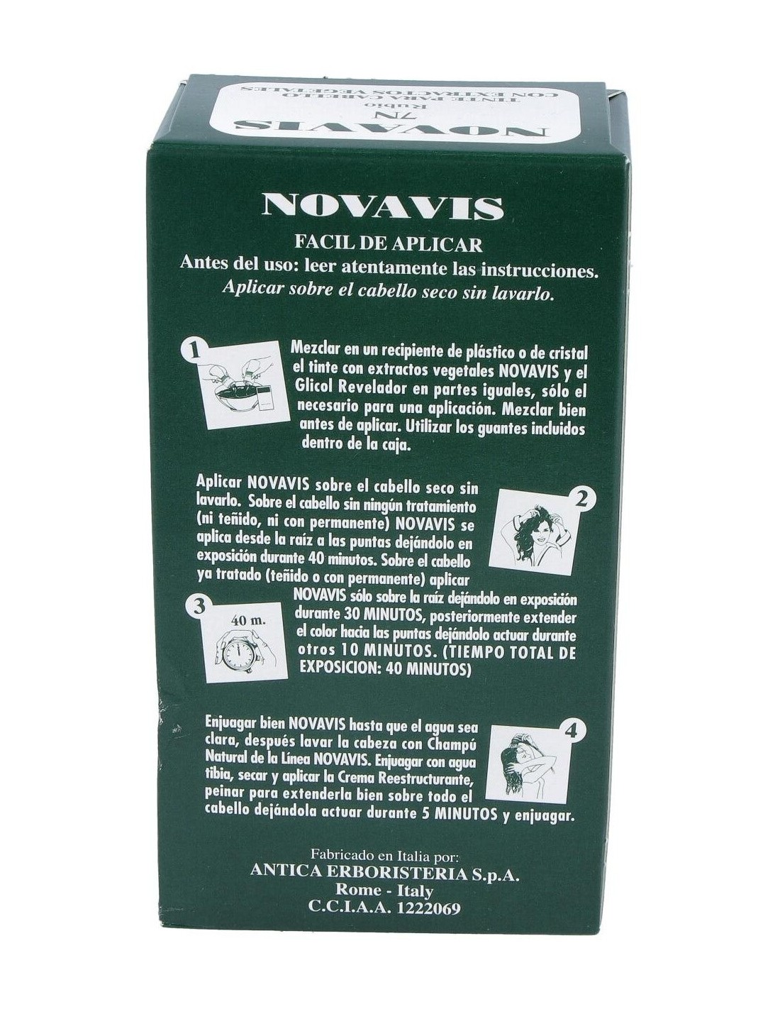 2. Aplicar sobre el cabello seco sin lavarlo. Sobre el cabello sin tratamiento ( ni teñido ni permanente). Se aplica desde la raíz a las puntas dejándolo en exposición durante 40 minutos. Sobre el cabello con teñido o permanente. Aplicar sólo sobre la raíz dejándolo en exposición durante 30 minutos. Posteriormente extender el color hacia las puntas dejándolo actuar durante otros 10 minutos. El tiempo total de exposición es de 40 minutos.