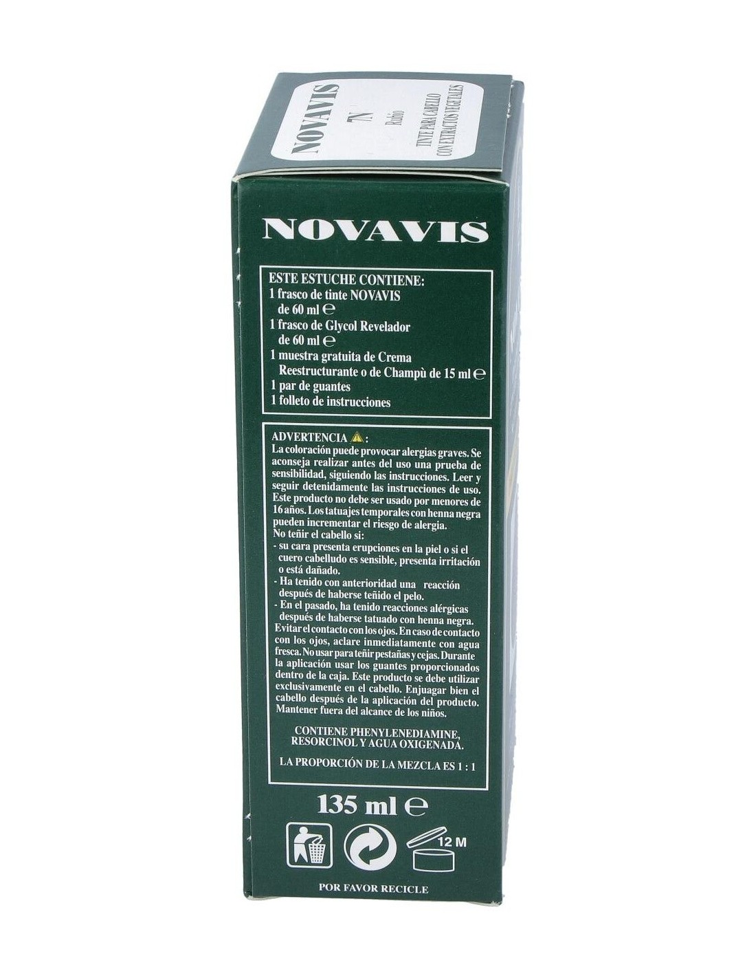 Contiene: 1 frasco de tinte 60 ml, 1 frasco de Glycol Revelador 60 ml, 1 muestra gratuita de Crema Reestructurante o de Champú de 15 ml, 1 par de guantes y 1 folleto de instrucciones.