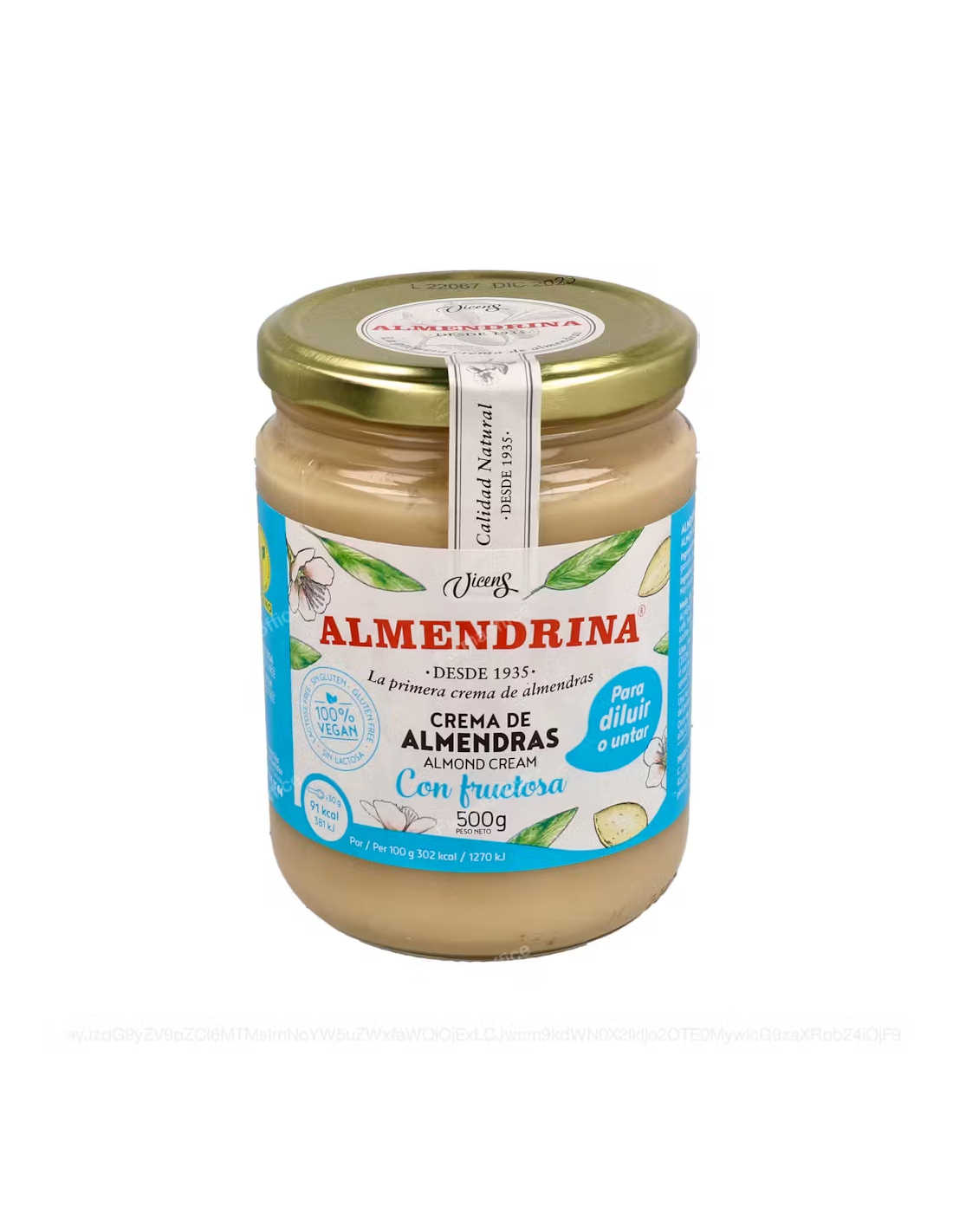 Versión de la crema de almendras tradicional Almendrina pero sin azúcar ni glucosa. 100% vegetal y apta para veganos, recomendada para intolerantes a la leche de origen animal y para mejorar las digestiones. La versión con fructosa está especialmente indicada para diabéticos y para personas que siguen dietas sin azúcar y glucosa y para deportistas.