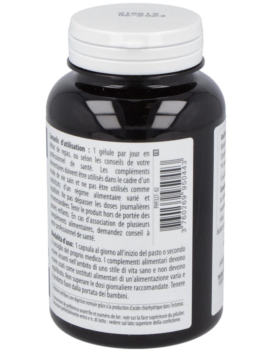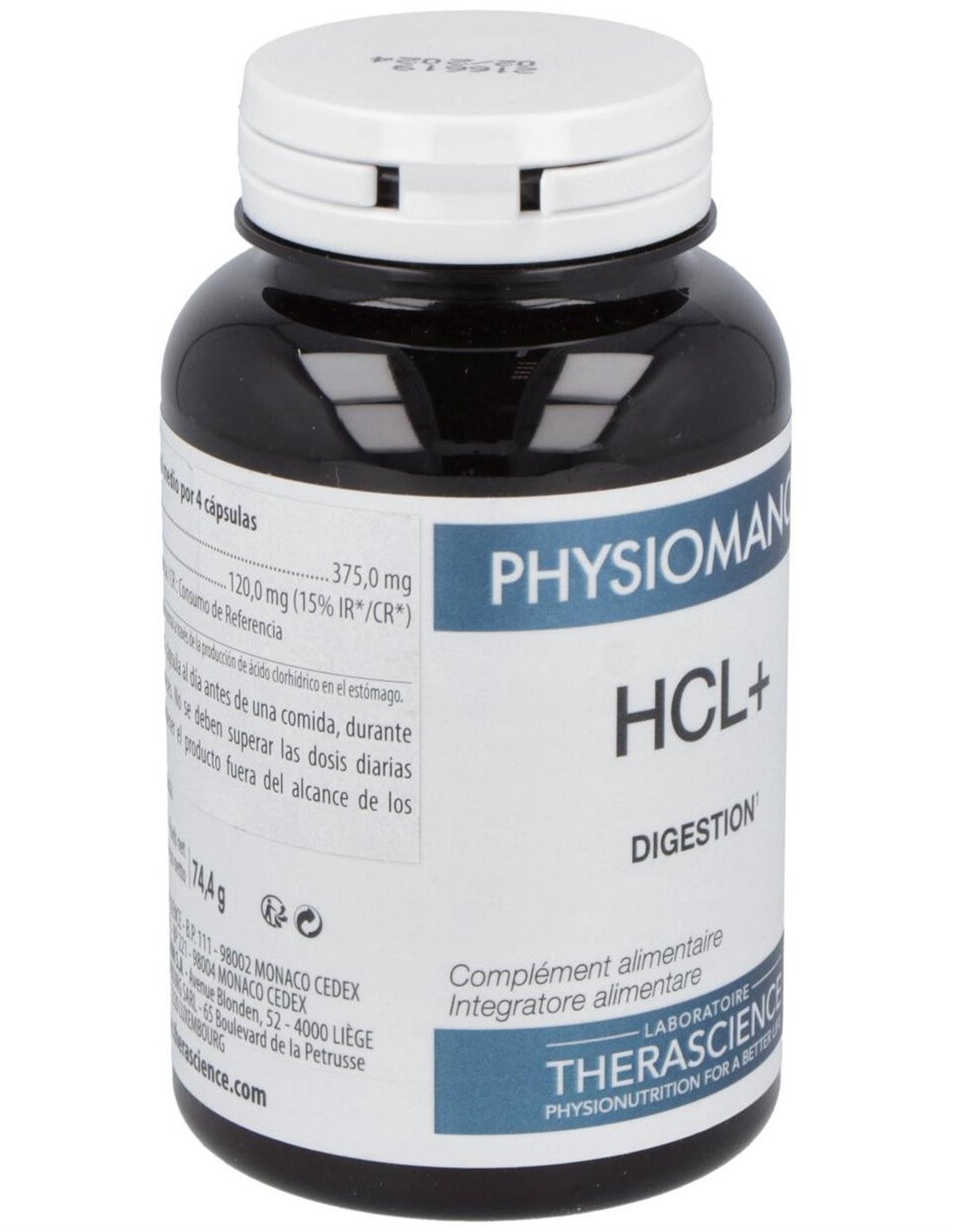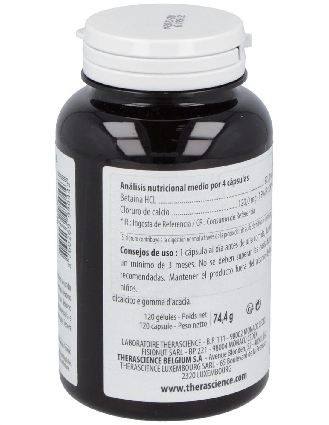 Betaína HCl, cápsula de origen vegetal: hidroxipropilmetilcelulosa, cloruro de calcio.