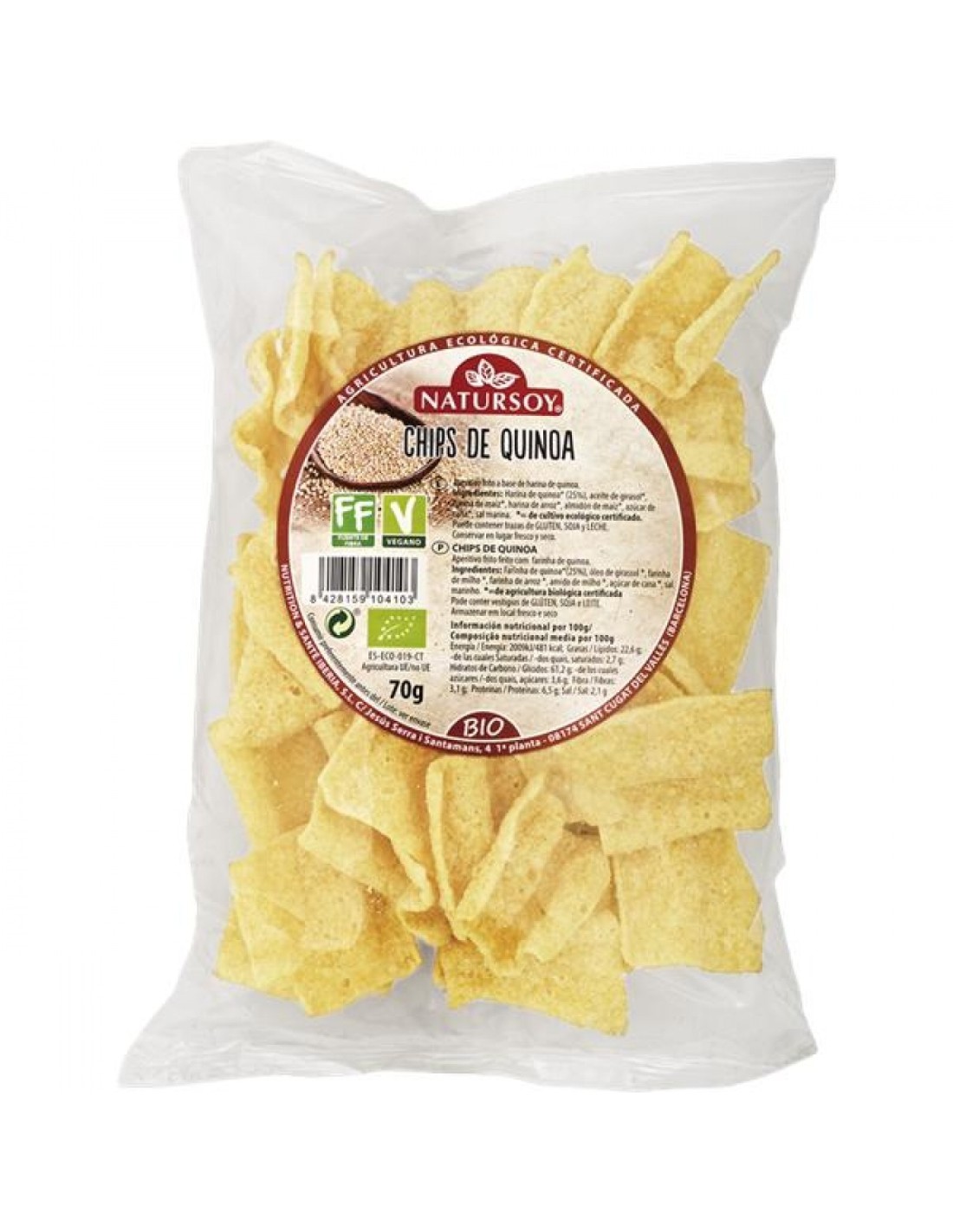 Harina de quinoa* (25%), Aceite de girasol*, Harina de maíz*, Harina de arroz*, Almidón de maíz*, Azúcar de caña*, Sal marina. Valor nutricional por 100 g: Energía 2009kj/481 kcal Grasas 22,6 g de las cuales saturadas 2,7 g Hidratos de carbono 61,2 g de los cuales azúcares 3,6 g Fibras 3,1 g Proteínas 6,5 g Sal 2,1 g (*)= De cultivo ecológico certificado. +Puede contener trazas de gluten, soja y leche.
