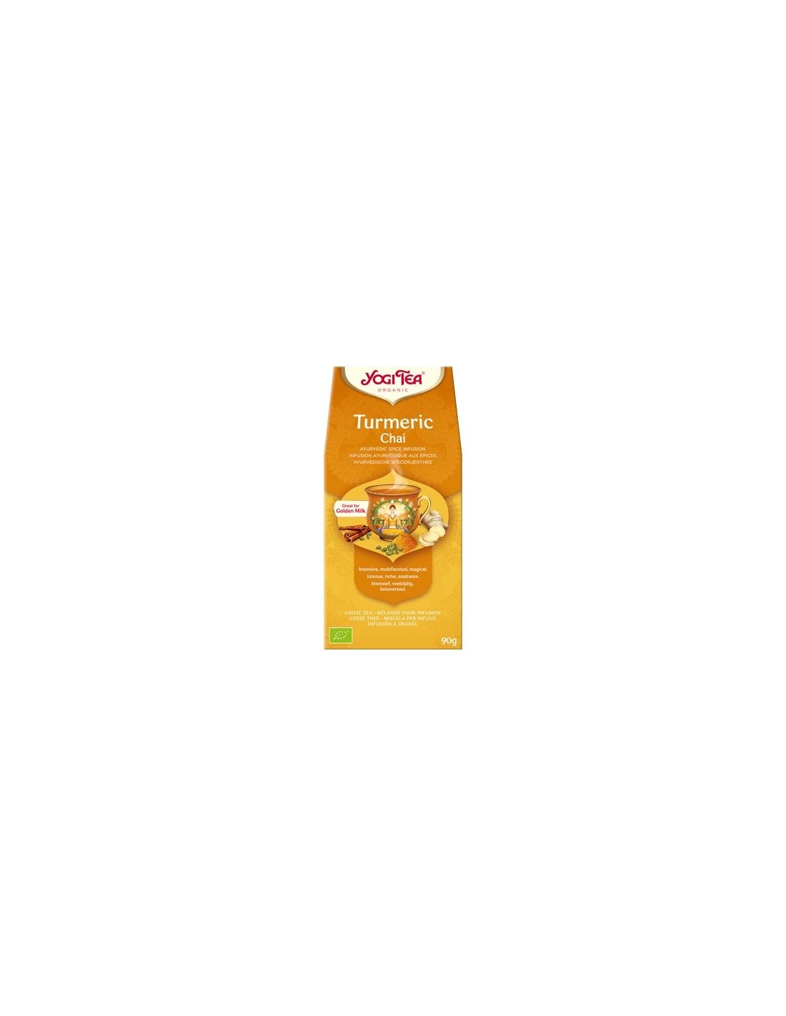 Ya considerada sagrada en la India hace más de 5.000 años, la raíz de la cúrcuma resplandece con un poderoso color amarillo dorado. Combinada con deliciosas especias chai como la canela dulce y el cardamomo, la cúrcuma emana toda su plenitud en esta infusión. Su disfrute garantiza calor exótico y momentos maravillosos.Ingredientes:Cúrcuma*, canela*, regaliz*, jengibre*, cardamomo*, pimienta negra*, manzana*, hinojo*, macis*, cáscara de cacao*, clavo*. (*) Ingredientes procedentes de agricultura ecológica.Modo de empleo:Añada 2 cucharaditas (3,5g) a un litro de agua hervida y déjelo a fuego lento durante 15-20 min. Filtra! Añade la leche caliente y edulcorante si lo desea. Se recomienda prepararla tipo Leche Dorada: sencillamente hervir la infusión en la leche.Presentación:Envase de 90 gramos.