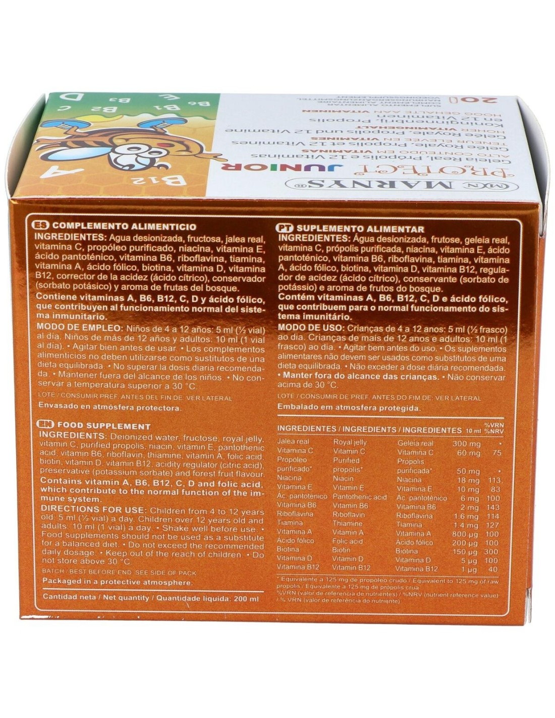 Este producto es un complemento alimenticio con un alto contenido de las siguientes 12 vitaminas: vitamina C, niacina (vitamina B3), vitamina E, ácido pantoténico (vitamina B5), vitamina B6, riboflavina (vitamina B2), tiamina (vitamina B1), vitamina A, ácido fólico, biotina, vitamina D, vitamina B12, con jalea real y propóleo. Es un producto diseñado para niños y adolescentes.La vitamina A, B6, B12, C, D y el ácido fólico contribuyen al funcionamiento normal del sistema inmunitario. Es recomendable seguir una dieta variada y equilibrada y un estilo de vida saludable.Composición activa por vial: