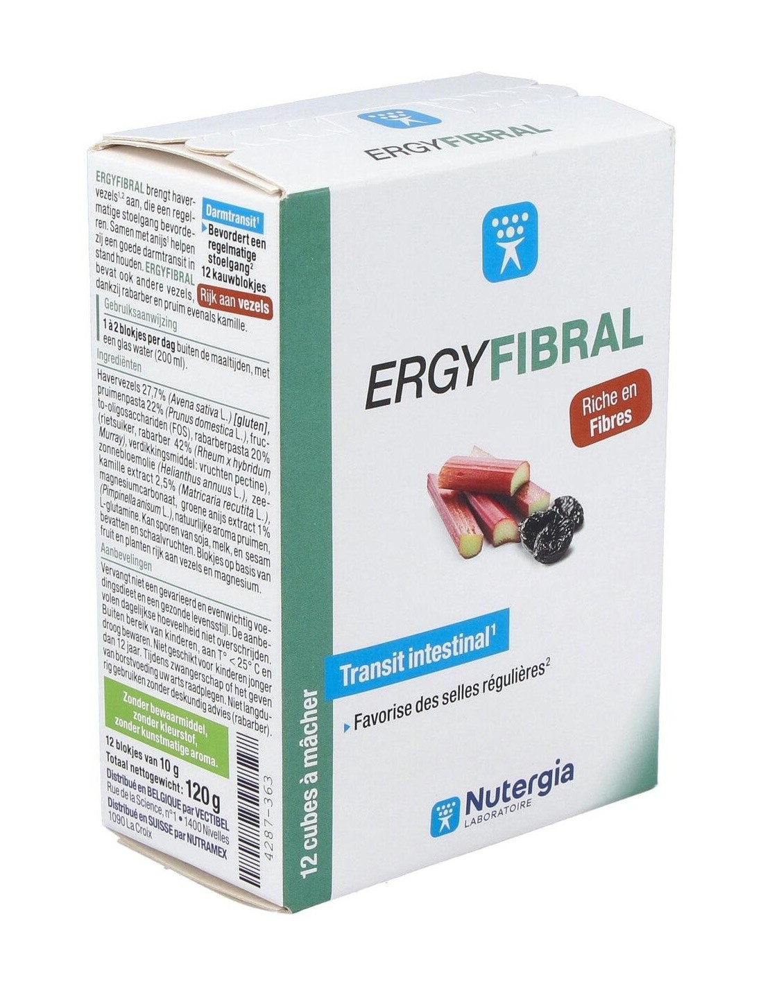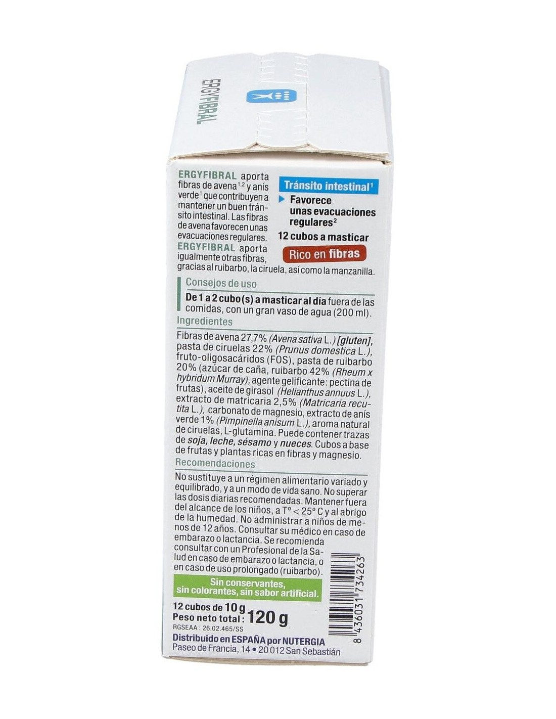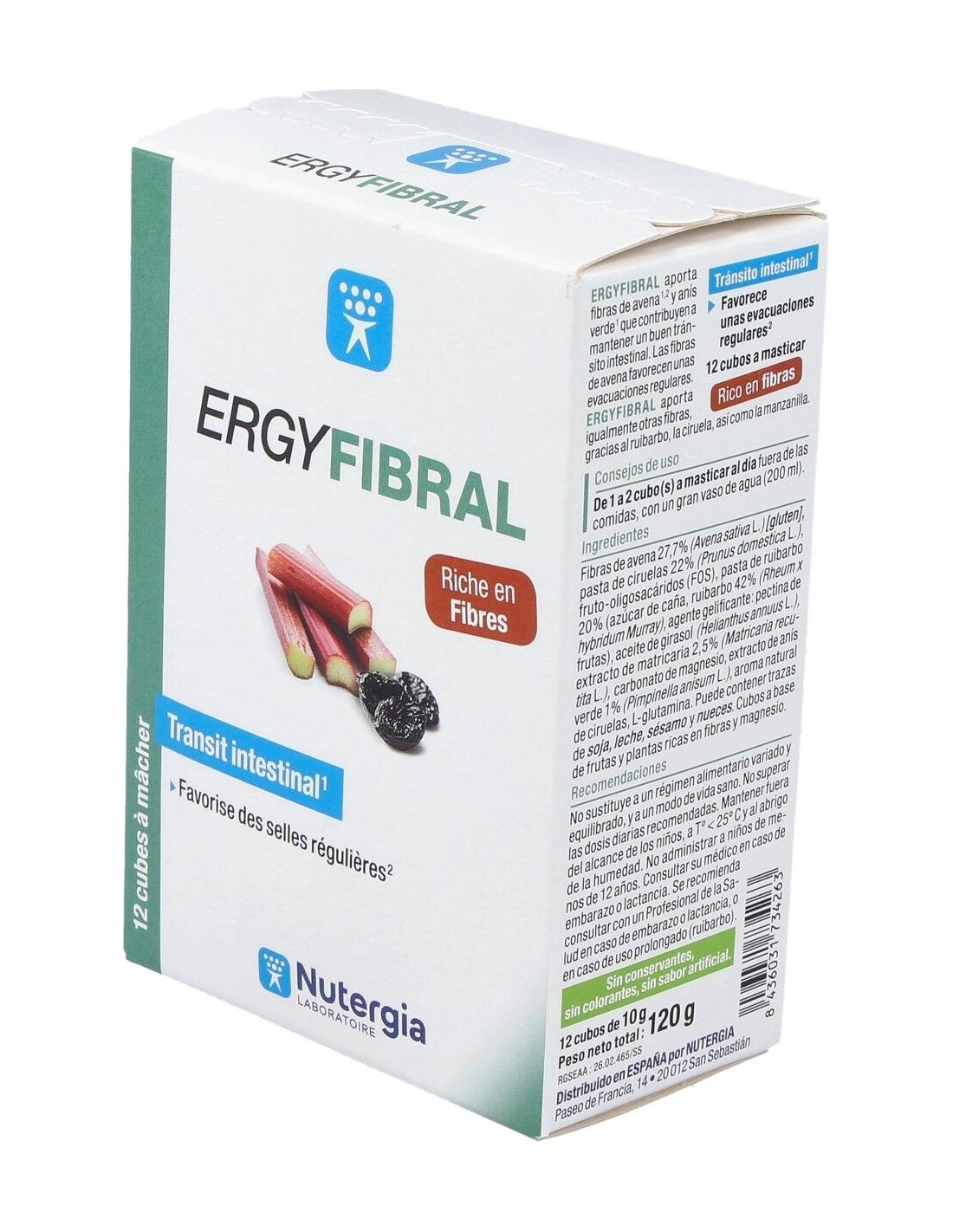 Producto rico en fibras, Ergyfibral Masticable aporta entre otros, fibras de avena que contribuyen a aumentar el volumen de las heces así como ruibarb