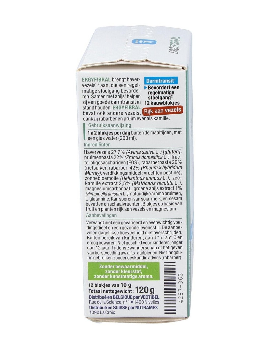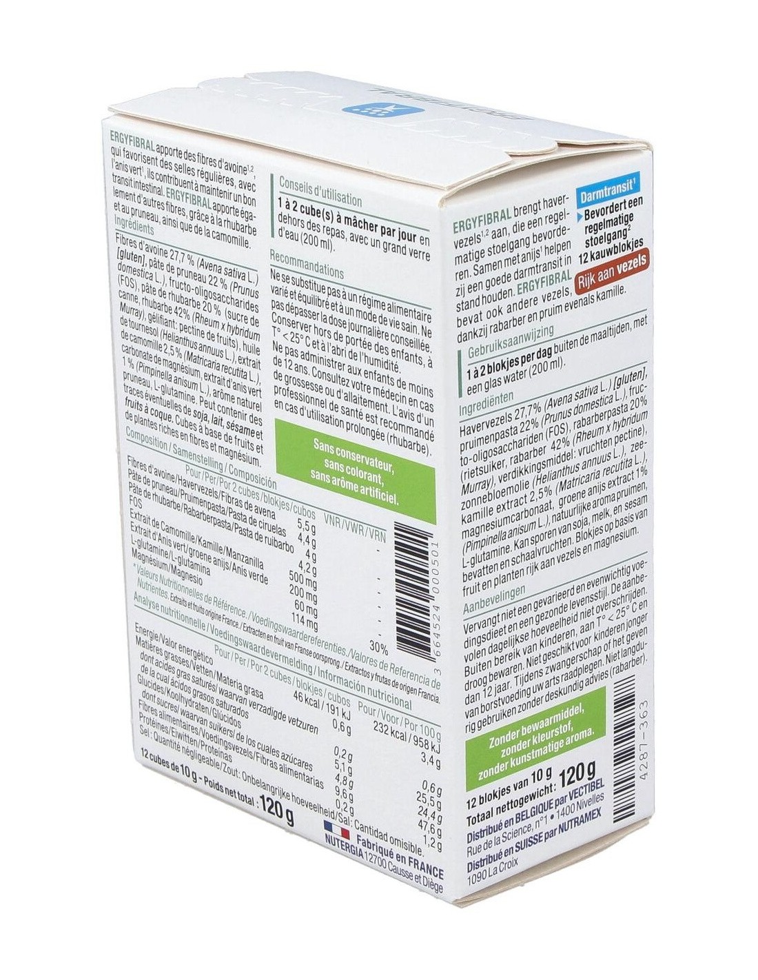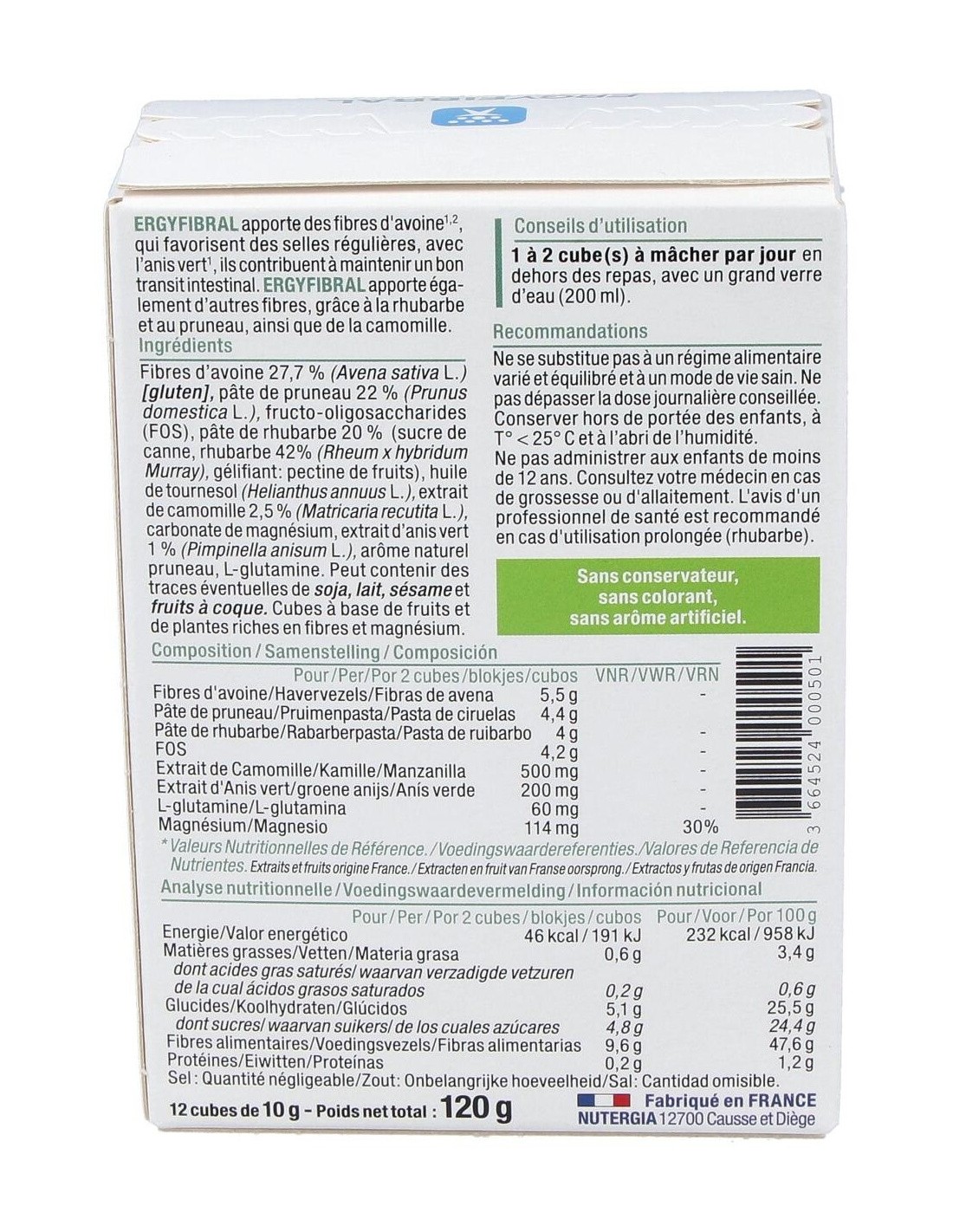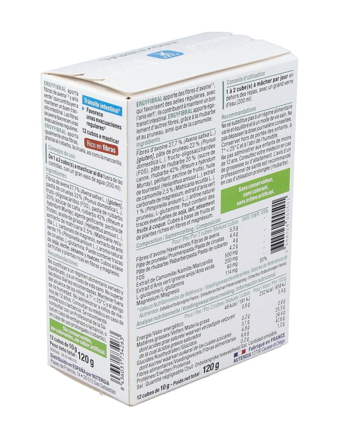 Producto rico en fibras, Ergyfibral Masticable aporta entre otros, fibras de avena que contribuyen a aumentar el volumen de las heces así como ruibarb