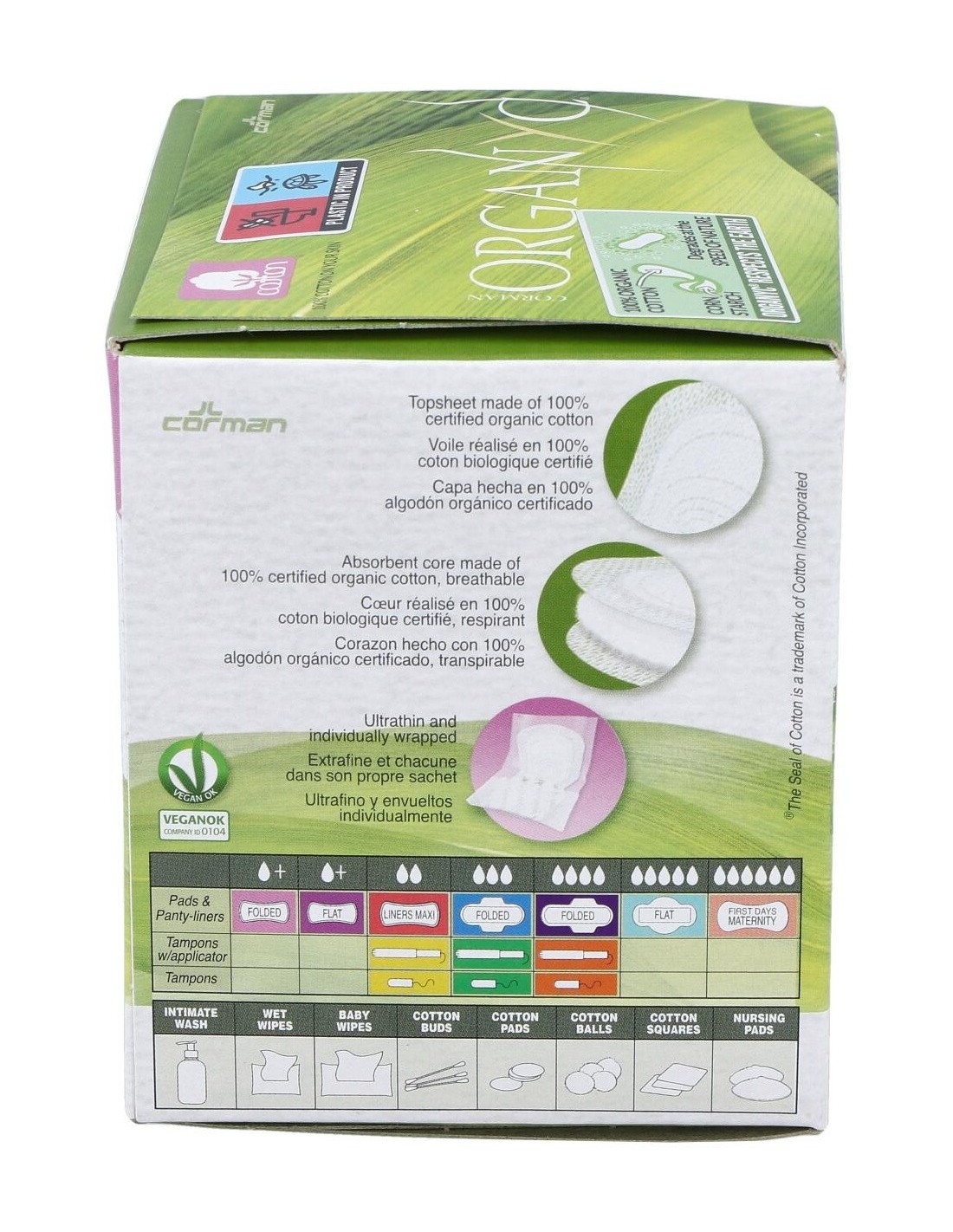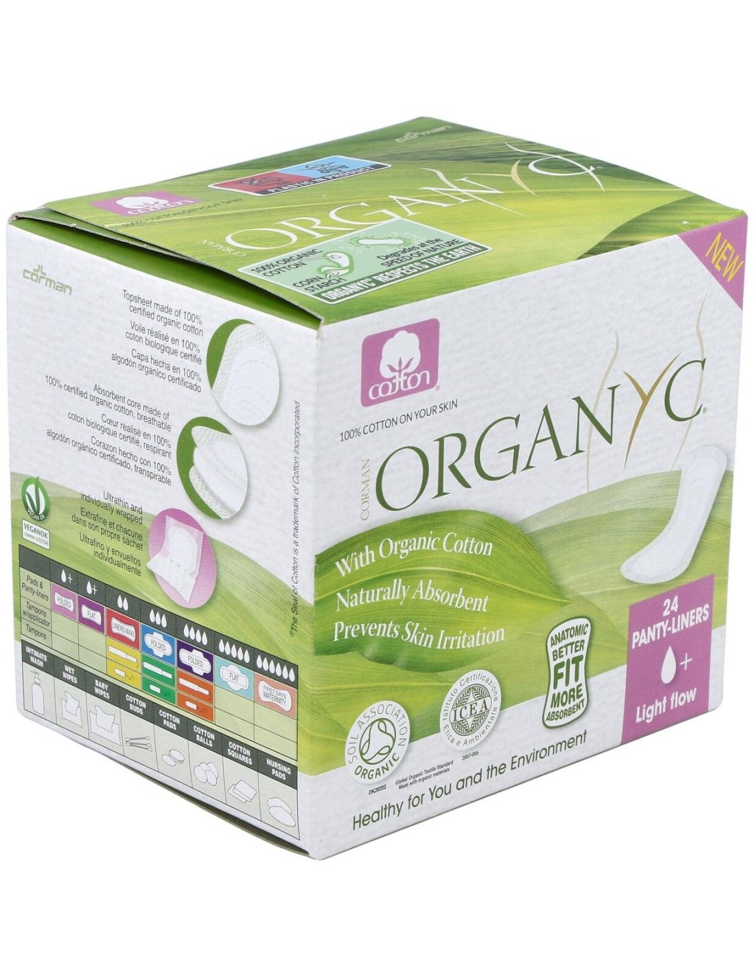 Con una capa superior de algodón orgánico certificado 100% y un núcleo de algodón orgánico altamente absorbente. Los salva slip de algodón orgánico plegados Light Flow son hipoalergénicos y naturalmente transpirables. Doblados individualmente y envueltos en una bolsa Mater-bi biodegradable. Certificados como orgánicos por ICEA, veganos certificado por VEGANOK. Libre de crueldad.
