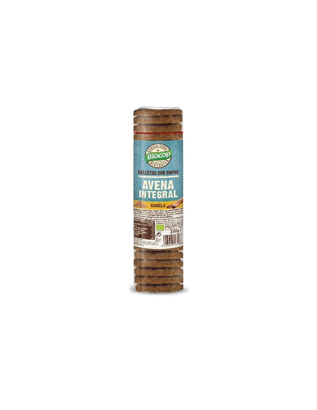 Ingredientes:Harina de Trigo integral* 32%, copos Avena integral* 32%, aceite de girasol*, azúcar de cañal*, Jarabe glucosa de maíz*, canela en polvo* 1%, gasificantes (Bicarbonato de amonio, bicarbonato sódico), sal, extracto natural de oliva, aroma natural de vainilla. (*) De cultivo ecológico.Valor nutricional por 100 gramos: