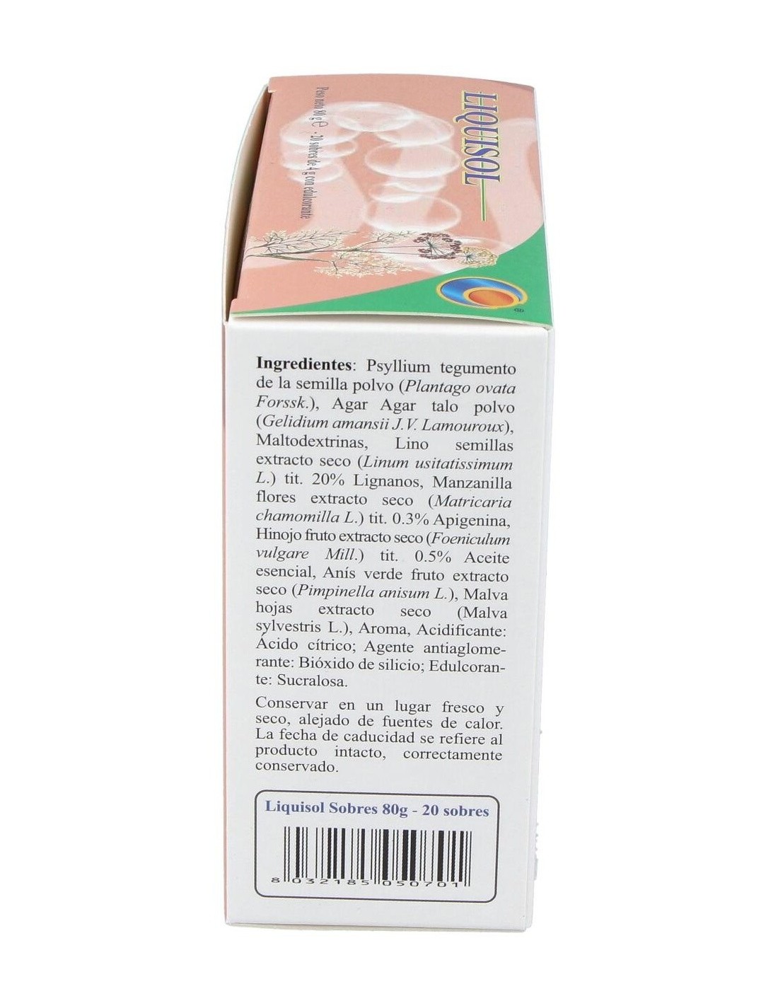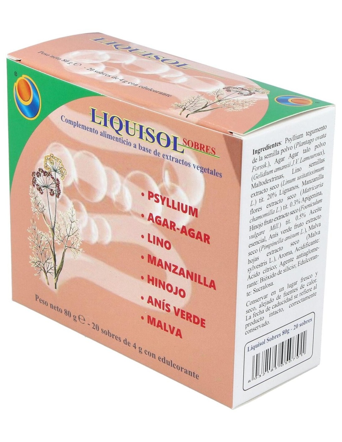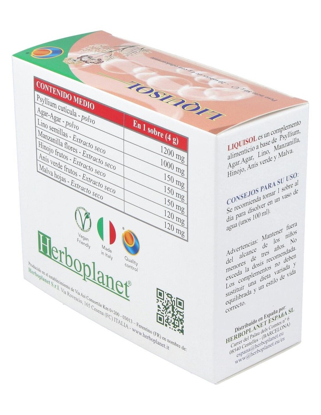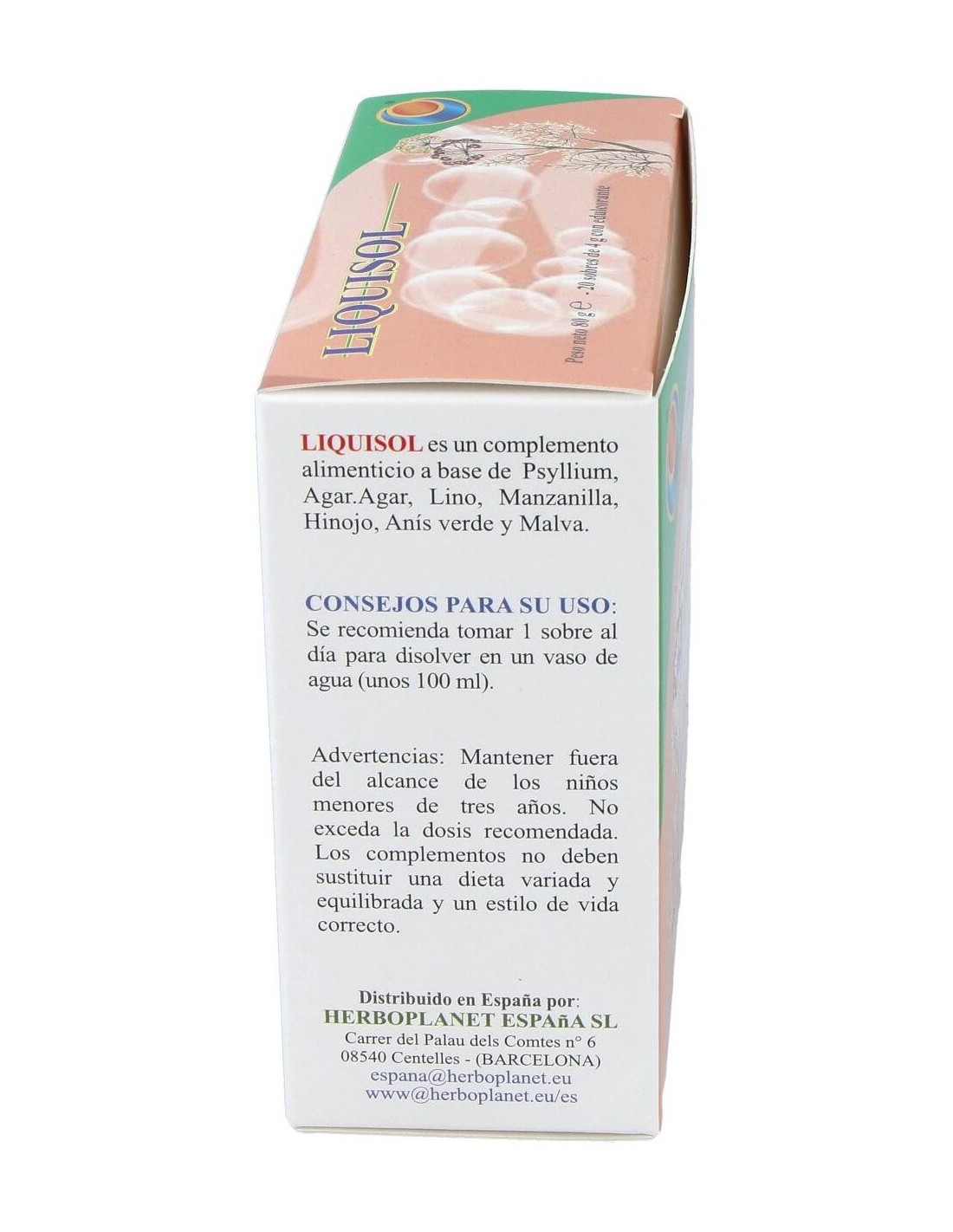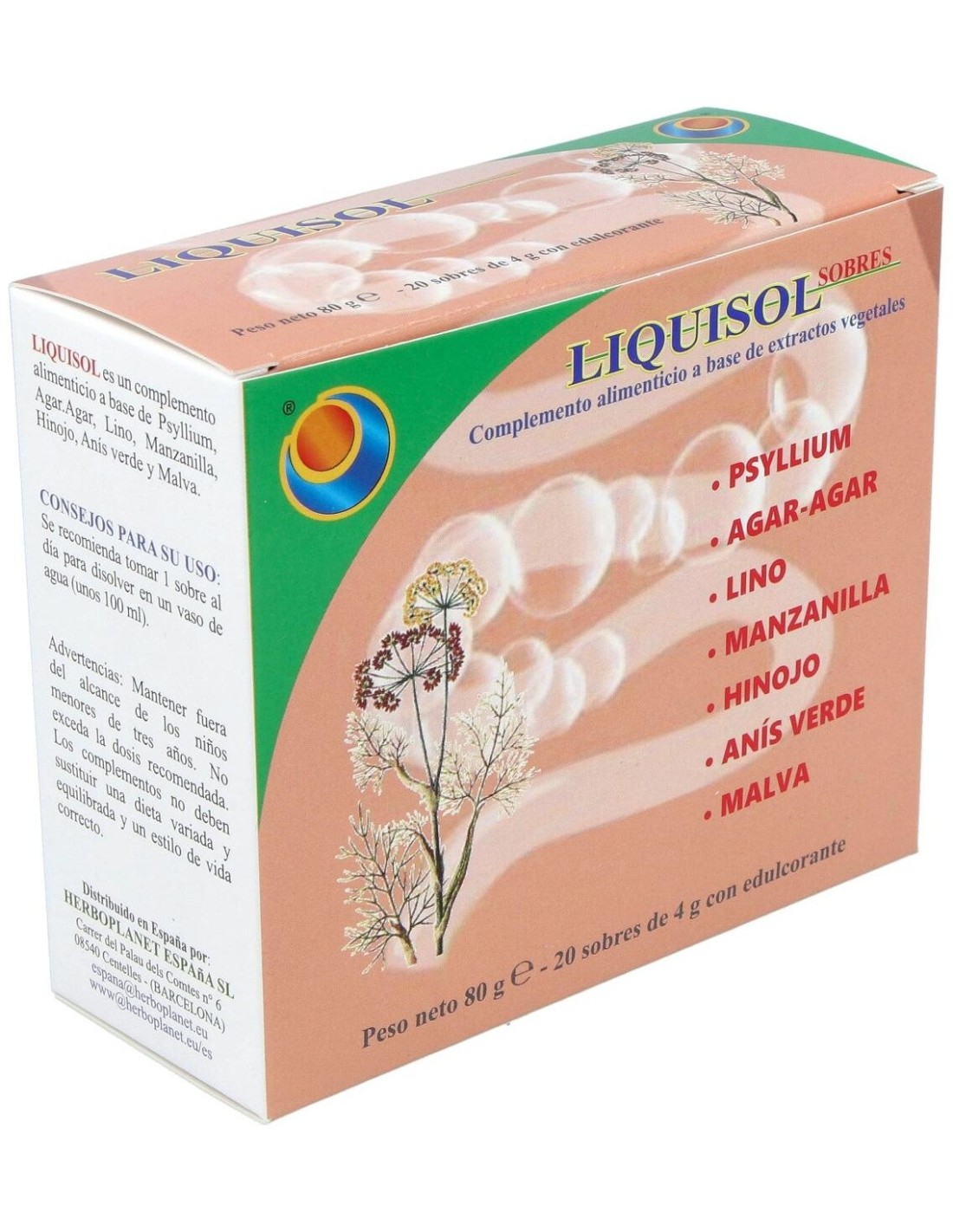 Liquisol es un complemento alimenticio a base de extractos de plantas con un efecto prebiótico. Contribuye al volumen normal y la consistencia de las heces, a la regularidad del tránsito intestinal, a la acción emoliente y suavizante: el funcionamiento regular del sistema digestivo, a la motilidad gastrointestinal regular y a la eliminación de gases y a la función digestiva.Liquisol de Herboplanet es un complemento alimenticio que limpia los divertículos, estreñimiento de los colíticos, meteorismo, disbiosis. Regulador intestinal.Ingredientes por sobre:Psyllium cutícula polvo (Plantago ovata Forsk.) 1,2 g, Agar-Agar (Gelidium amansii J.V. Lamouroux) talo polvo 1 g. Maltodextrinas. Lino (Linum usitatissimum L.) semillas extracto seco titulado al 20% en Lignanos 150 mg, Manzanilla (Matricaria chamomilla L.) flores extracto seco titulado al 0.3% en Apigenina 150 mg, Hinojo (Foeniculum vulgare Mill.) frutos extracto seco titulado al 0.5% en Aceite esencial, 150 mg, Anís verde frutos (Pimpinella anisum L.) extracto seco 120 mg, Malva (Malva sylvestris L.) hojas extracto seco 120 mg. Aroma, Acidificante: Ácido cítrico; Agente antiaglomerante: Bióxido de silicio; Edulcorante: Sucralosa.Modo de empleo:Tomar 1 sobre al día para disolverlo en un vaso de agua (alrededor de 100 ml).Presentación:Envase de 20 sobres de 4 gramos.