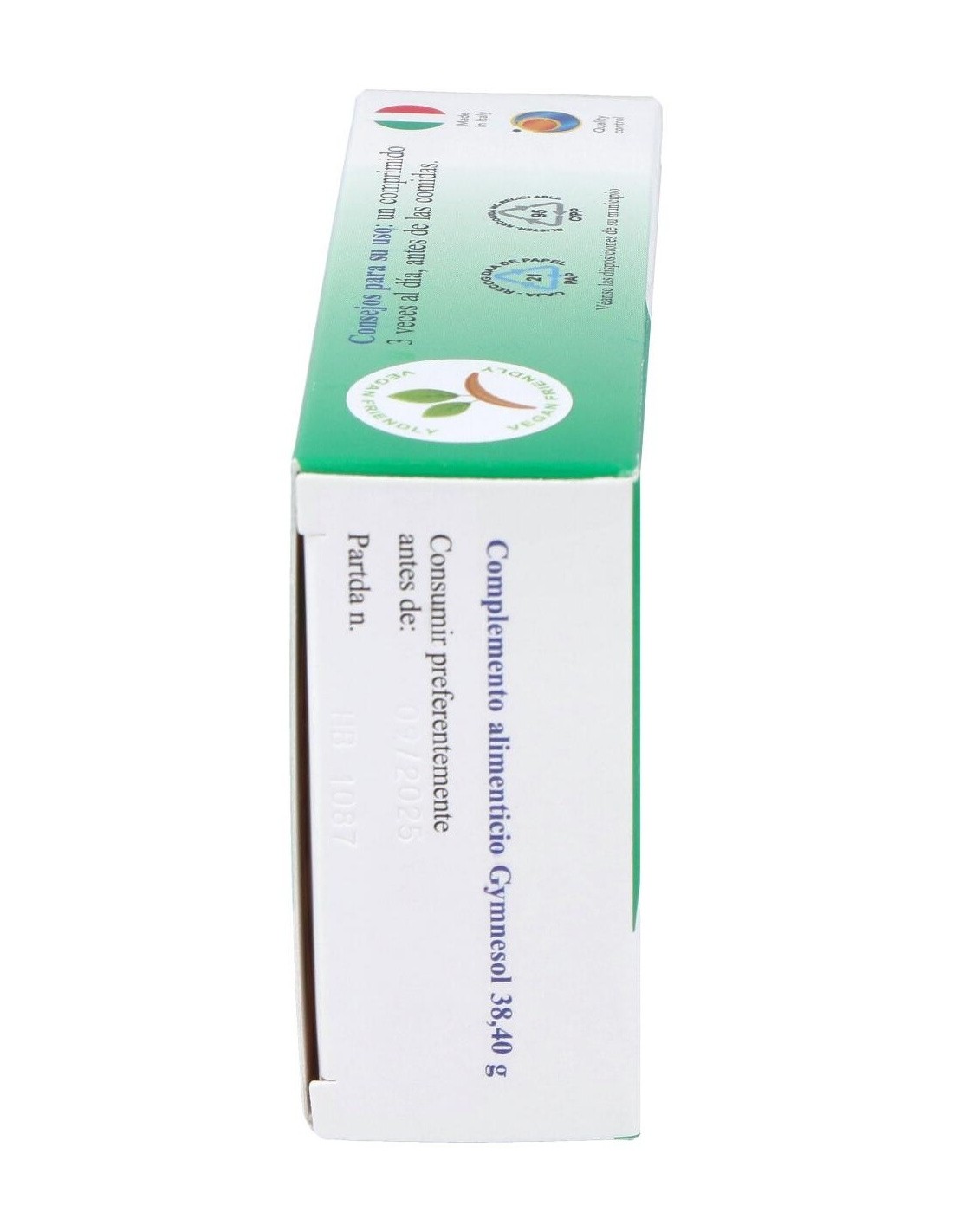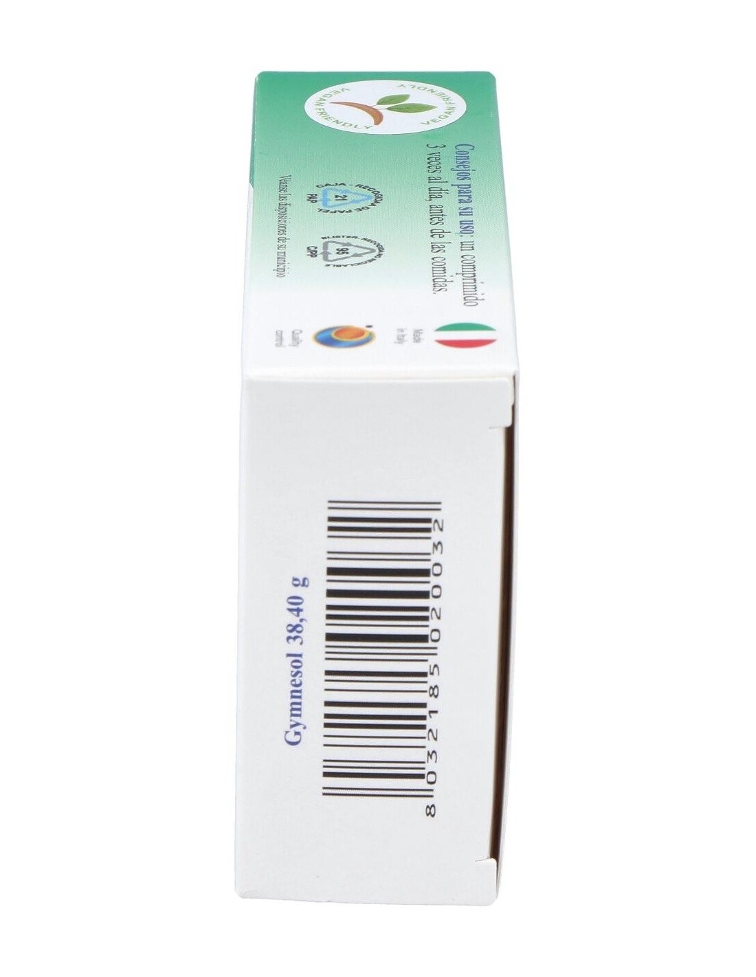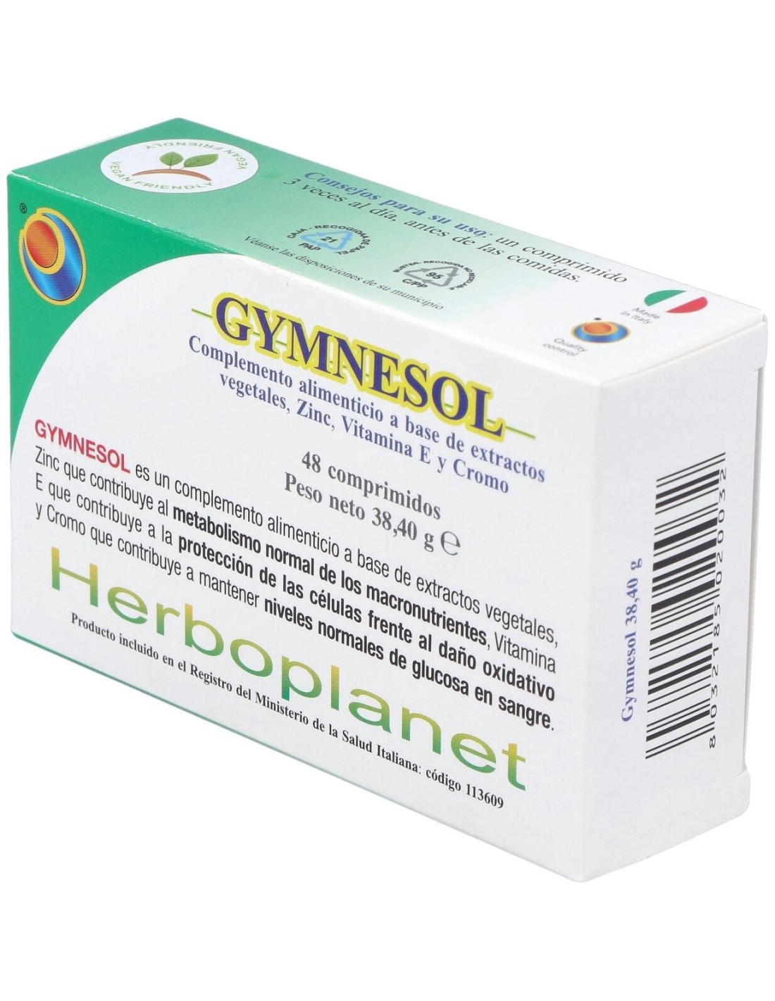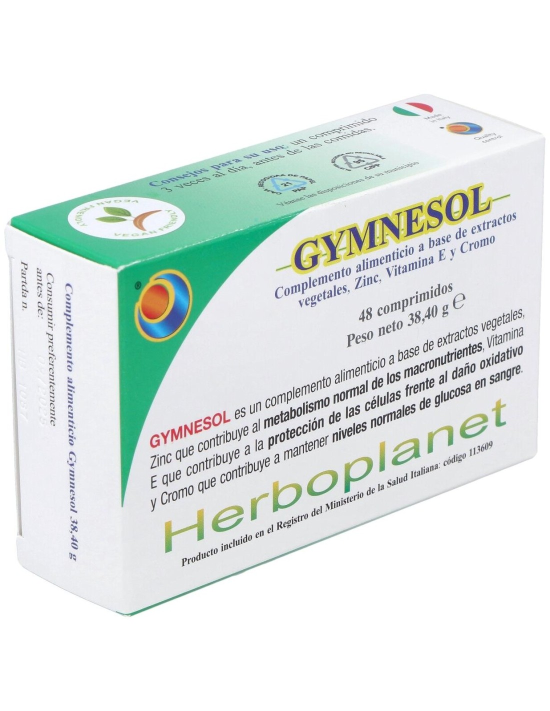 Ingredientes por 3 comprimidos:Extracto seco de Gymnema (Gymnema sylvestre R. Br.) hojas 840 mg (aporte en Ácido gymnémico 210 mg). Agentes de carga: celulosa microcristalina, fosfato de calcio. Extracto seco de Arándano (Vaccinium myrtillus L.) frutos 360 mg (aporte en mirtilina 3,6 mg), Citrato de Zinc dihidratado 39 mg (aporte en Zinc 12,5 mg = 125% VNR). Antiaglomerantes: sales de magnesio de los ácidos grasos, dióxido de silicio. Vitamina E acetato 19,8 mg (aporte en Vitamine E 9,9 mg - 82,5% CDR), Picolinato de Cromo 1,5 mg (aporte en Cromo 180 µg = 450% CDR).Modo de empleo:Tomar 1-2 comprimidos 3 veces al día antes de las comidas.Presentación:Envase de 24 comprimidos.