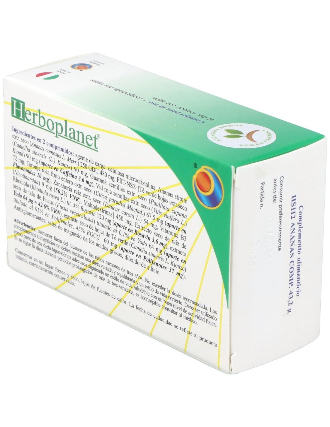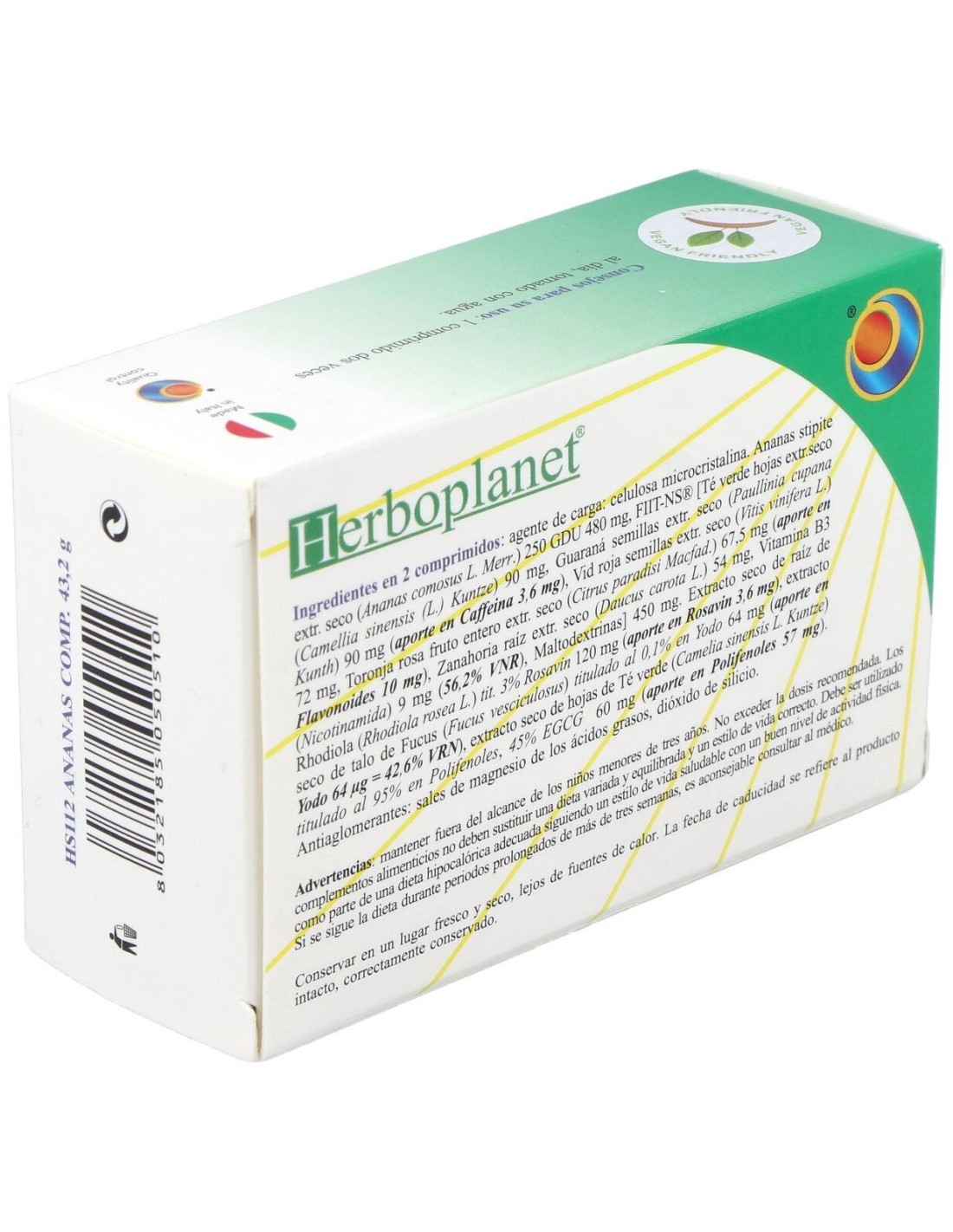Ingredientes por 6 comprimidos:Agente de carga: celulosa microcristalina. Ananas stipite estr. sec. (Ananas comosus L. Merr.) 250 GDU 480 mg, FIIT-NS® [Tè verde foglie estr.sec. (Camellia sinensis (L.) Kuntze) 90 mg, Guaranà semi estr.sec. (Paullinia cupana Kunth) 90 mg (app. in Caffeina 3,6 mg), Vid roja semillas estr.sec. (Vitis vinifera L.) 72 mg, Pompelmo rosa frutto intero estr.sec. (Citrus paradisi Macfad.) 67,5 mg (app. in Flavonoidi 10 mg), Zanahoria raíz estr.sec. (Daucus carota L.) 54 mg, Vitamina B3 (Nicotinamide) 9 mg (56,2% VNR), Maltodestrine] 450 mg. Extracto seco de raíz de Rhodiola (Rhodiola rosea) titulado al 3% en Rosavin 120 mg (aporte en. Rosavin 3,6 mg), extracto seco de talo de Fucus (Fucus vesciculosus) titulado al 0,1% en Yodo 64 mg (aporte en Yodo 64 µg igual a 42,6% VRN), extracto seco de hojas de Té verde (Camelia sinensis L. Kuntze) titulado al 95% en Polifenoles, 45% EGCG 60 mg (aporte en Polifenoles 57 mg). Antiaglomerantes: sales de magnesio de los ácidos grasos, dióxido de silicio.Modo de empleo:Tomar 1 comprimido 2 veces al día, media hora antes de las comidas.Presentación:Envase de 48 comprimidos.