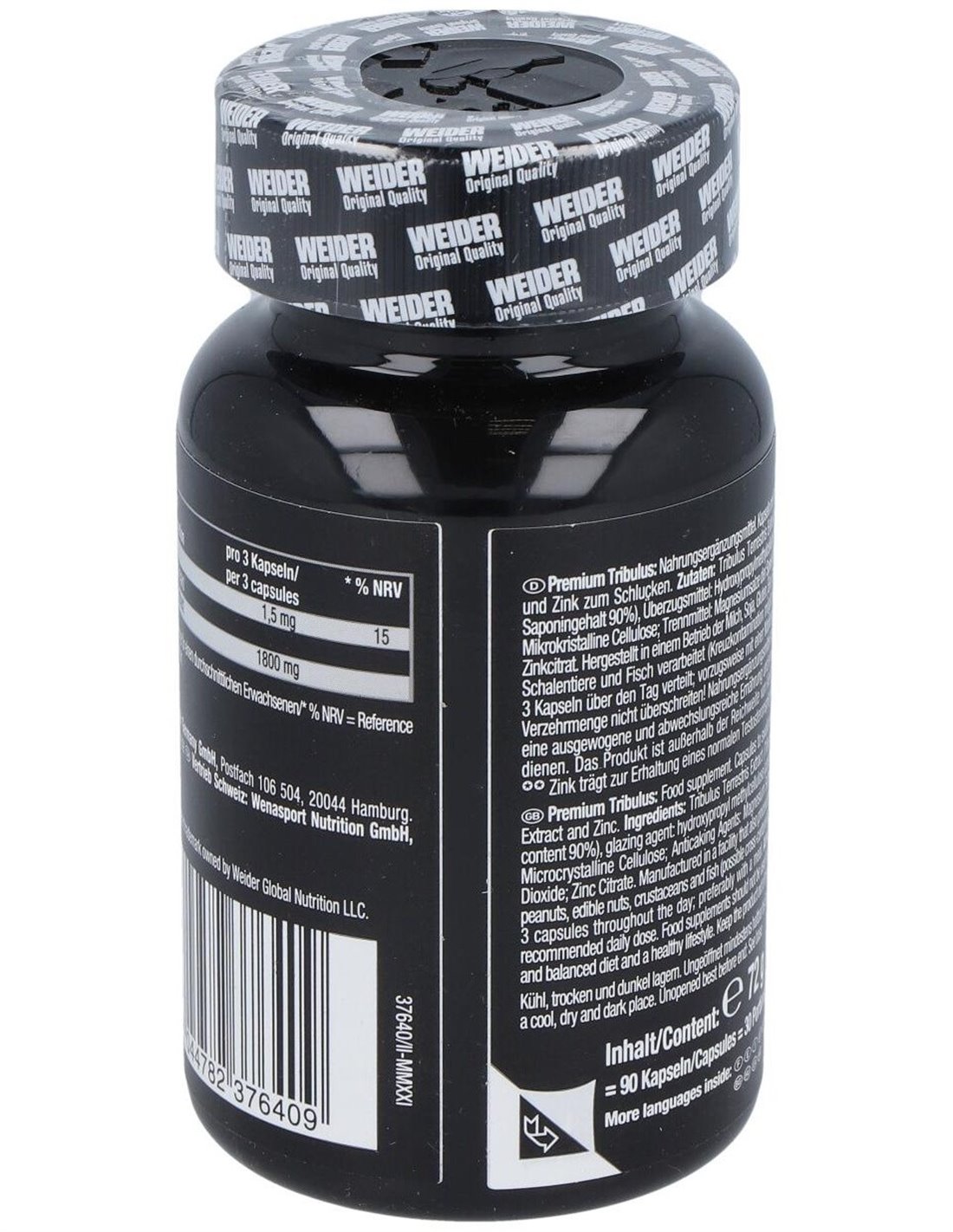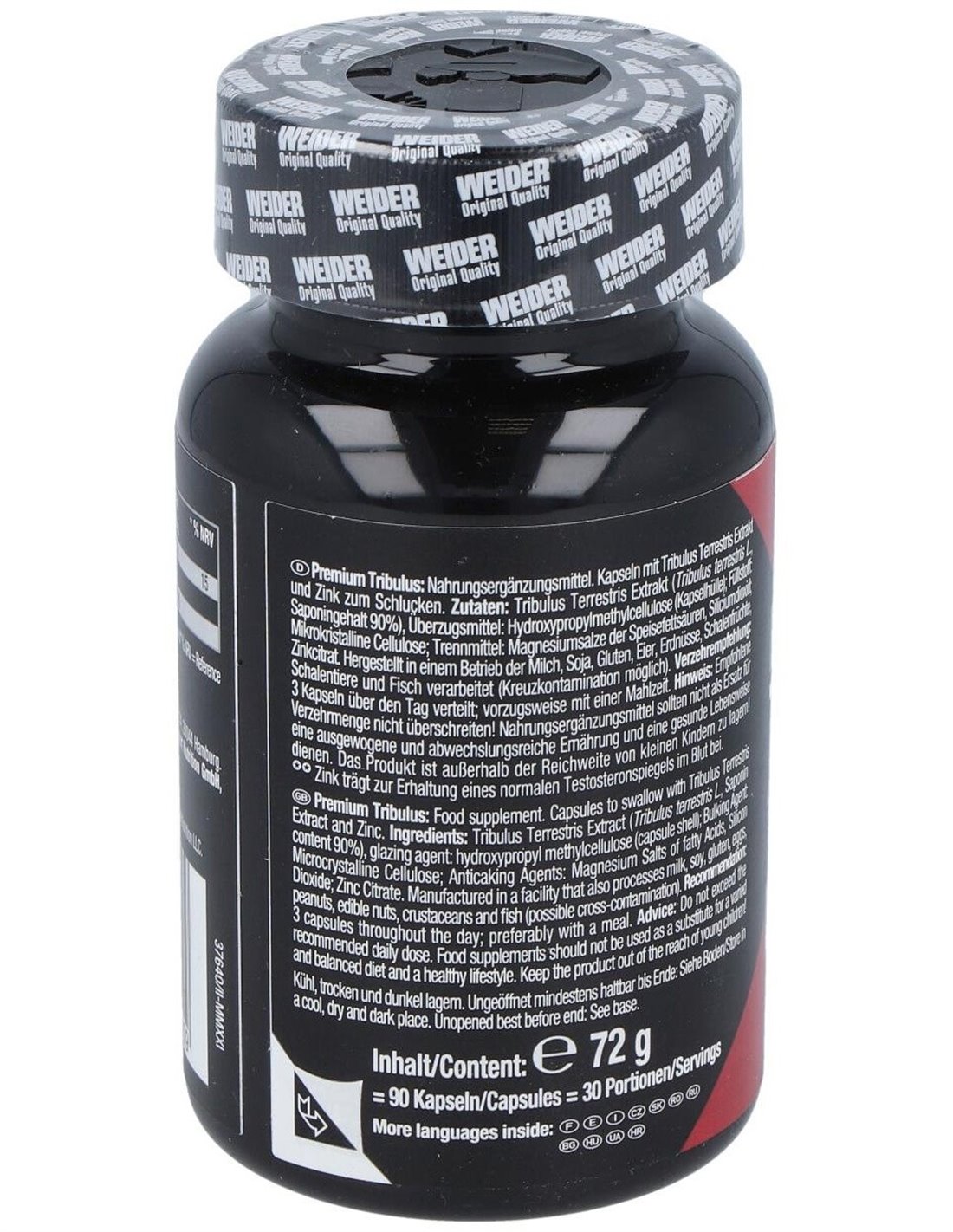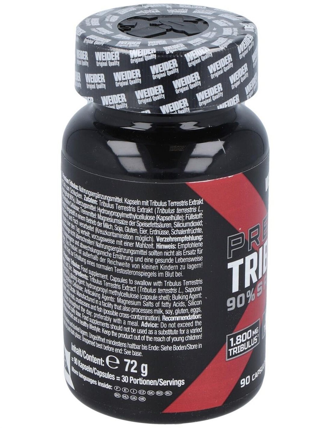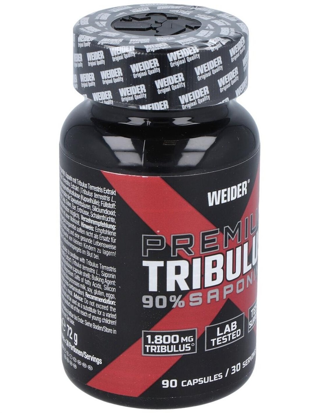 Extracto de Tribulus Terrestris (Tribulus terrestris L., 90% saponinas), agente de recubrimiento: hidroxipropilmetilcelulosa (cápsula): agente de carga: celulosa microcristalina: antiglomerantes: sales magnésicas de ácidos grasos, dióxido de silicio: citrato de zinc.