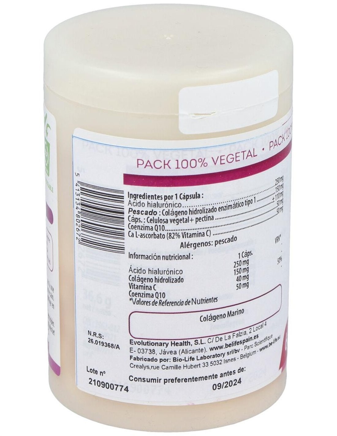 Suplemento a base de colágeno marino obtenido por hidrólisis enzimática y ácido hialurónico, útil para el normal mantenimiento de la piel. El ácido hialurónico y el colágeno de tipo 1 no desnaturalizado, junto con la coenzima Q10, contribuyen a una normal estructura fibrosa del tejido. La Co-Q10 Ubiquinona actúa como cofactor en la producción de energía mitocondria, lo cual puede ayudar a las pieles cansadas y contribuir a reducir el estrés oxidativo. La fórmula se completa con vitamina C, que ayuda a la formación normal de colágeno para el normal mantenimiento de la piel.