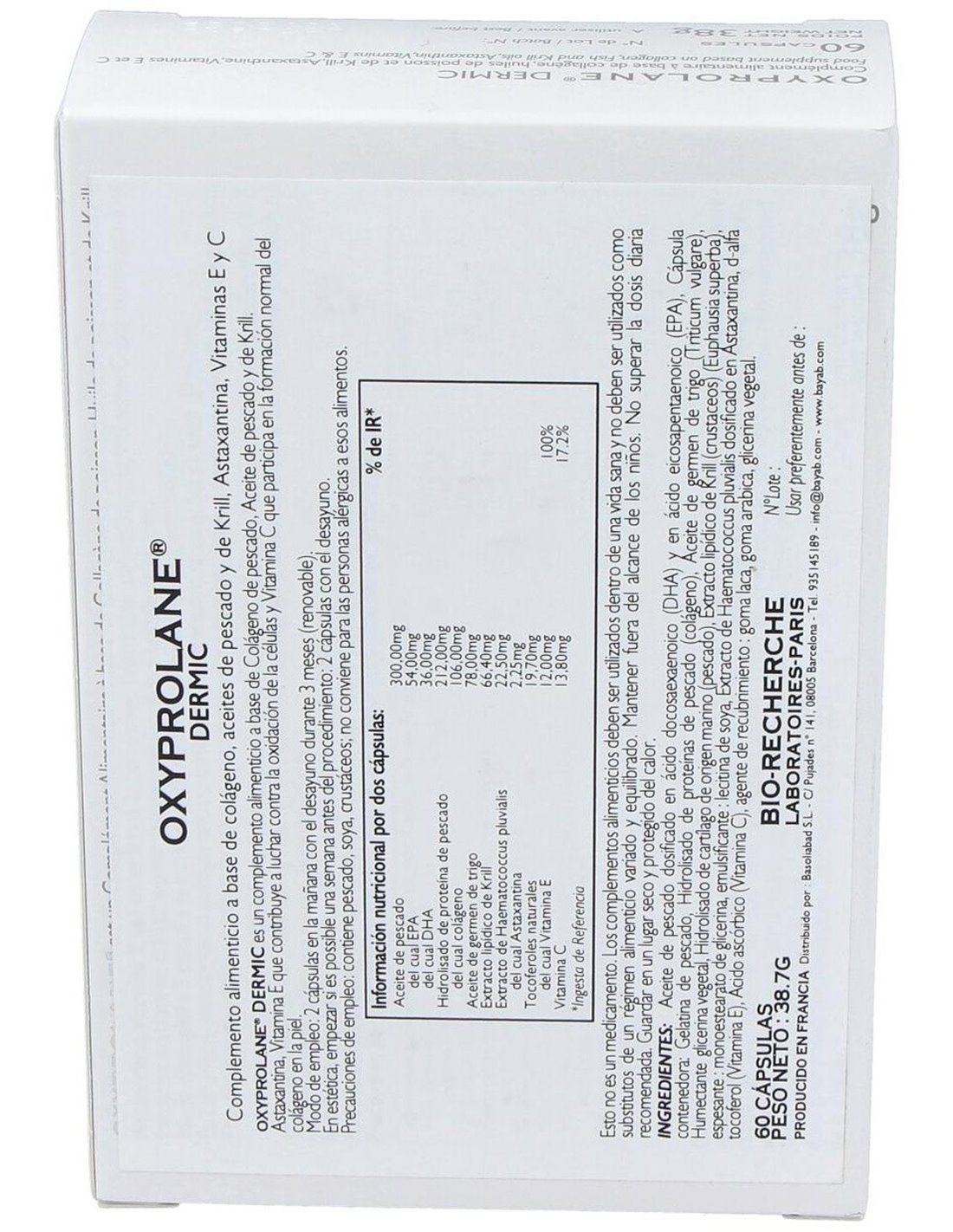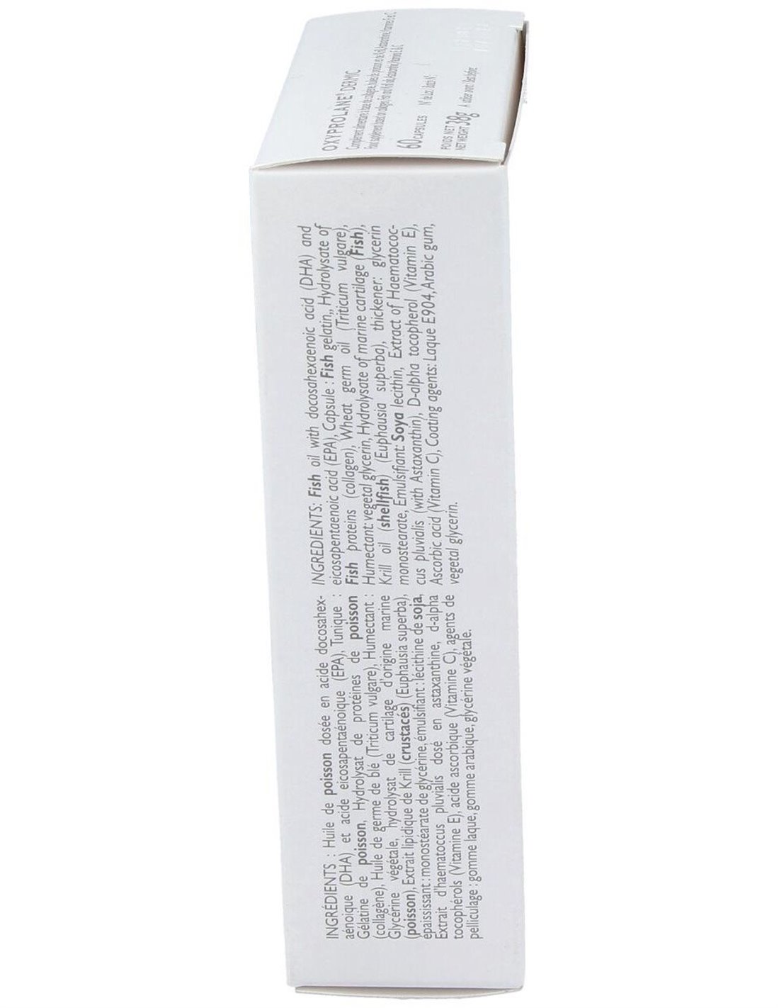 Aceite de pescado dosificado en ácido docosaexaenoico (DHA) y en ácido eicosapentaenoico (EPA), Cápsula contenedora: Gelatina de pescado, Hidrolisado de proteínas de pescado (colágeno), Aceite de germen de trigo (Triticum vulgare), Humectante glicerina vegetal, Hidrolisado de cartílago de origen marino (pescado), Extracto lipídico de Krill (crustaceos) (Euphausia superba), espesante : monoestearato de glicerina, emulsificante : lecitina de soya, Extracto de Haematococcus pluvialis dosificado en Astaxantina, d-alfa tocoferol (Vitamina E), Ácido ascórbico (Vitamina C), agente de recubrimiento : goma laca, goma arabica, glicerina vegetal.