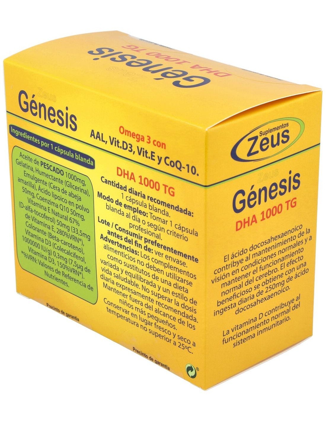 El DHA contribuye al mantenimiento de la visión, cerebro y sistema cardiovascular en condiciones normales, entre otras funciones. El cuerpo humano no puede producir DHA por sí solo, por lo que podemos obtenerlo a través de fuentes externas. Por eso, Genesis DHA 1000 tg ofrece al menos un 80% de DHA concentrado y de la máxima pureza, sin tóxicos. Los ácidos grasos como el DHA son muy importantes. Este ácido graso poliinsaturado de larga cadena, es fundamental para el cerebro y el sistema cardiovascular, y es el tipo de ácido graso predominante en el ojo humano. El producto es una nueva opción de DHA de máxima pureza, en forma de triglicérido en cápsulas rojas naturales de betacaroteno.El triglicérido es el mejor medio de transporte del DHA en el cuerpo y es la forma natural de transportar los omega 3.