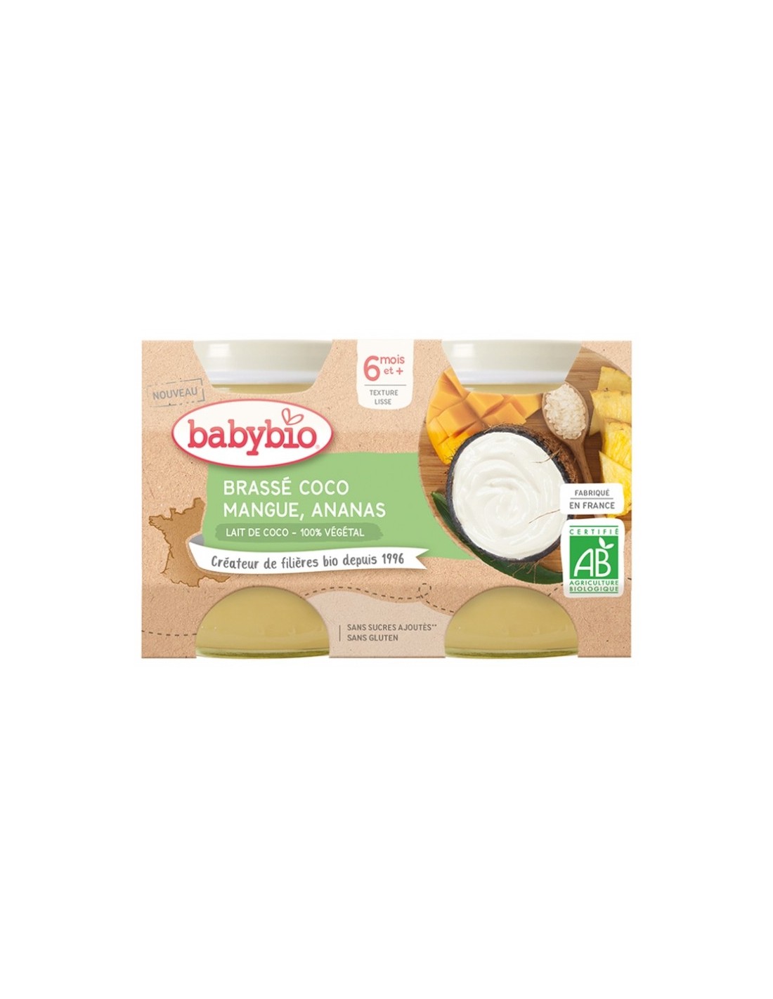 Babybio Cerveza Vegetal Ecológica de Coco, Mango y Piña 6 Meses y + 2 Botes de 130 g es una infusión de textura suave elaborada con leche de coco, mangos, manzanas de Nueva Aquitania y arroz de Camargo.
