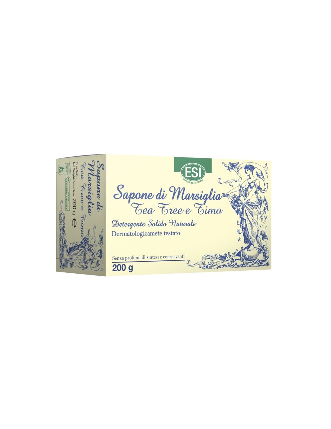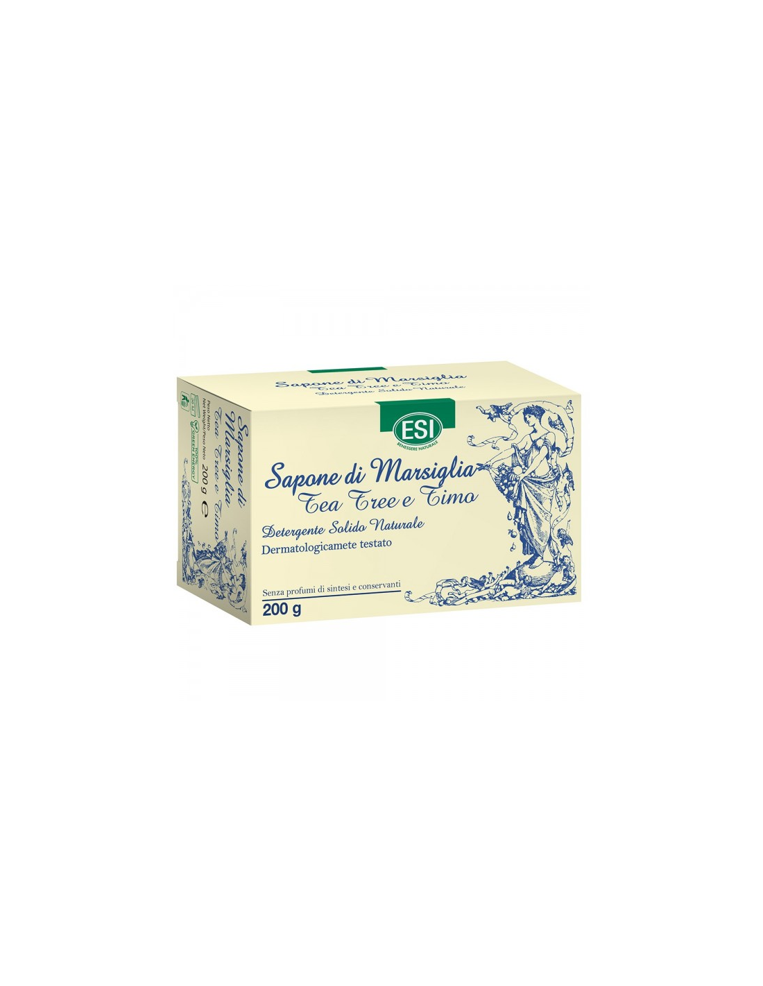 Jabón Sólido de Marsella con Árbol de Té y Tomillo de ESI es un producto suave, enriquecido con aceite de oliva y aceites esenciales de Tomillo y Árbol de Té. Producto natural, ideal para el uso diario de toda la familia. Los aceites esenciales de árbol de té y tomillo se utilizan tradicionalmente por su acción antimicrobiana.El jabón de Marsella limpia la piel y la hidrata en profundidad, dándole elasticidad y suavidad. El aceite de oliva es rico en nutrientes útiles para la piel y capaces de mantenerla hidratada.Ingredientes (INCI):Sodium Palmate, Sodium Palm Kernelate, Aqua, Glycerin, Olea Europaea Oil Unsaponifiables, Thymus Vulgaris Flower/Leaf Oil, Melaleuca Alternifolia Leaf Oil, Sodium Chloride, Tetrasodium Etidronate, Linalool.Modo de empleo:Ideal para uso diario.Presentación:Envase de 200 gramos.Recomendaciones y advertencias:No contiene perfumes sintéticos, conservantes, colorantes y SLES.