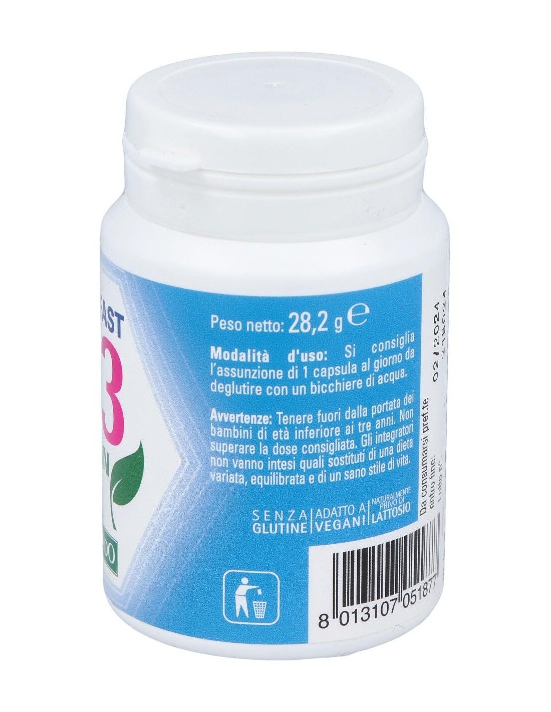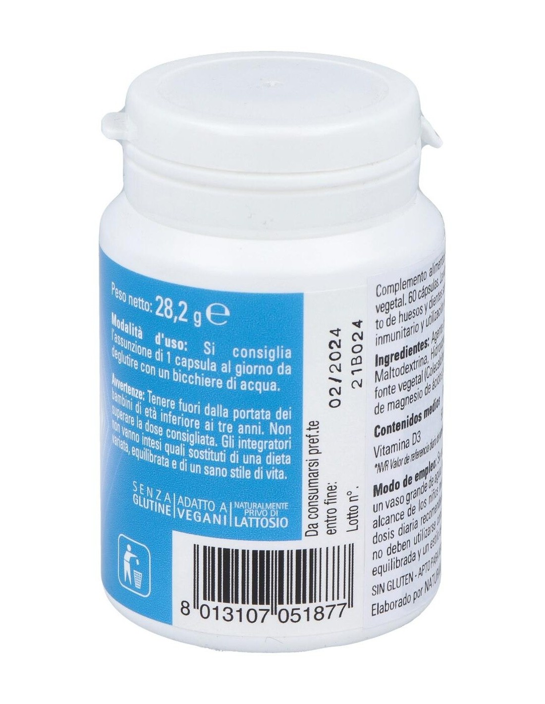 Vitamina D proveniente de fuente vegetal. La vitamina D3 contribuye al mantenimiento de huesos y dientes en condiciones normales, a la función normal del sistema inmunológico, a la absorción y utilización normales de calcio y fósforo y al mantenimiento de la función muscular normal. Producto vegano.