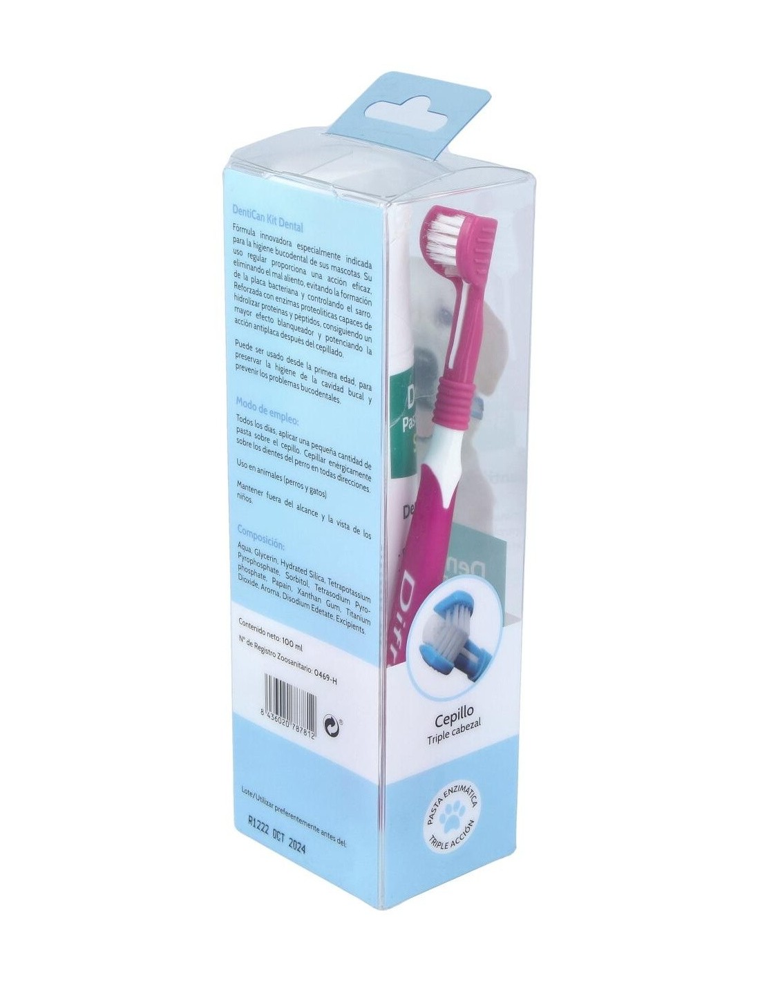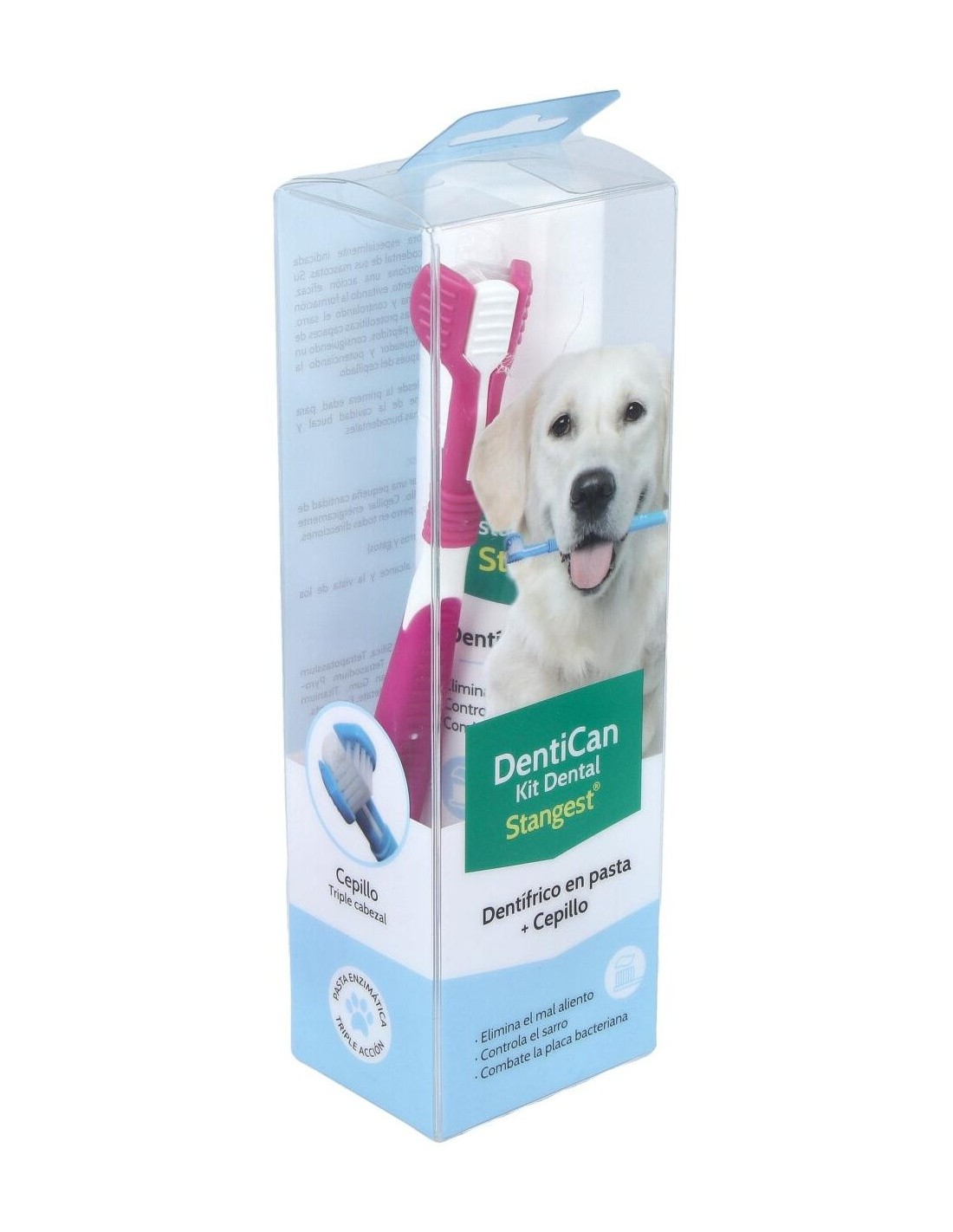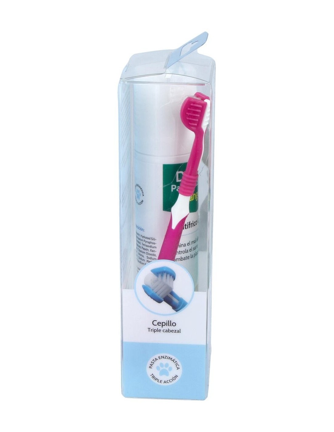 Incluye una pasta enzimática y un cepillo con triple cabezal, constituyendo un cuidado integral para la salud dental del perro.