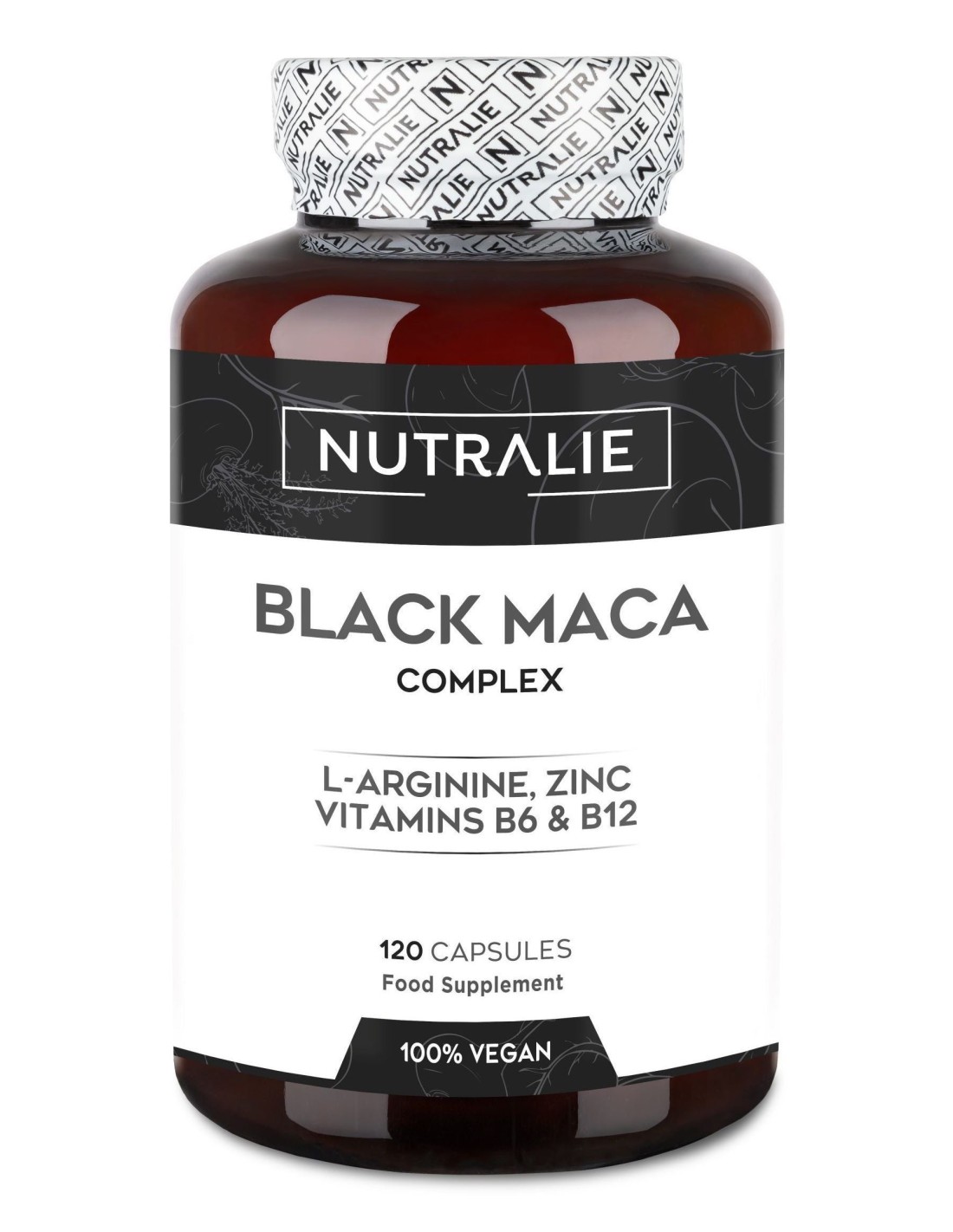 Ingredientes:Extracto seco de maca negra (Lepidium meyenii Walp,. raíz), L-arginina, cápsula vegetal: agente de recubrimiento (hidroxipropilmetilcelulosa), agente de carga (celulosa microcristalina), citrato de zinc, antiaglomerantes (estearato de magnesio de origen vegetal, dióxido de silicio), metilcobalamina (vitamina B12), clorhidrato de piridoxina (vitamina B6).Modo de empleo:Tomar 3 cápsulas al día con agua.Presentación:Envase de 120 cápsulas.